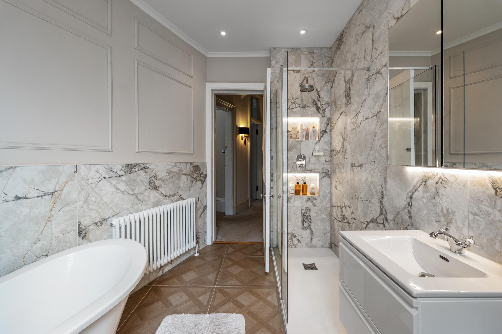 A grand internal staircase with detailed balustrade leads to first floor level revealing three generous double bedrooms, two with bay window formations, and a wonderful four-piece bathroom suite. There is a fitted cupboard at half landing and another off the first-floor landing.