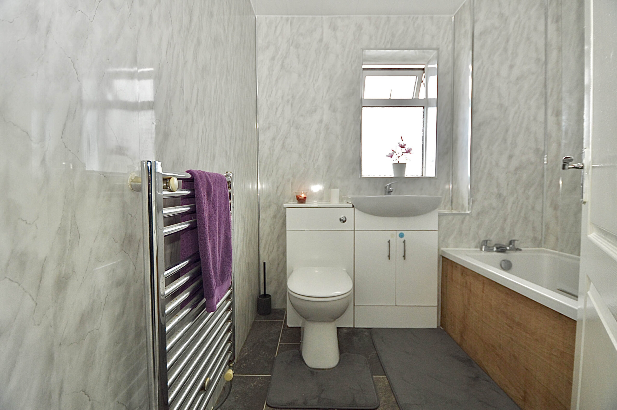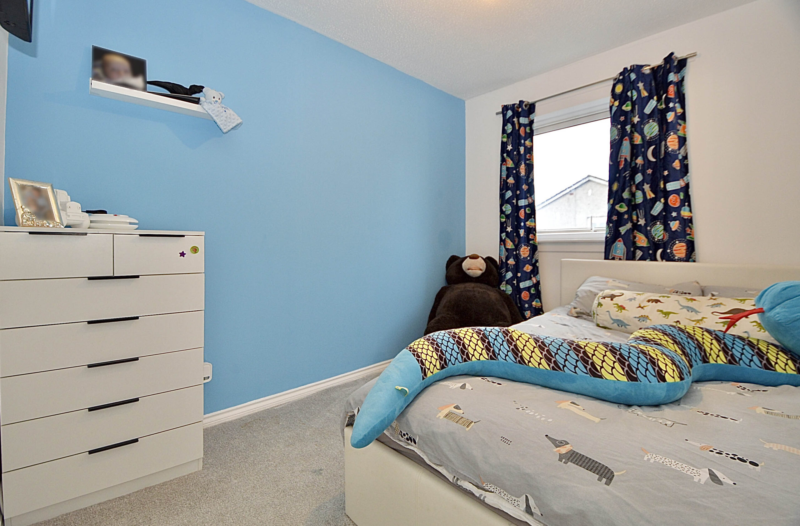 Upstairs, there are two spacious double bedrooms and a single bedroom, offering flexible accommodation to suit your family’s needs. A modern bathroom completes the upper floor, with a three-piece suite and electric shower over the bath for daily convenience. The rear garden is deliberately low maintenance but still thoughtfully designed: there’s a slabbed patio, an artificial grass area perfect for outdoor dining or play, plus two storage sheds to keep things tidy. At the front, you’ll find another low-care garden and a large driveway, making parking easy and practical.
