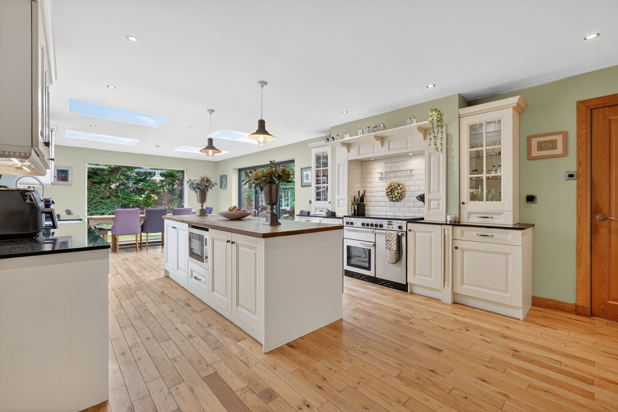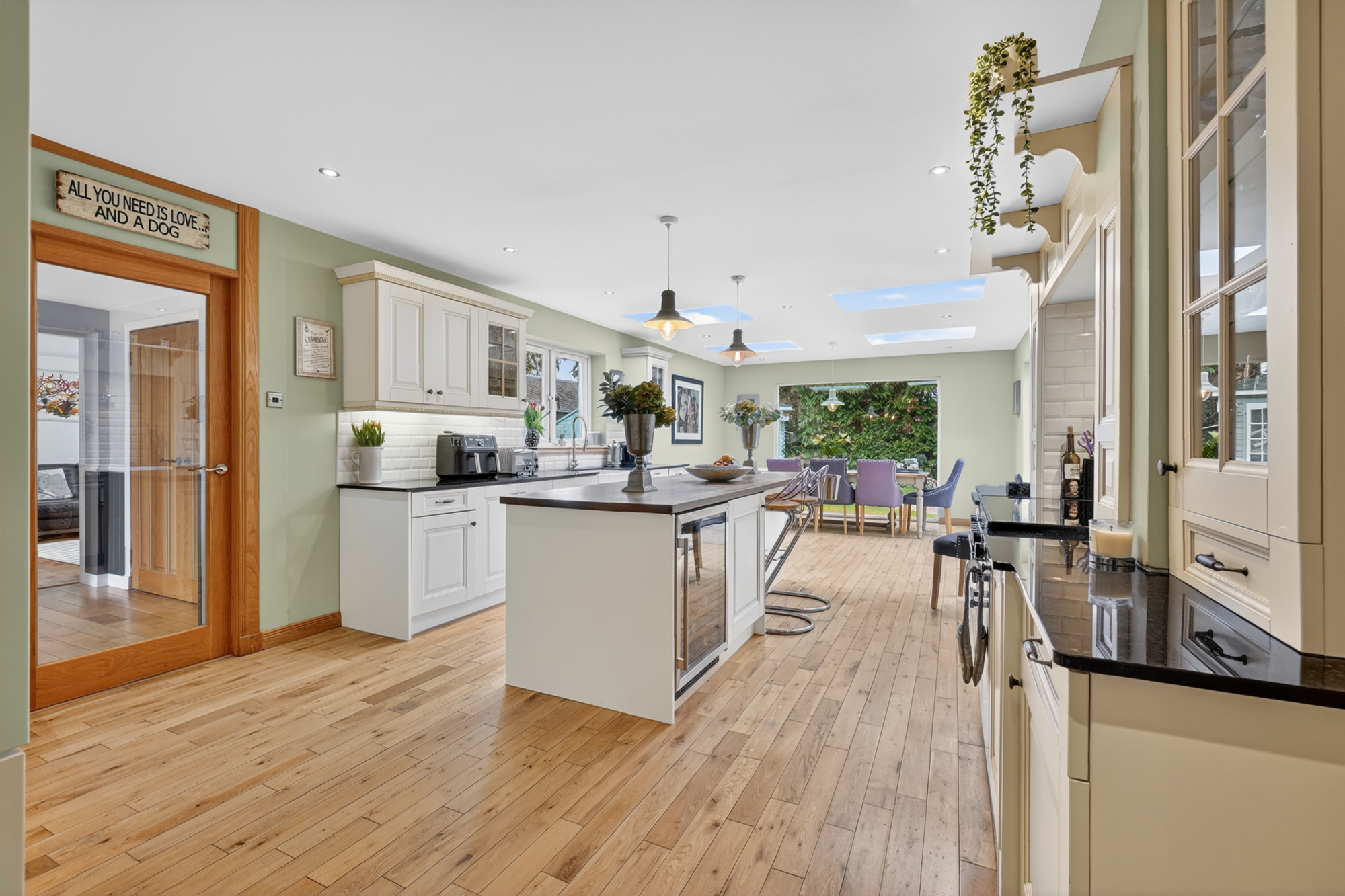 Internally the level of finish is excellent including a bespoke fitted kitchen with centre island, bi-folding doors to the garden and a combination of Granite and Butcher's block work-surfaces, luxury sanitary ware, several fireplaces and wood burning stove in the family room, quality flooring throughout, neutral decoration, panelling, gas central heating and double glazing.