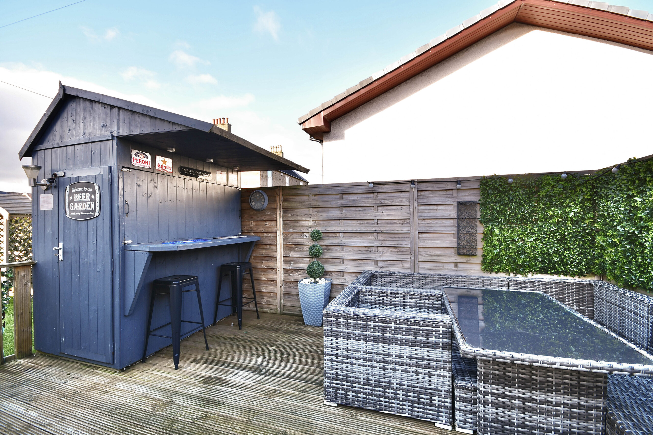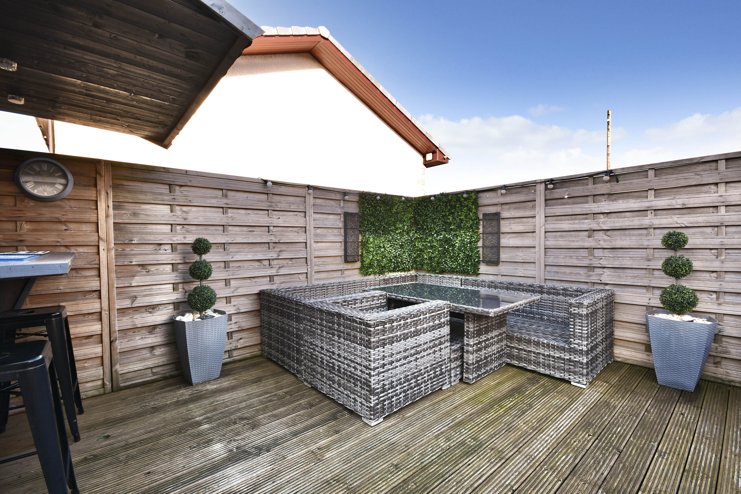Externally there is a large garden area to the front with a paved pathway and a driveway that leads along the side of the property. There is gated access at the side round to a fully enclosed rear garden that has been hard-landscaped for easy maintenance and includes artificial turf, a decked patio and an outdoor bar.