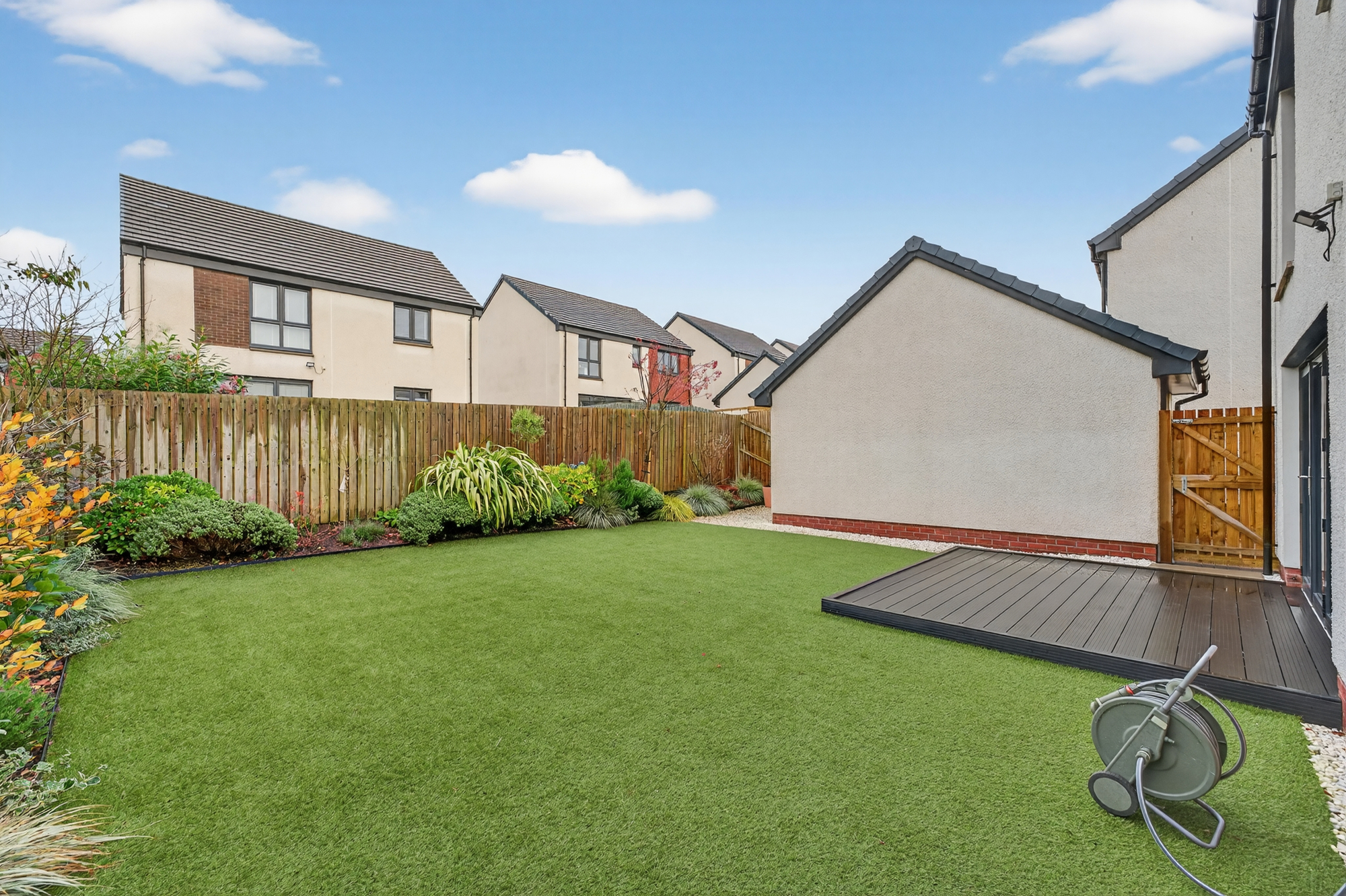 Externally the property is set within manicured gardens on a preferred plot, with articial lawn to the front, a monoblock double driveway and decorative shrubs. The driveway also leads along the side of the property to a detached garage with an up and over door. There is gated access at the side round to a fully enclosed rear garden, professionally landscaped with artificial turf, decking, a garden shed, and delightful borders with decorative aggregate and a range of specimen shrubs and trees.