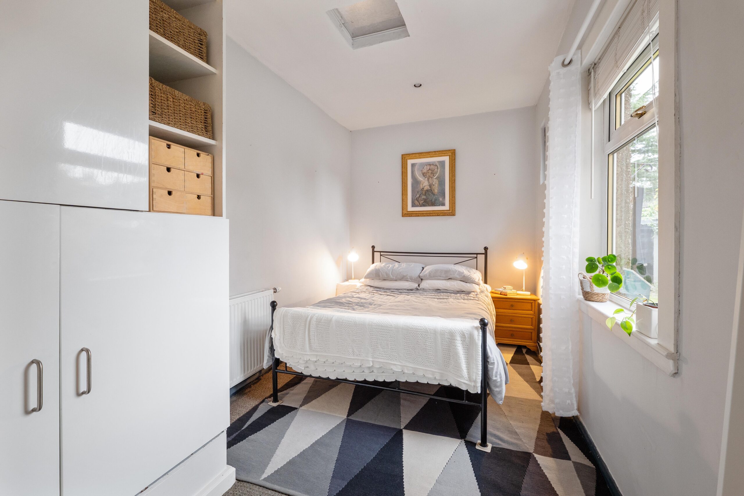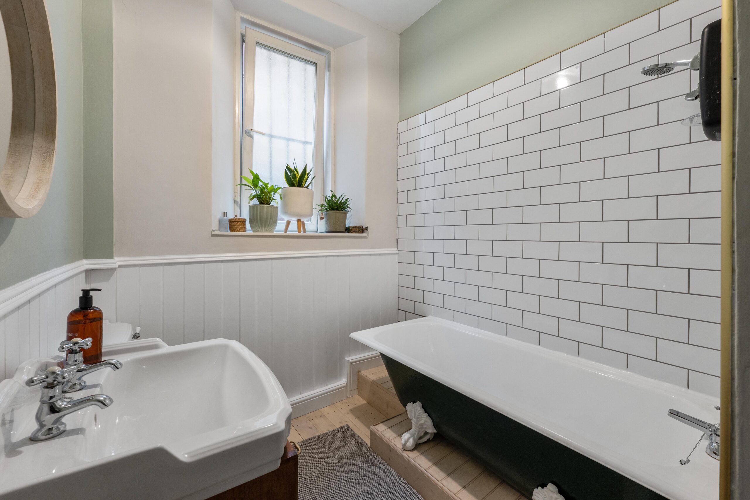 The accommodation in brief; shared vestibule via storm doors, private reception hallway with large storage cupboard adjacent and a wonderful bay windowed lounge featuring working shutters and an Eco wood burning stove. A three piece bathroom suite includes a cast iron bathtub with a shower above and a double sized bedroom is found to the rear with a decorative fire surround and a window framing the garden. A fitted dining kitchen has a convenient ceiling pulley and the following integrated items; fridge, oven, gas hob, washing machine and dishwasher. A glazed door in the kitchen leads out to the back garden whilst a further bedroom/guest room is accessed from the kitchen.