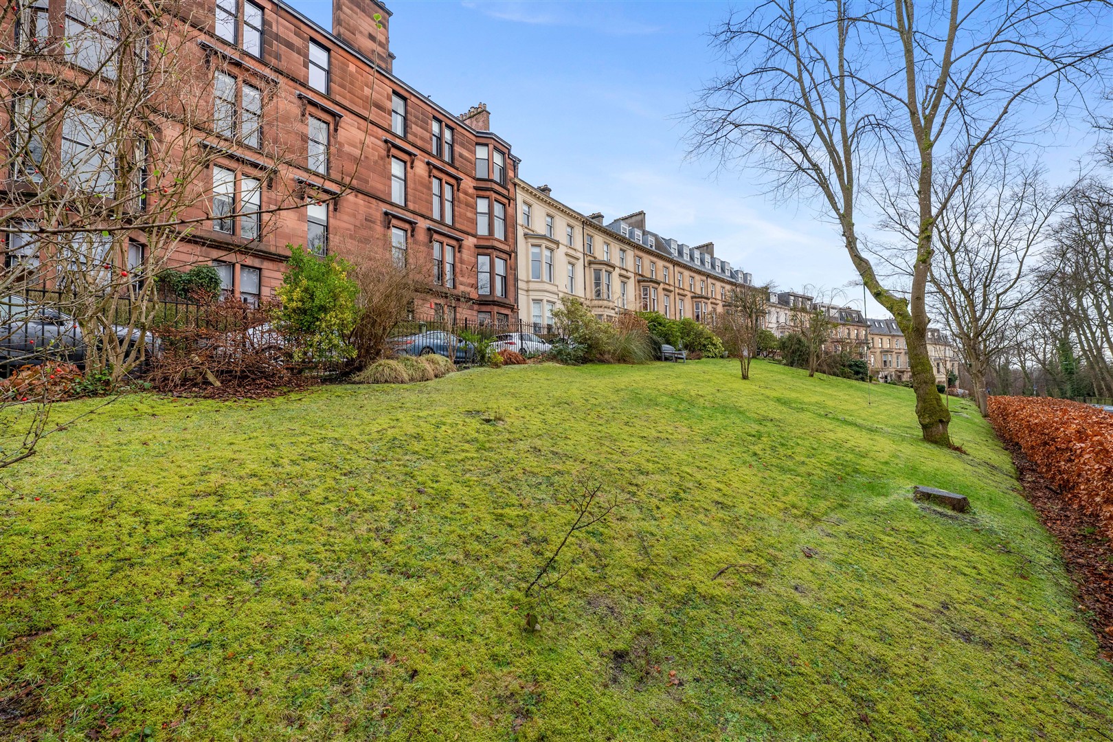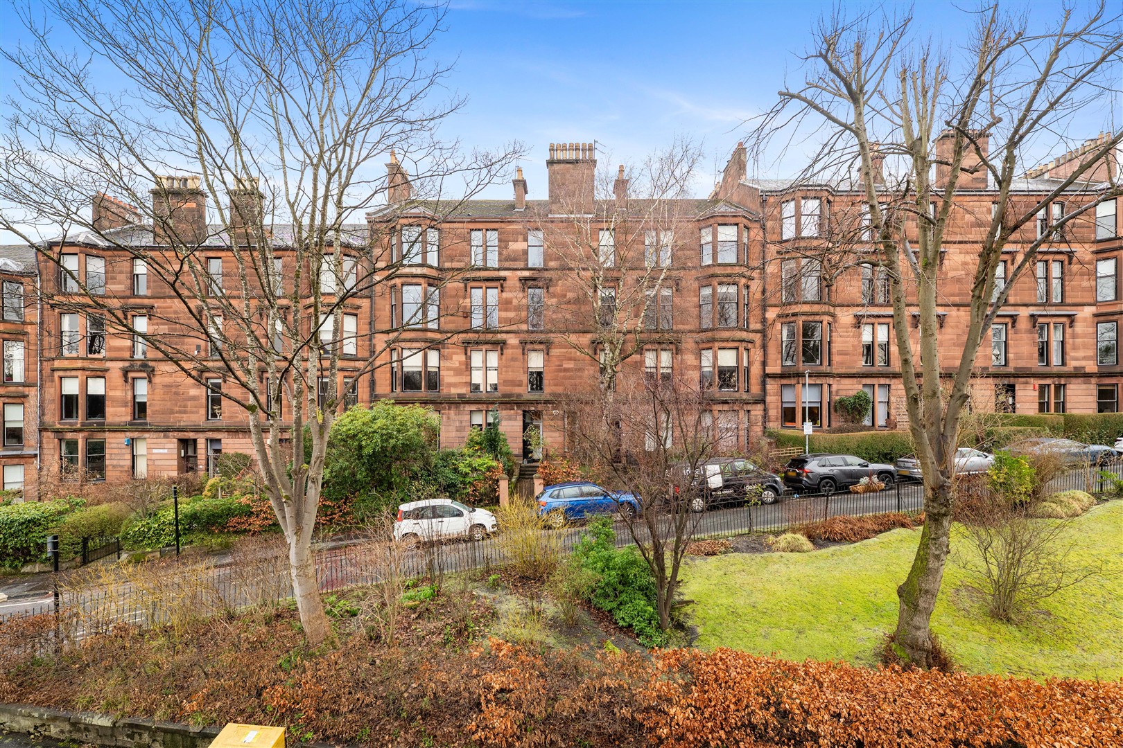 Situated on an elevated terrace, this elegant red sandstone tenement building is entered through a secure entry system into a well-maintained traditional communal hall with access to the rear garden and stairs to all levels. The internal accommodation, entered through double storm doors, comprises: a welcoming reception hallway with storage off, a large, south facing lounge with bay window, feature fireplace, ornate cornicing and superb herringbone flooring, and to the rear, a modern, generous dining kitchen with built-in appliances, island and utility space. There are three generously sized bedrooms, with the principal bedroom benefitting from built-in storage cupboards, and a stylish bathroom with three-piece suite completes the accommodation on offer.