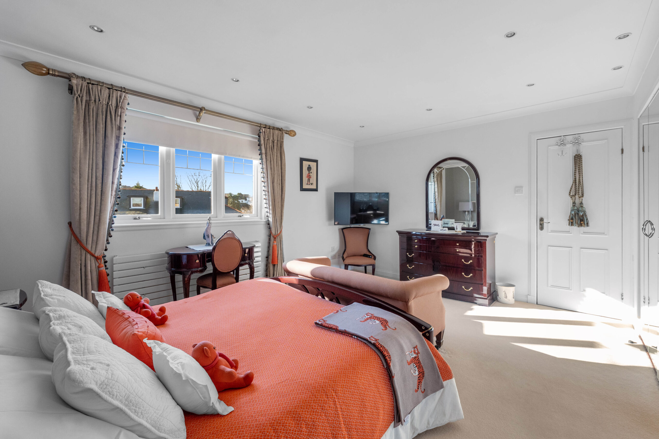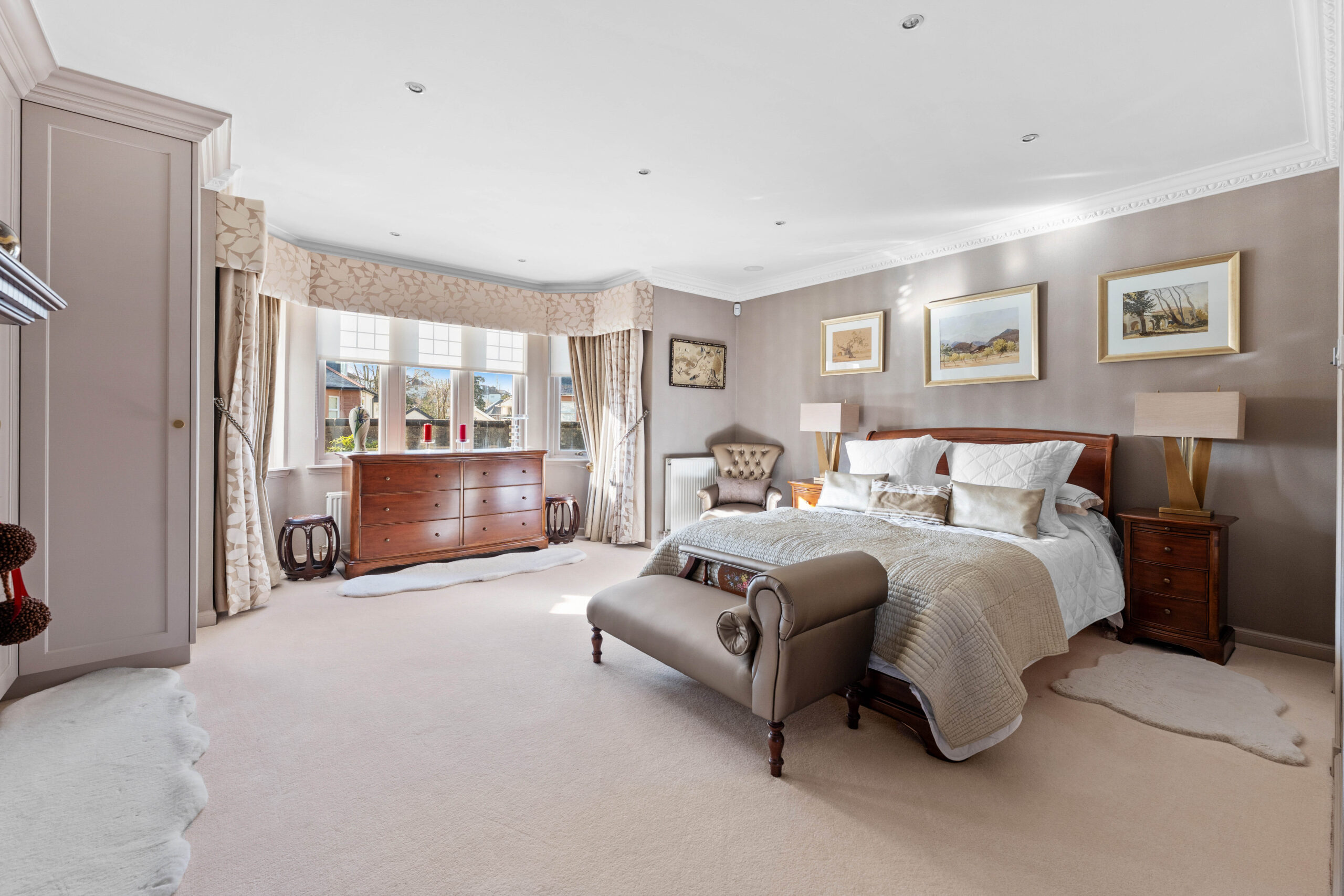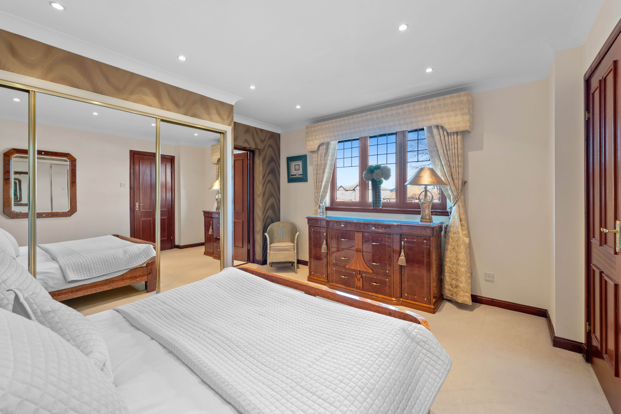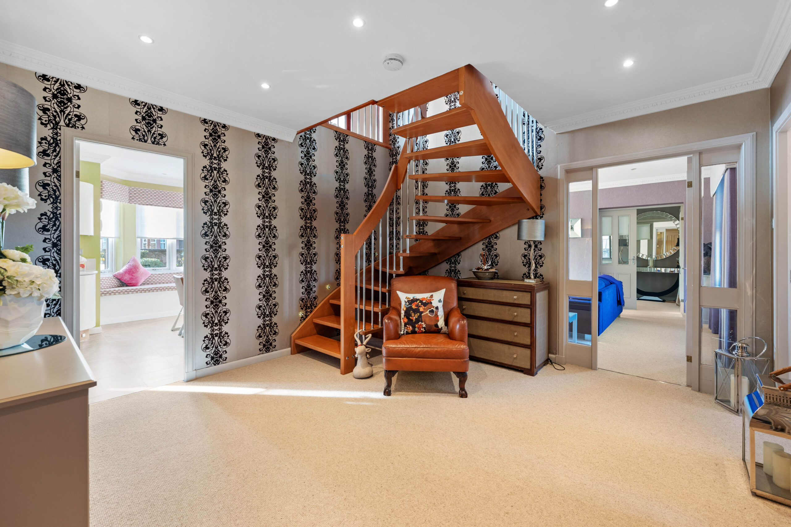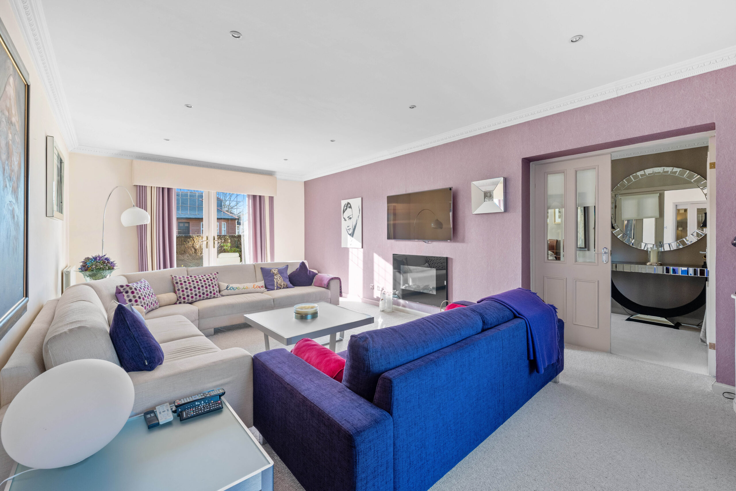 The accommodation extends to; vestibule, broad hallway with excellent storage with bespoke staircase leading to the upper level. Double aspect formal lounge with fireplace and twin doors to the garden, whilst to the front is a comfortable sitting / TV room. The kitchen is a fantastic space with a broad range of units, lots of worktop space, integrated Neff appliances, breakfast bar/table and ample room for sitting/dining. There is also a utility off, with door access to gardens. Also on the ground floor is a huge principal bedroom suite with feature fireplace and beautifully finished en-suite wet room.