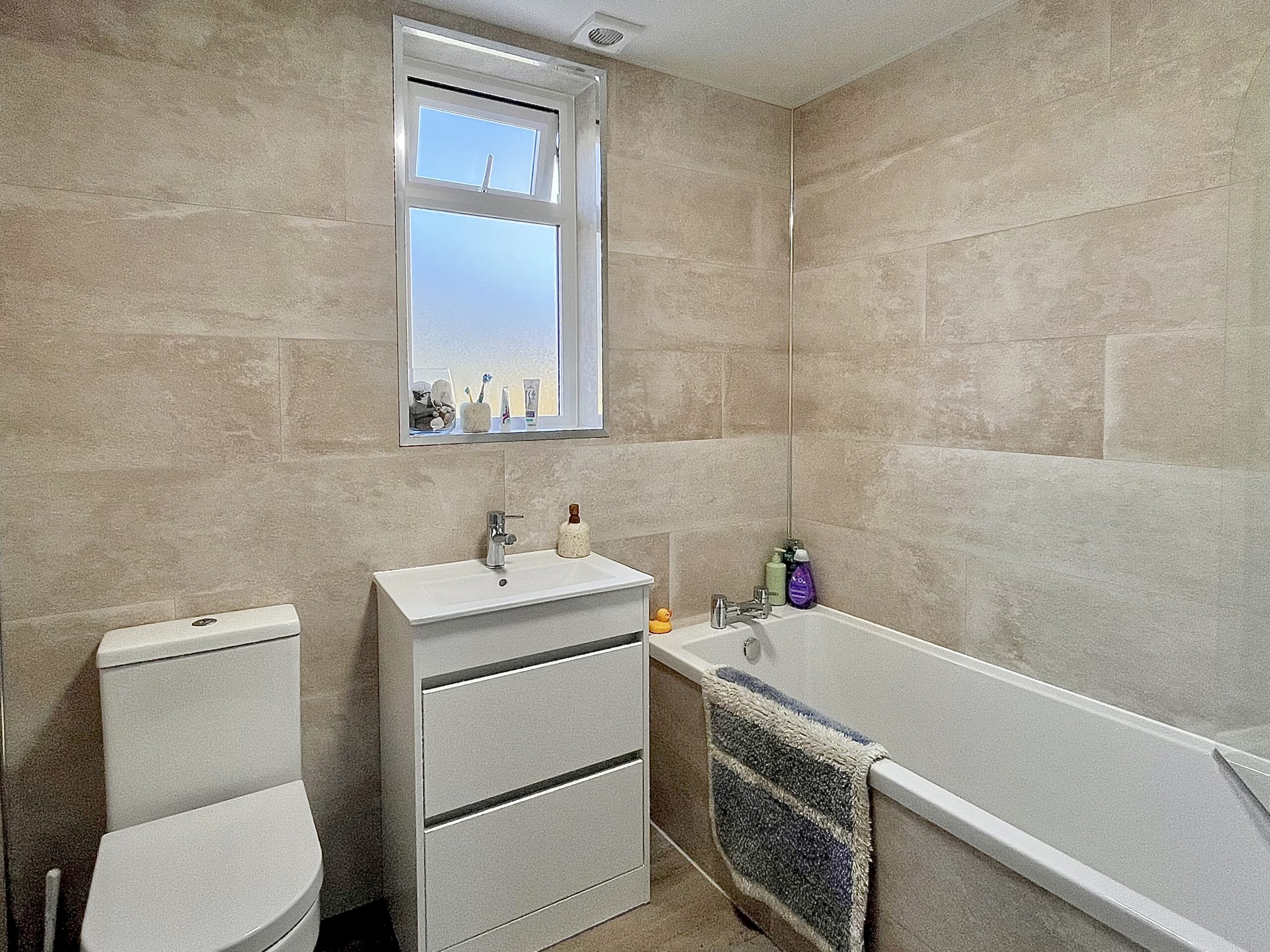The property features two generous double bedrooms, both offering flexibility for family living, guest accommodation or home working. The family bathroom has recently been refurbished and is finished to a fresh, contemporary standard, complete with a three-piece suite and shower over bath.