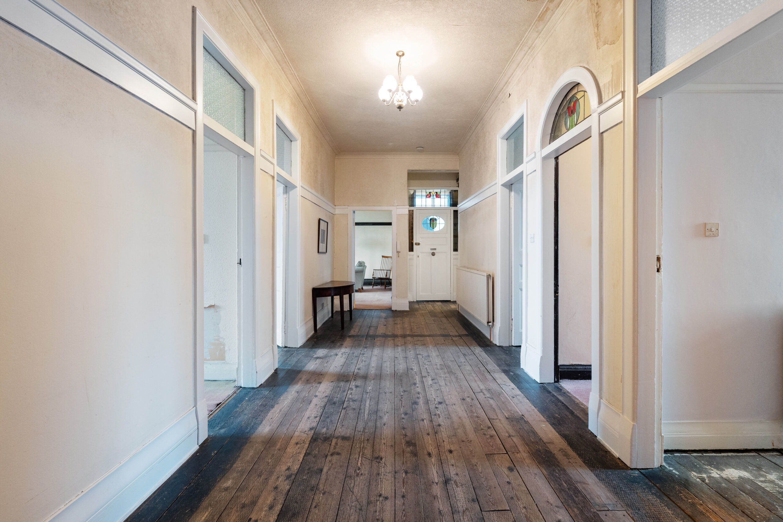 The generous accommodation, which is in need of renovation, extends to over 2000 sq ft and retains a wealth of period features including ceilings cornice and fireplaces. The building is initially entered via a secure entry system leading to well-maintained communal hall with access to the well-kept residents’ gardens and all other apartments. Situated at top floor left, the property in question has a large welcoming reception hall with ample storage off, large bay windowed lounge, formal dining room, dining kitchen with utility room off, four double bedrooms, family bathroom and additional shower room off the hall.