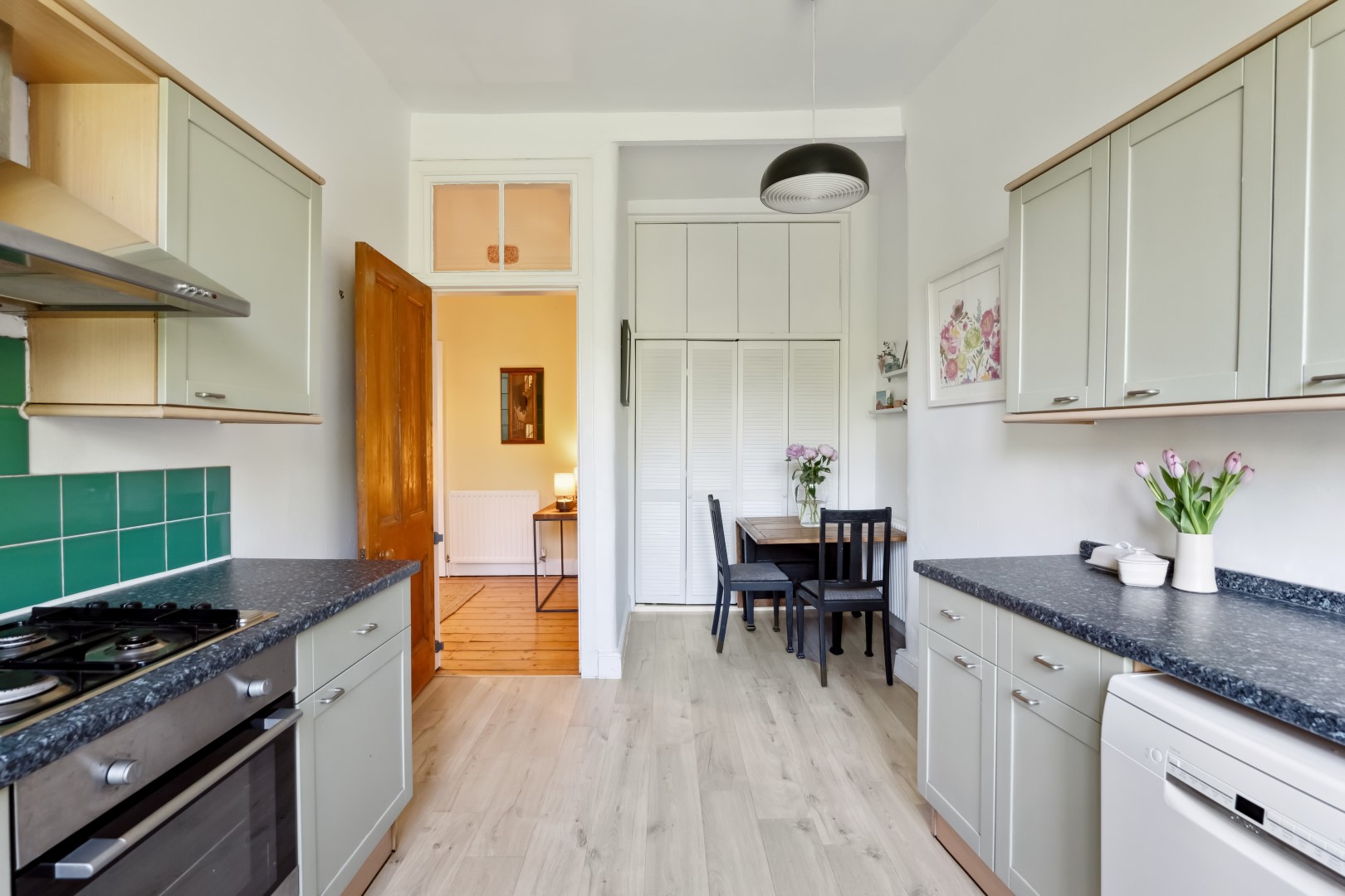 Inside, the flat features a spacious reception hall with restored original flooring and large storage cupboard off. The impressive bay-windowed lounge enjoys plenty of natural light as it is south facing, and retains elegant details such as painted glass upper panels and delicate cornicing, along with beautifully refurbished floors. There are two generous double bedrooms, a large dining kitchen ideal for everyday living or entertaining, and a well-appointed, three-piece bathroom suite.