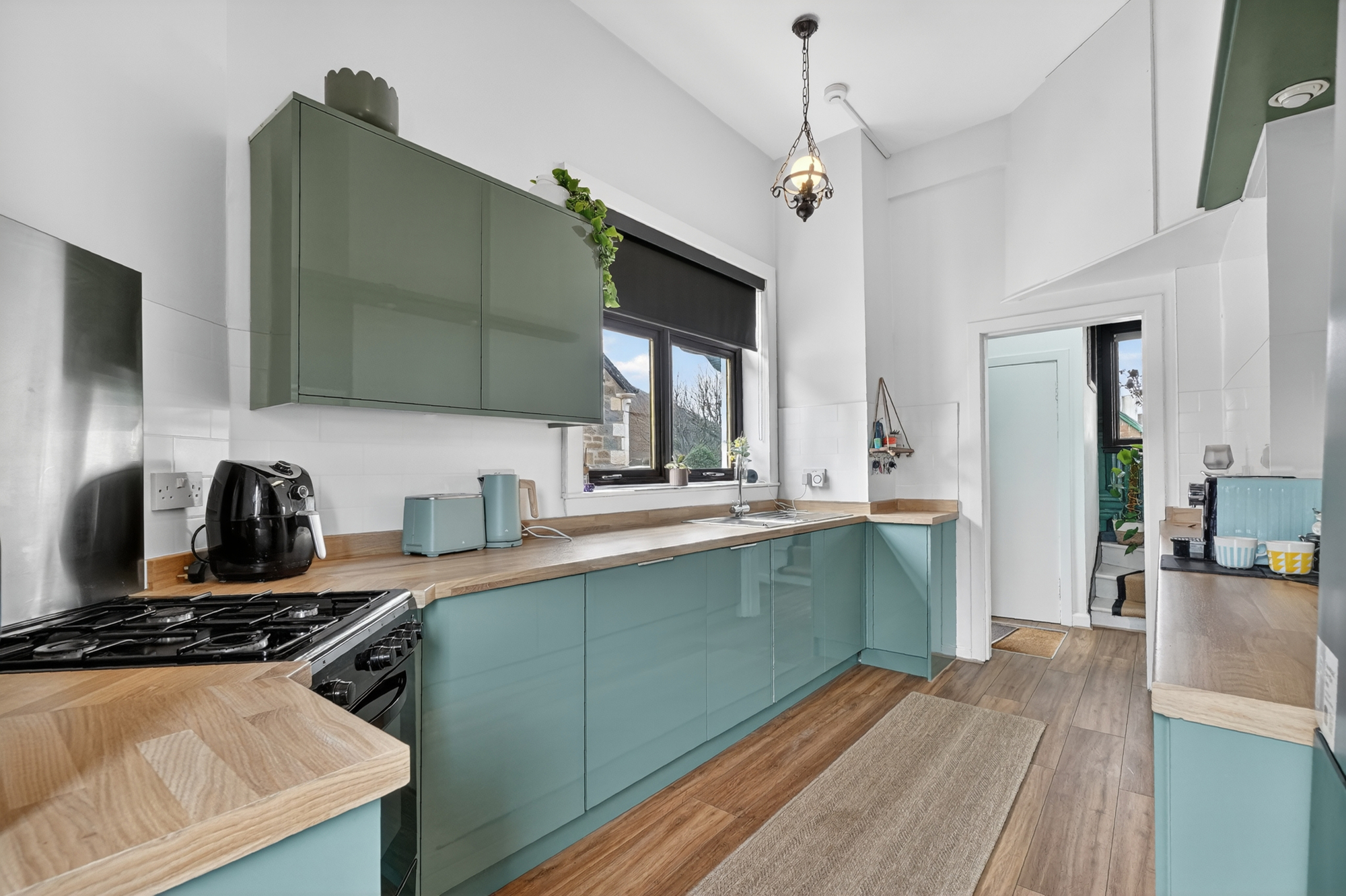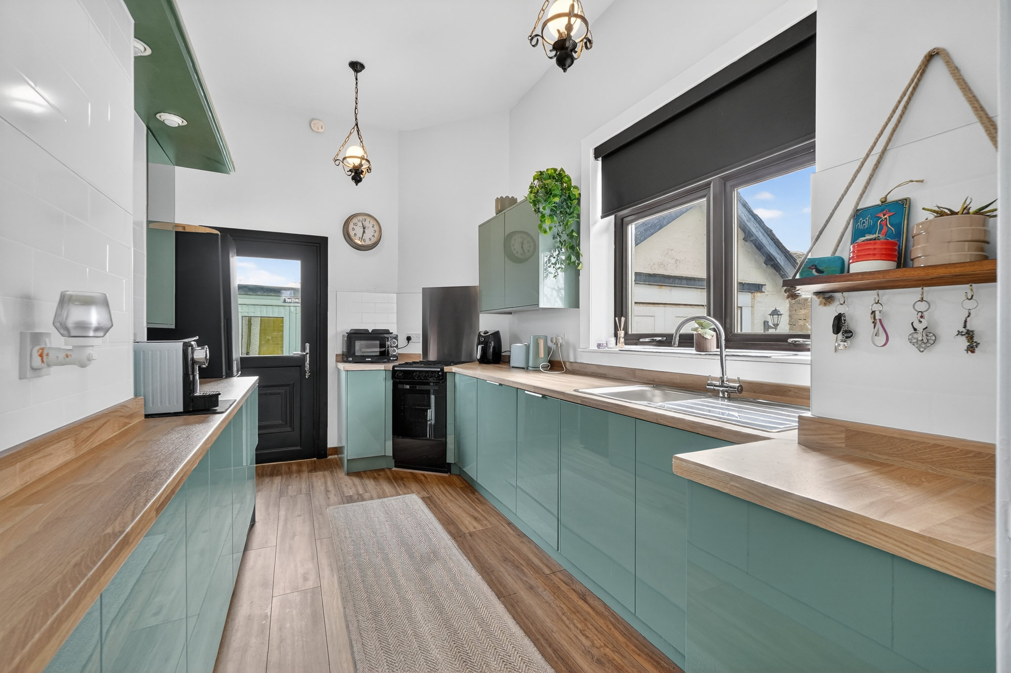 Internally, the property is presented in excellent condition throughout, combining traditional character with modern finishes. The ground floor comprises a welcoming entrance, leading through to a generous lounge with ample space for dining, enhanced by fitted storage and an abundance of natural light. The luxury fitted kitchen is well appointed with contemporary units and integrated appliances, providing a stylish and functional space for everyday living. On the upper level, there are two well proportioned double bedrooms and a modern bathroom suite, finished to a high standard and designed for comfort and practicality.