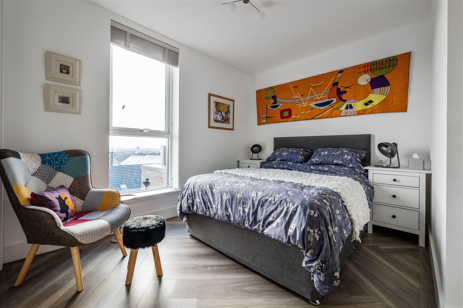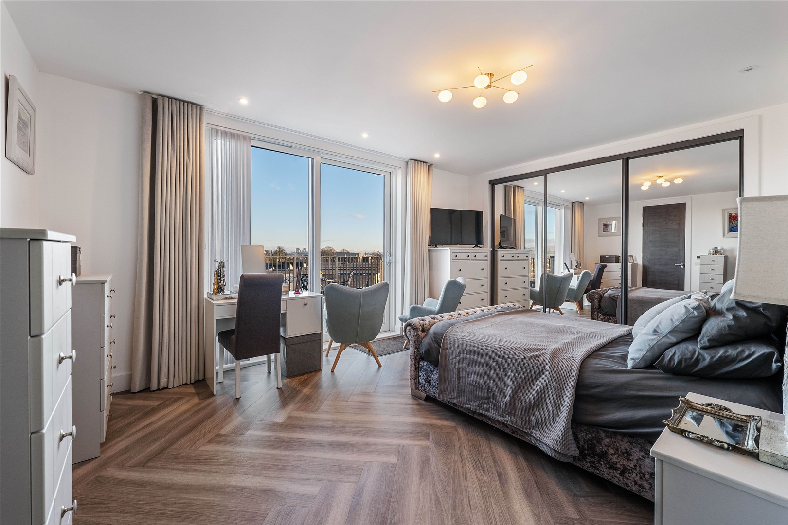 The principal bedroom is a truly luxurious retreat. Exceptionally spacious, it features a full-width fitted wardrobe and an elegant en-suite bathroom with a contemporary freestanding bath, large separate shower, WC and a double-width vanity unit. Large sliding glass doors open directly onto the bedroom’s own vast private terrace, where uninterrupted panoramic views stretch across the Campsie Hills to Dumgoyne.