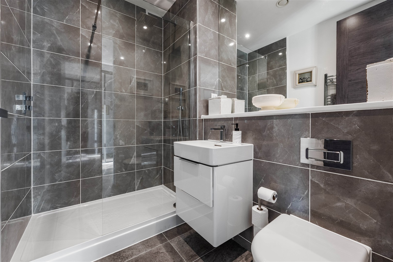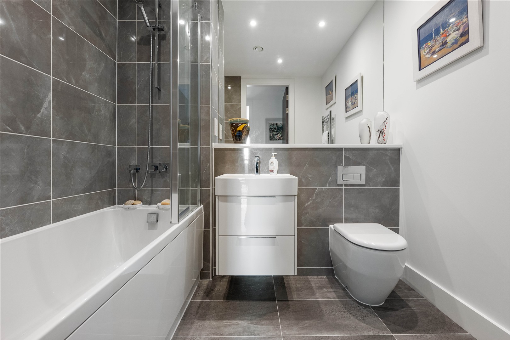 A stylish family bathroom is located off the hallway and features a modern three-piece suite. All bathrooms throughout the apartment are finished to an exceptional standard, with full-height heated mirrors and electric towel rails.