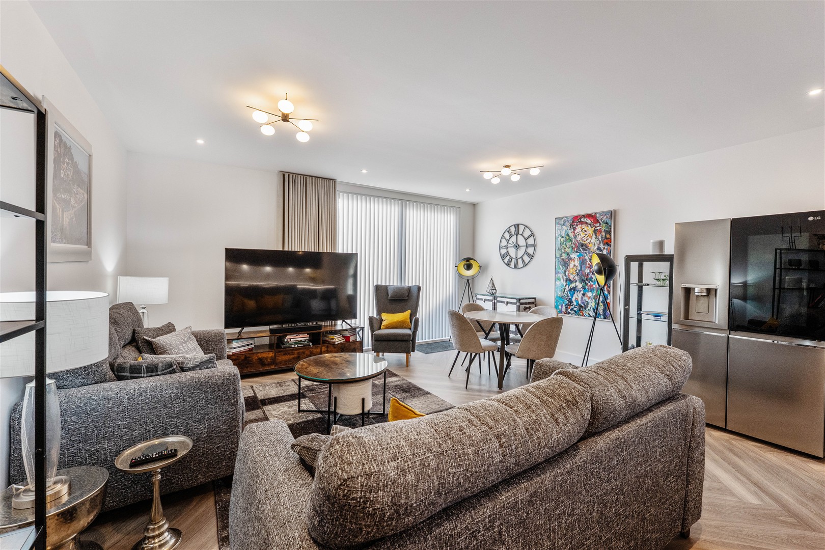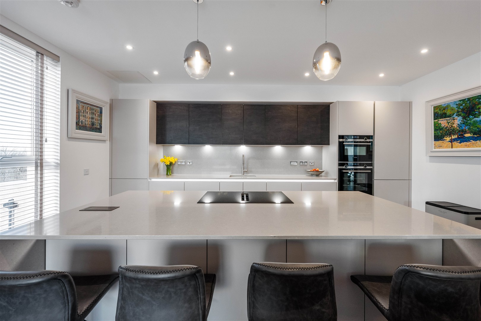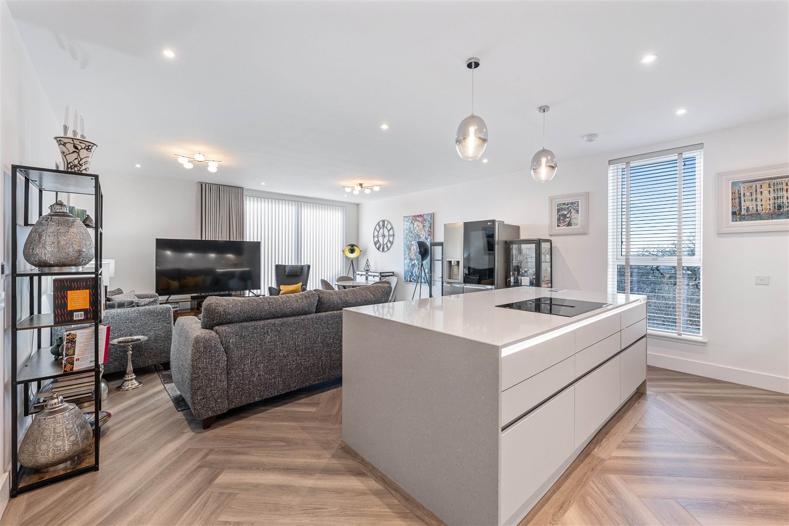 At the heart of the penthouse is the outstanding open-plan living space. The sleek, contemporary kitchen is fitted with Silestone worktops and splashbacks, a substantial matching island, premium Siemens integrated appliances and a Quooker boiling water tap. The lounge and dining areas flow effortlessly onto the main terrace via large sliding doors.