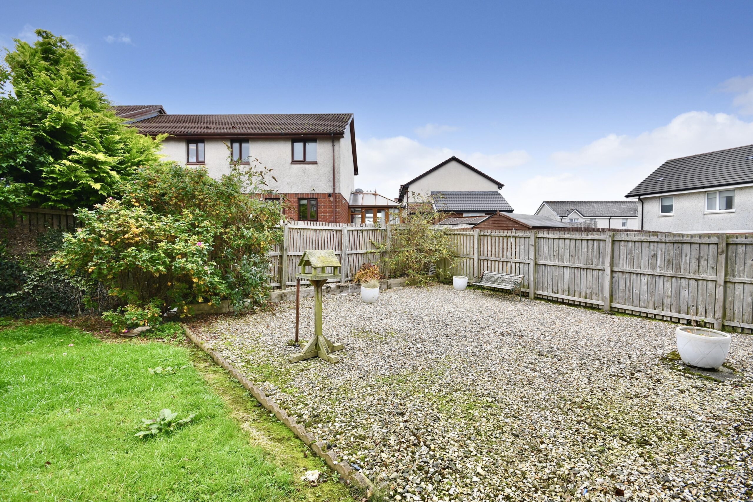 Externally there are gardens to the front laid with paved pathways and decorative aggregate. There is decorative aggregate along the side of the property and round to the private rear garden, which also has decorative shrubs and a lawn.