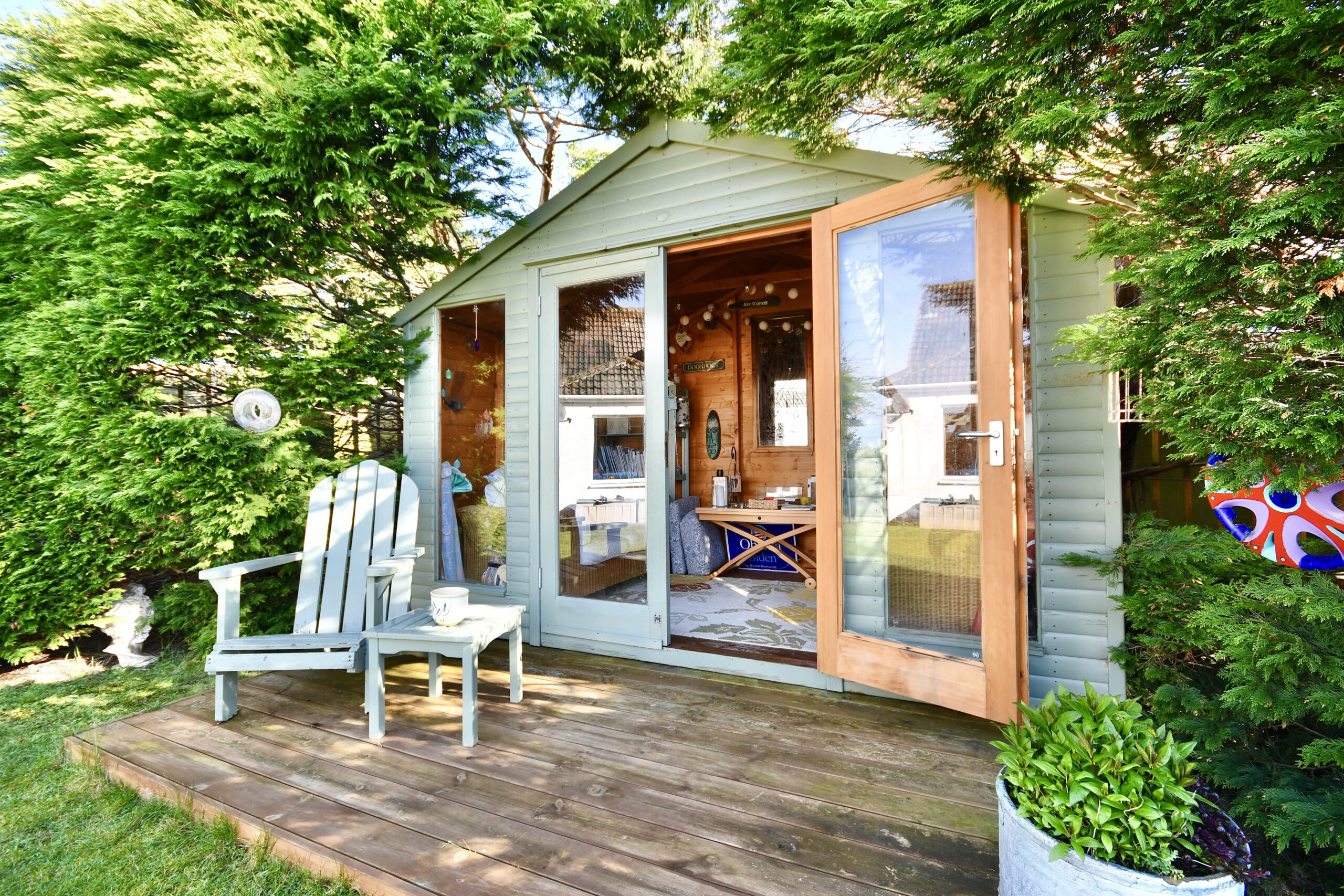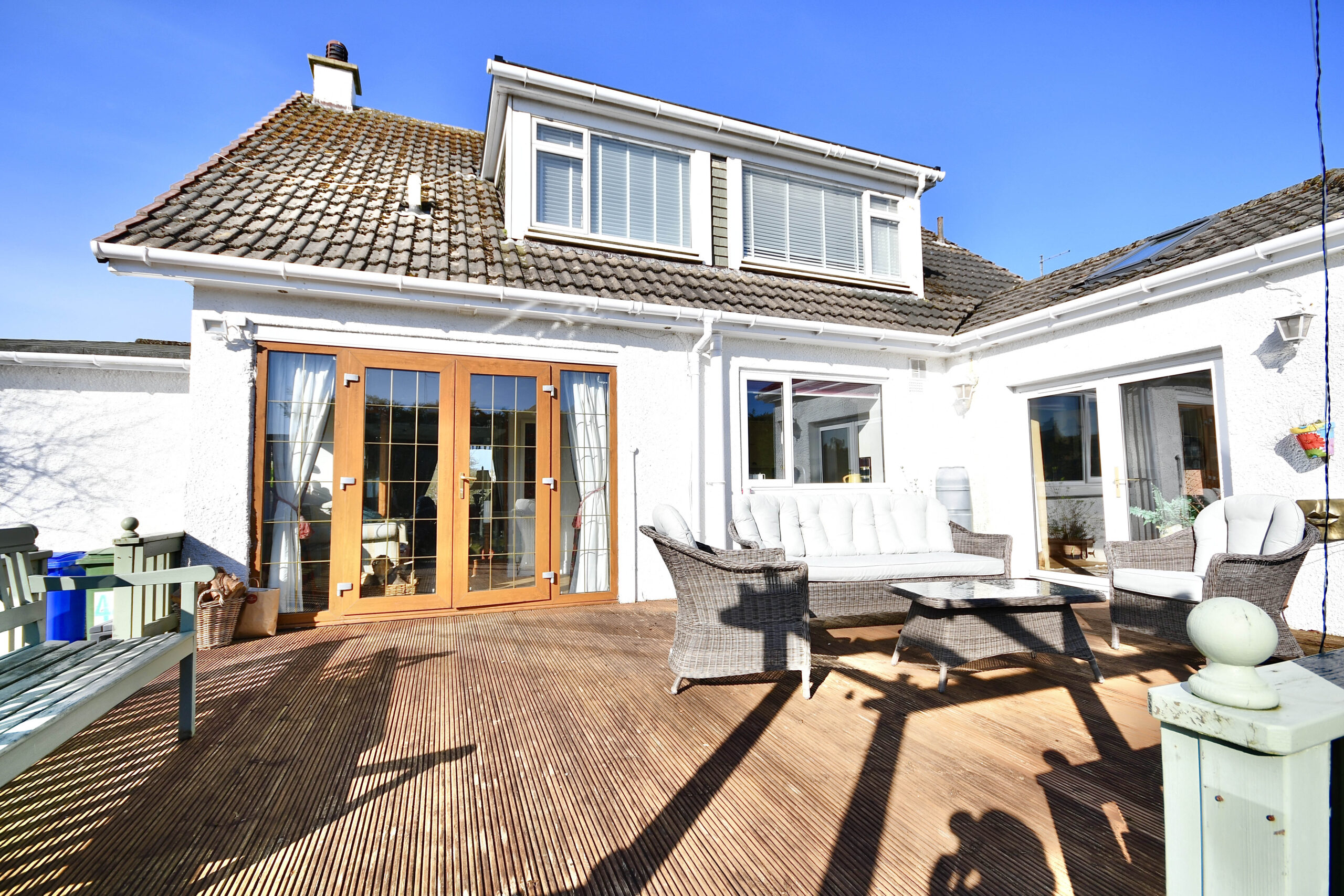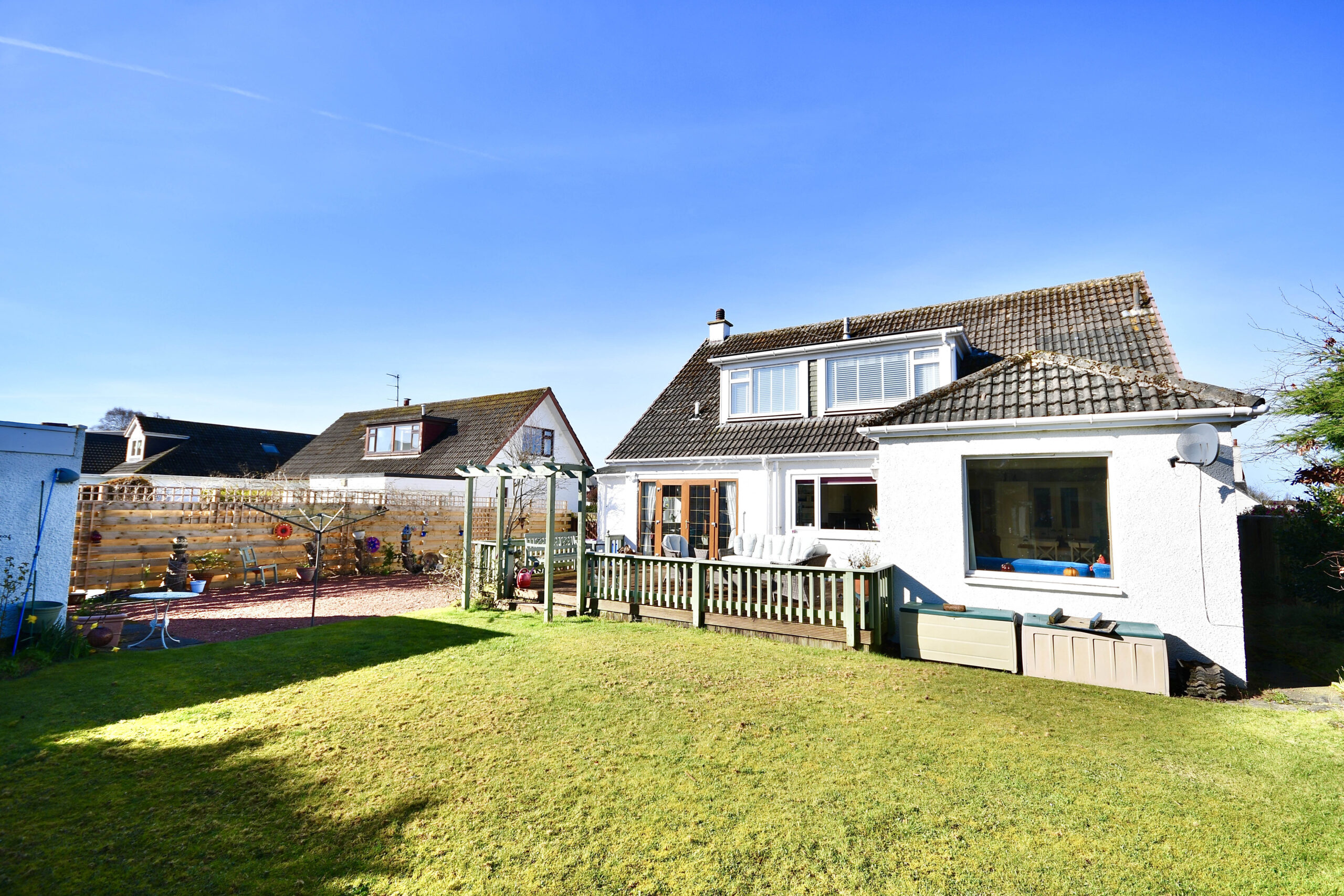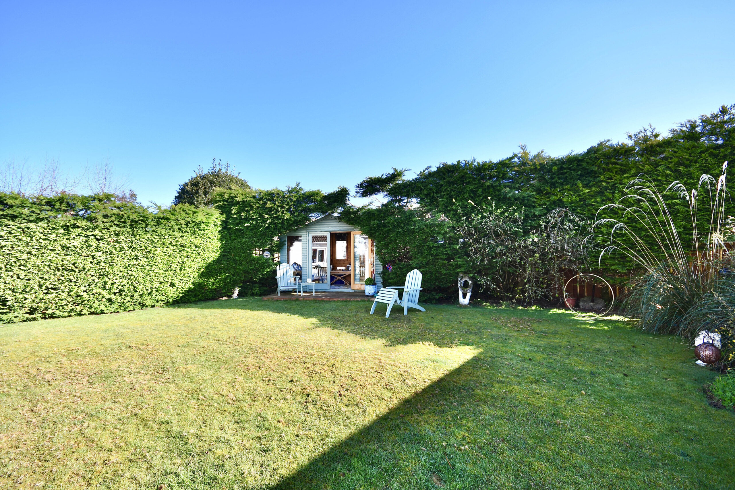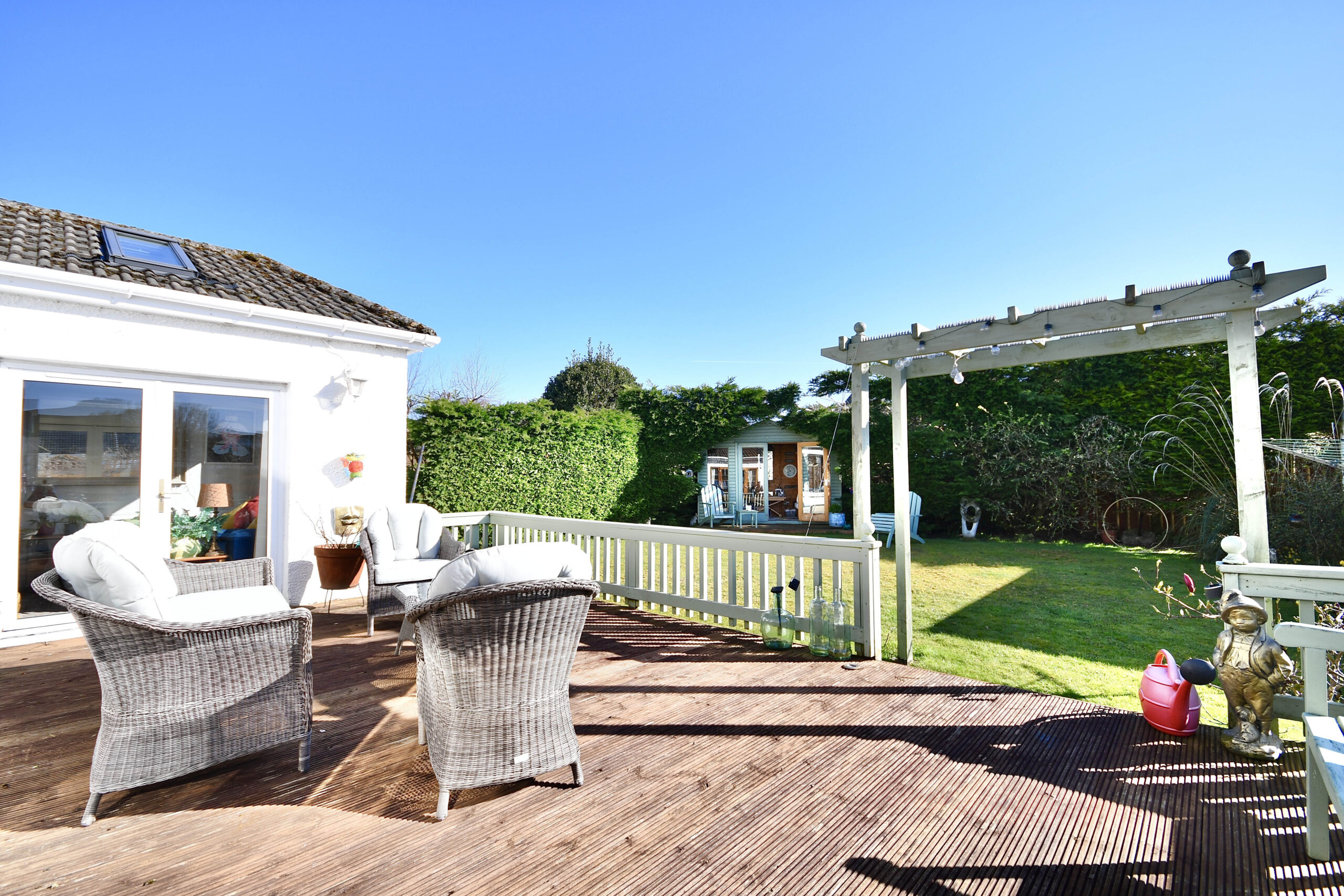 Externally the property is set off Earls Way with a large front garden, with mature trees, a manicured lawn and a sweeping driveway that also extends along the side of the property to a detached garage at the rear. The rear garden is fully enclosed, with a large decked patio area, a lawn, mature hedging and decorative shrubs. There is also a detached summer house in the corner of the garden.