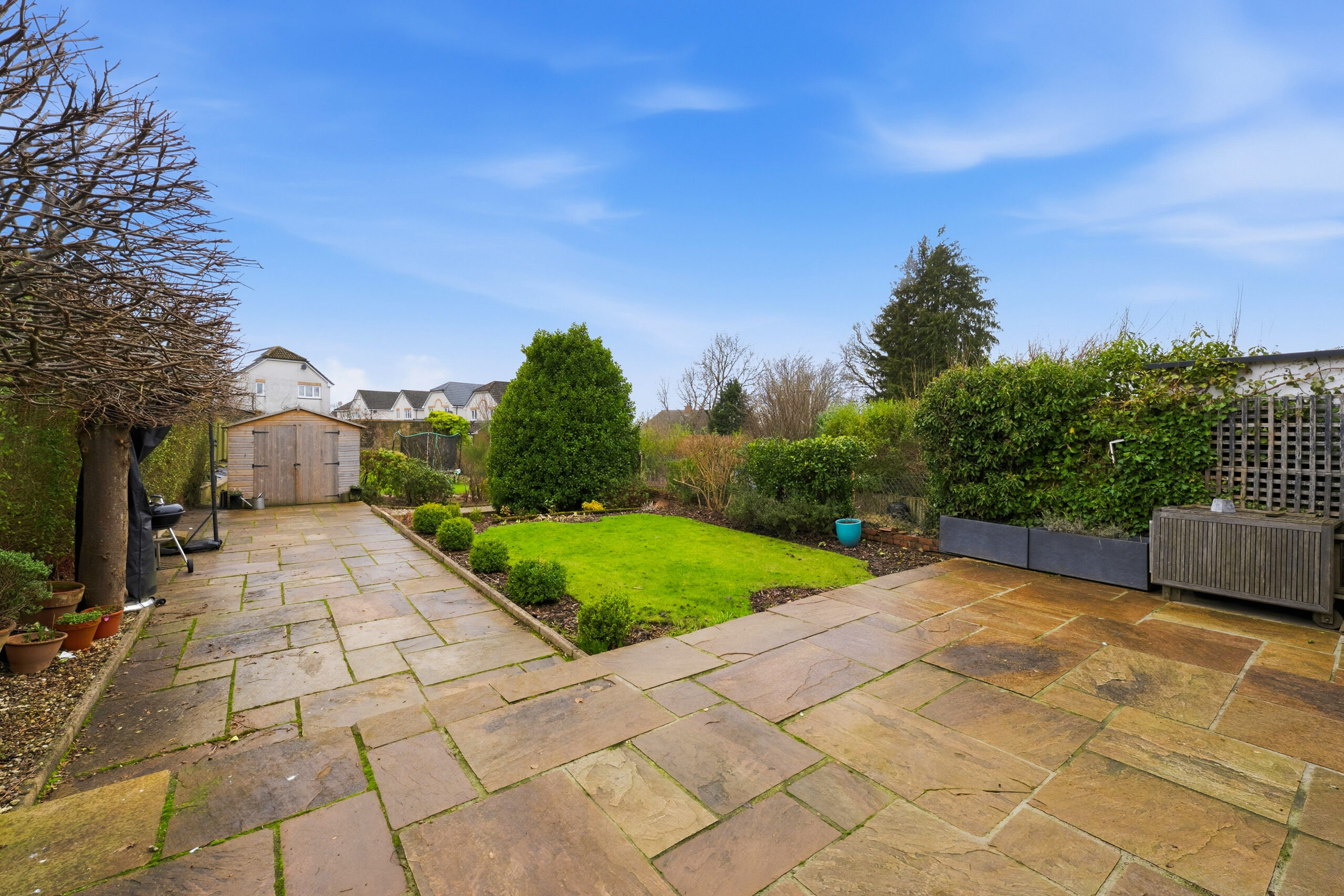 Externally, the gardens are of particular note, being extremely generous with well positioned patio/seating areas. There are mature trees and shrubs surrounding the property which aid privacy, and a driveway to the front providing excellent off street parking for a number of cars.