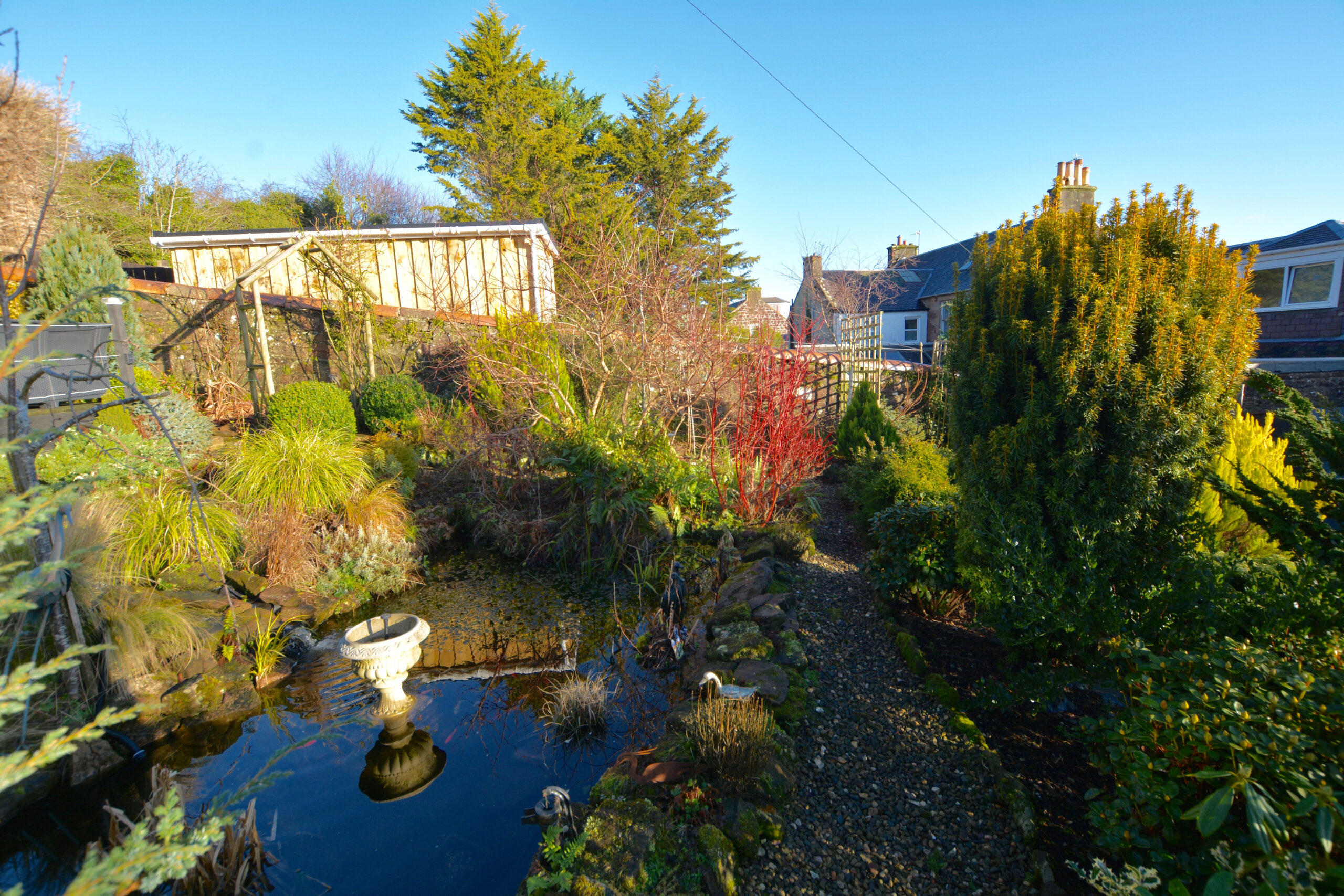 Externally the front garden is laid to low maintenance with chipped and shrubbery borders and driveway parking. The enclosed rear garden is well stocked with mature plants, trees and seasonal shrubs. areas of lawn, patio areas, elevated deck with far reaching views and decorative pond. In addition there is an external home office/summerhouse and garden shed.
