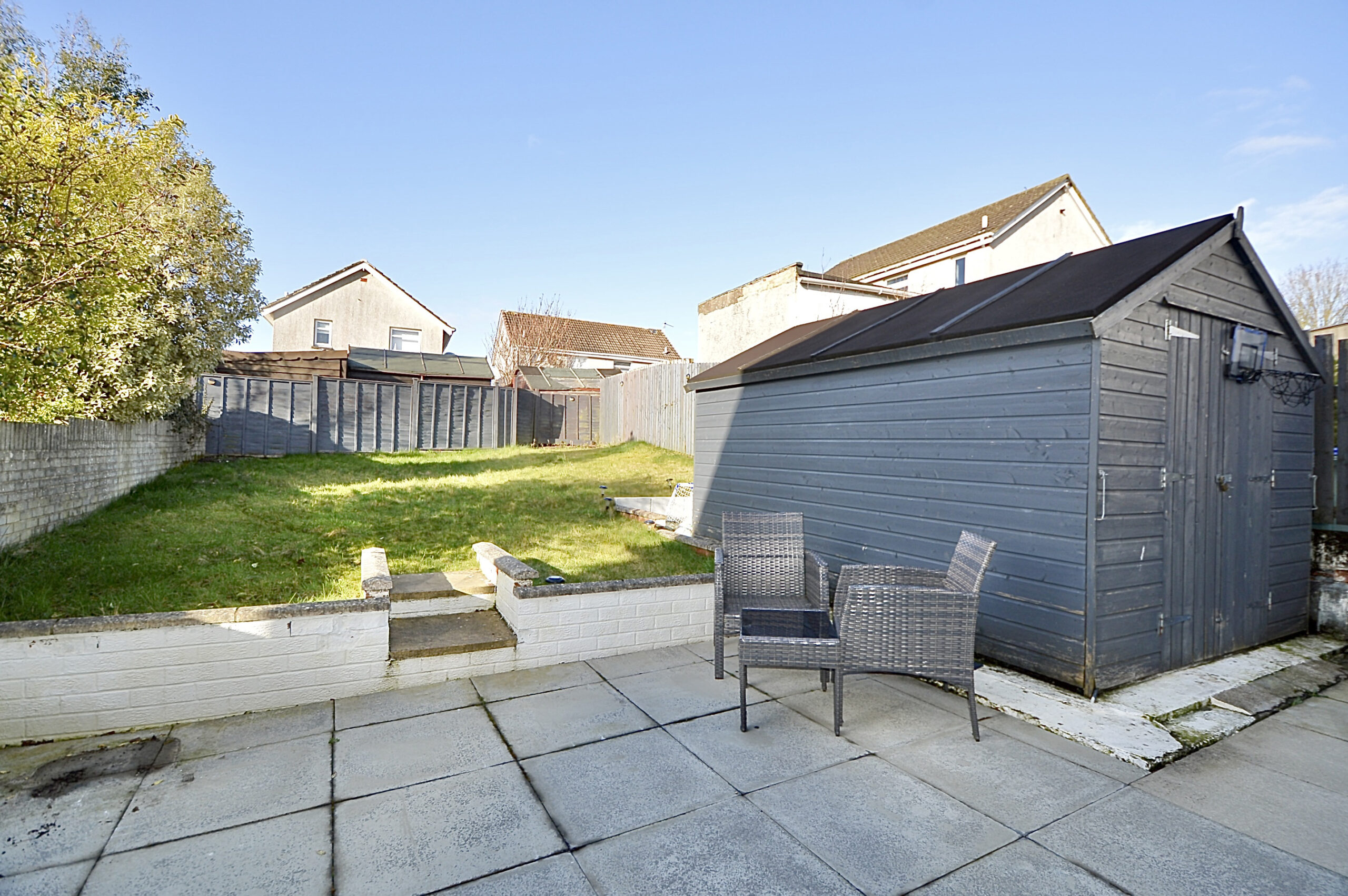 Externally, the property continues to impress. The rear garden is thoughtfully designed for low maintenance, featuring a patio area perfect for summer BBQs, a neat lawn for children or pets to enjoy, and a practical timber shed for additional storage. To the front, a generous driveway provides convenient off-street parking.