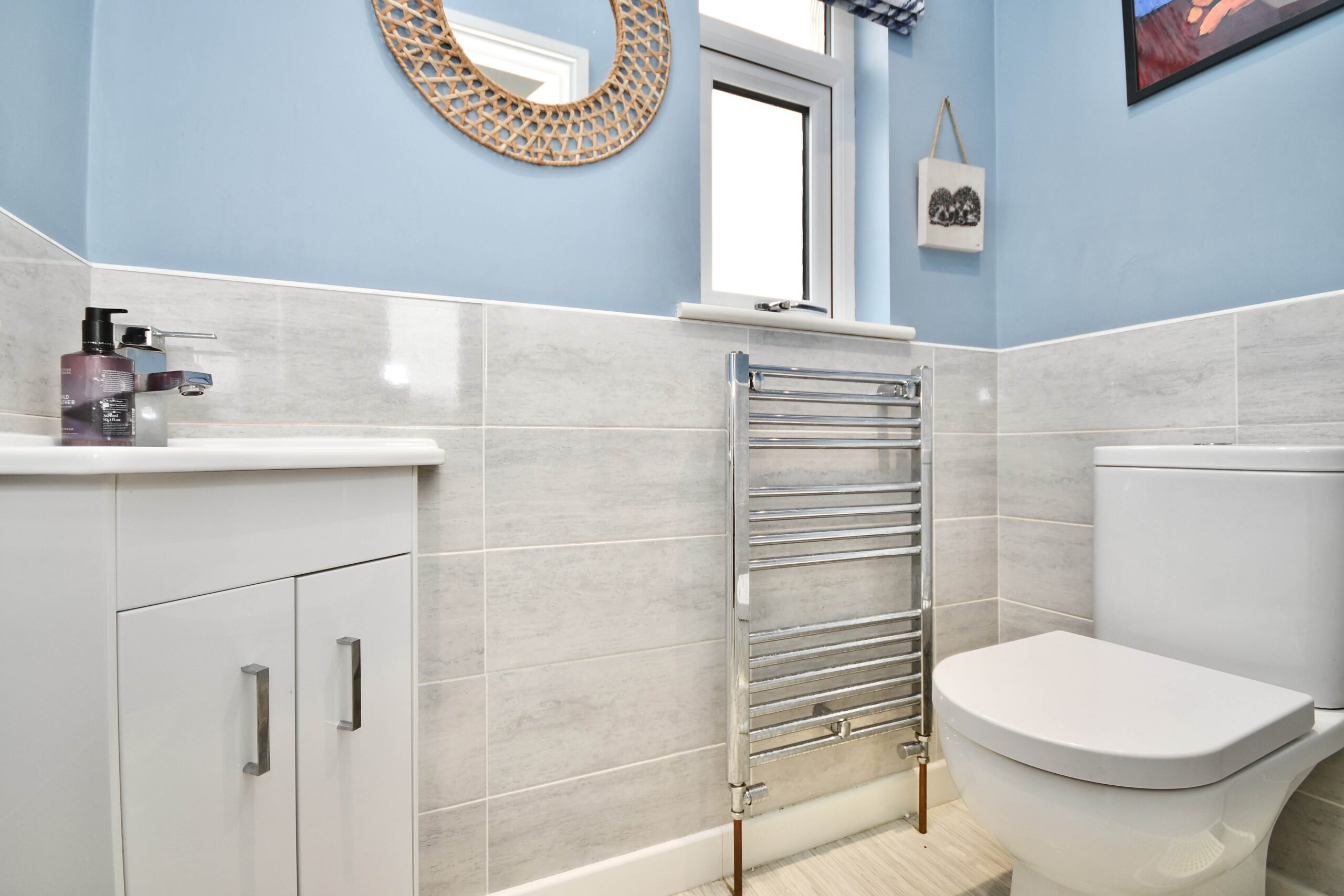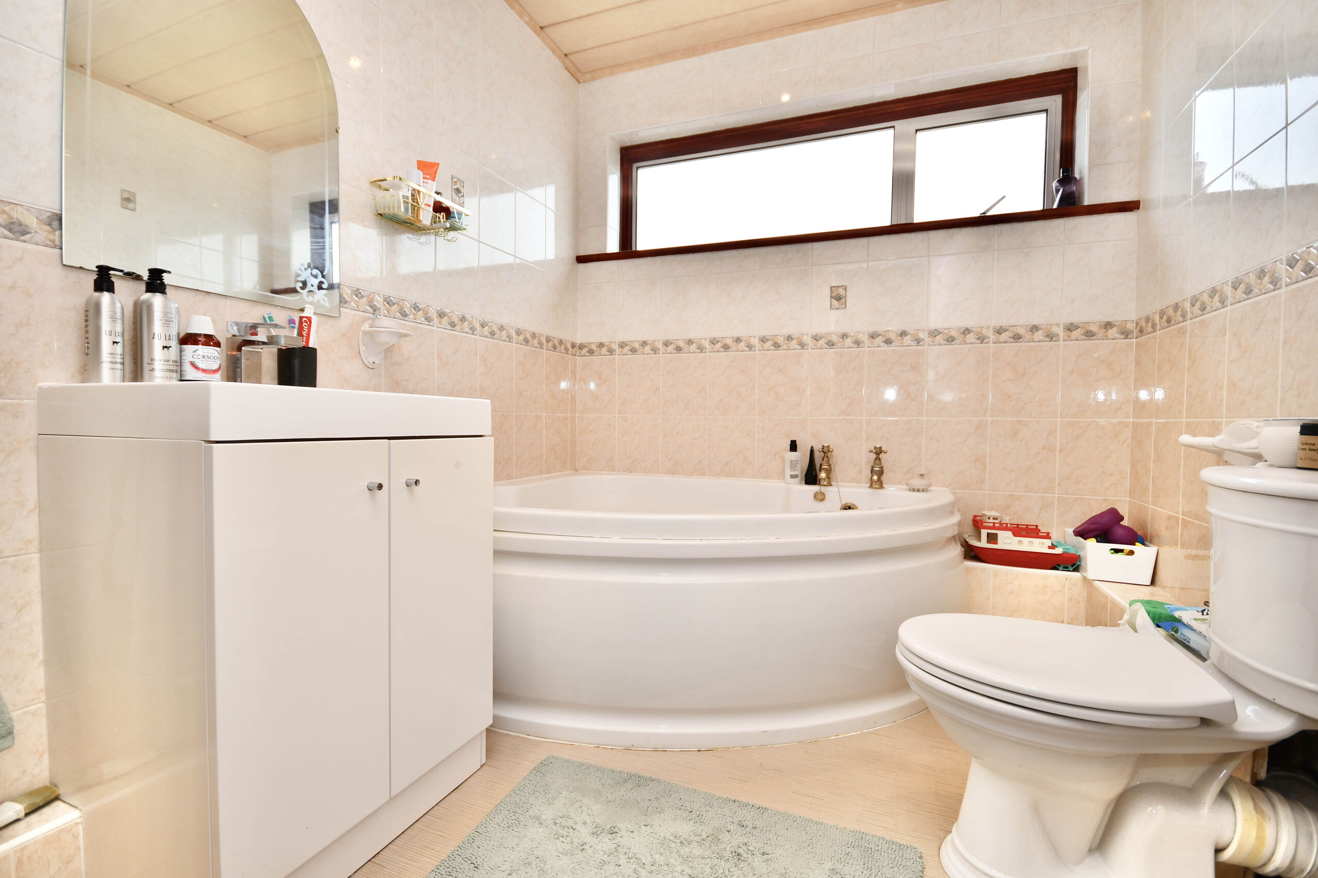 Upstairs, the property offers well-proportioned accommodation, including two generous double bedrooms with fitted wardrobes, a further single bedroom with built-in storage, and a stylish family bathroom complete with a separate shower enclosure and corner bath. Additional storage is available via a cupboard and loft access on the landing.