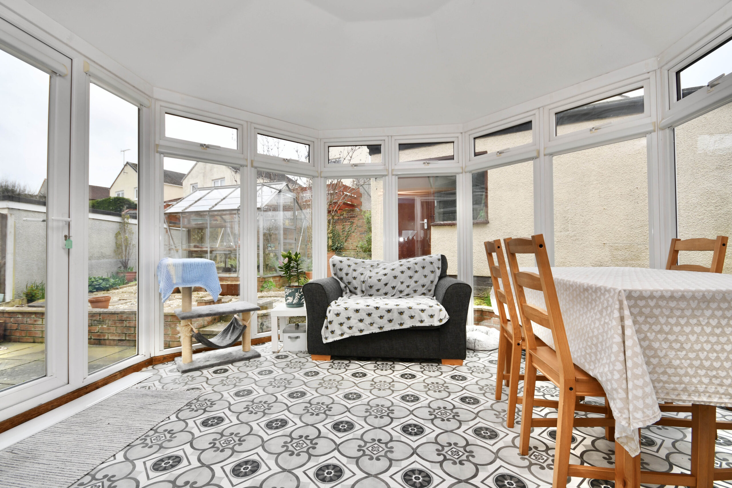 Outside, the property continues to impress. The front garden is laid mainly to lawn with mature shrub borders, while the fully enclosed rear garden has been designed for both relaxation and practicality, featuring paved patio areas, decorative stone sections, raised beds, a greenhouse, and space for growing vegetables.