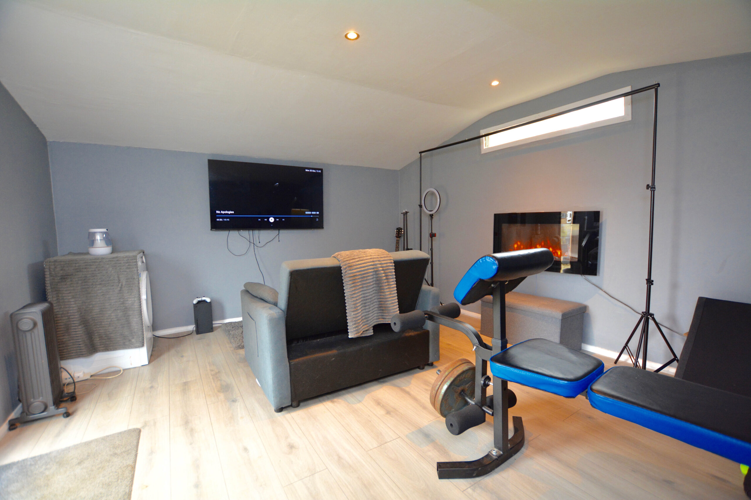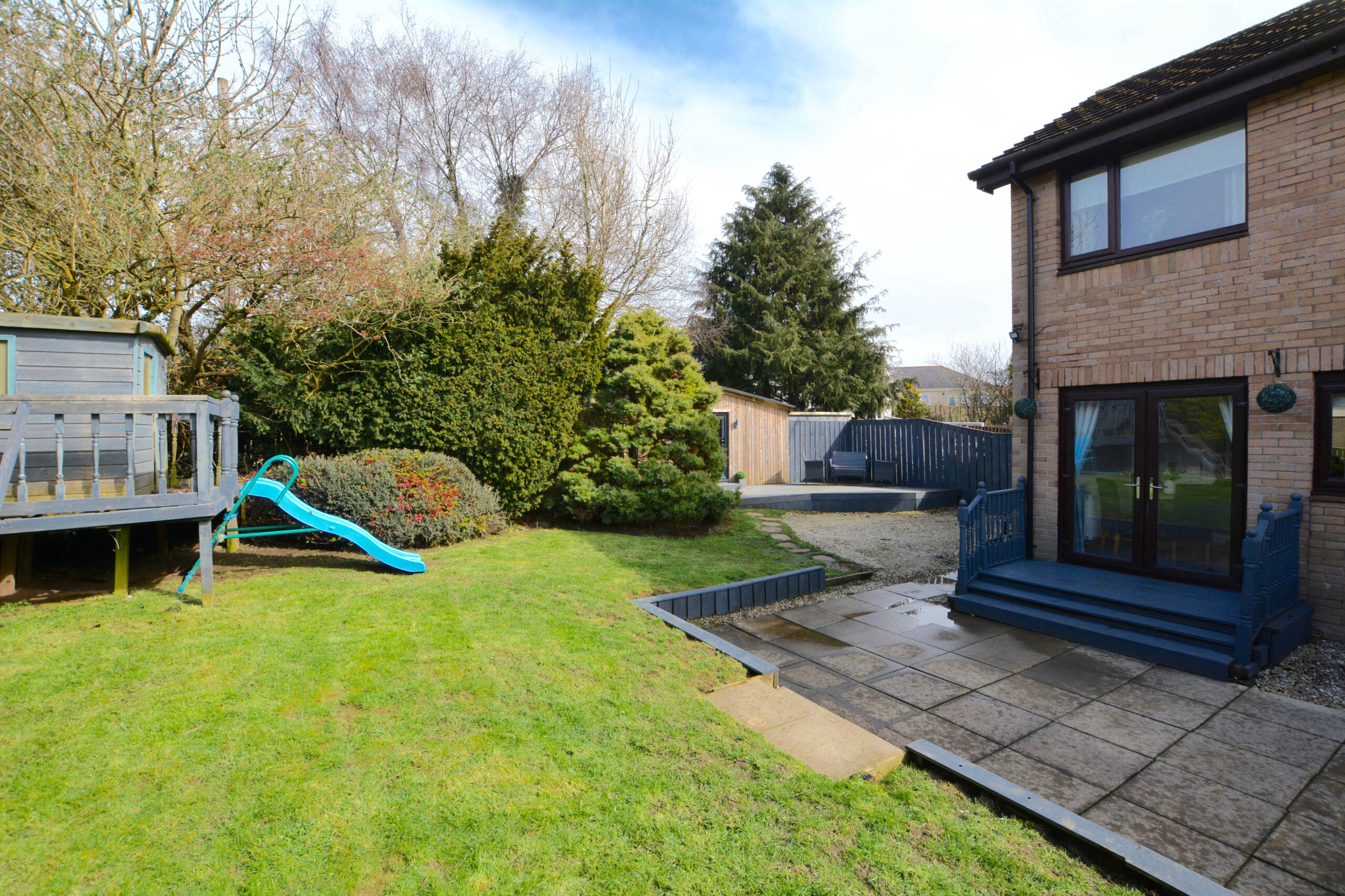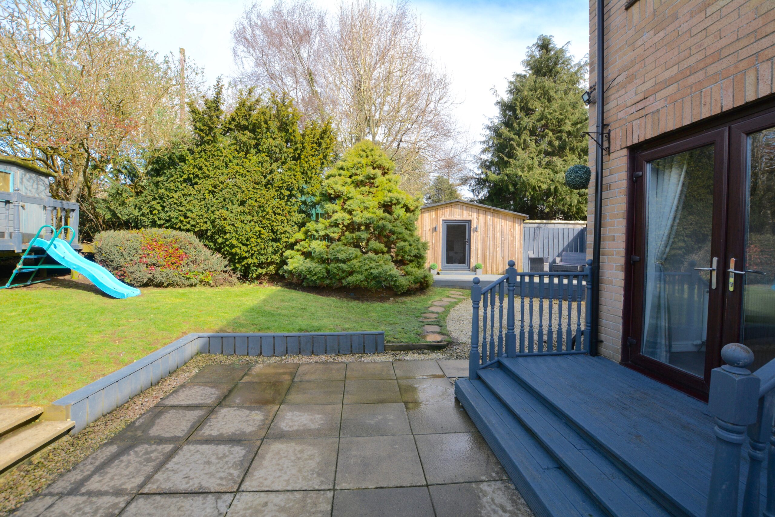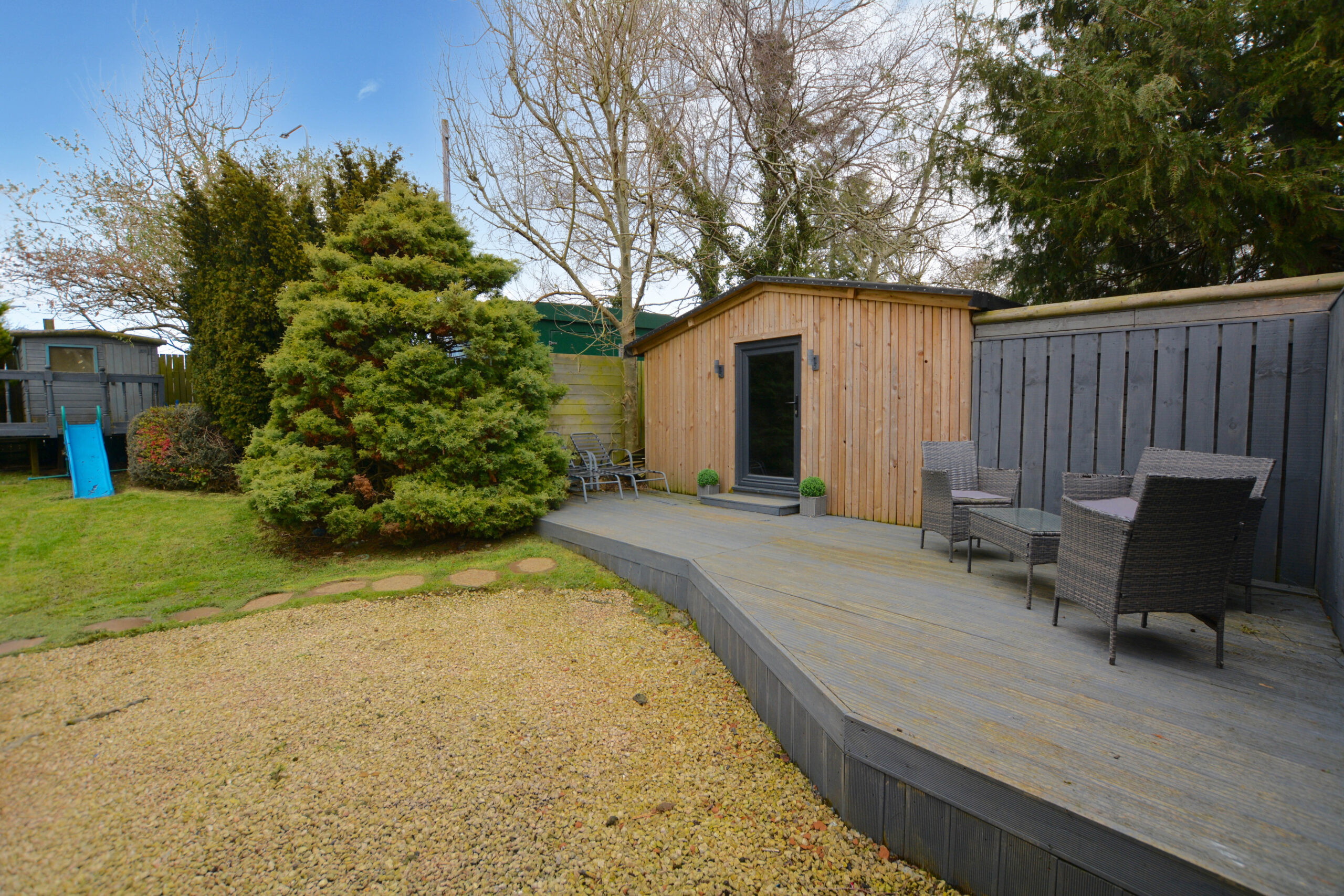Externally the front garden is laid to lawn with surrounding shrubbery borders with a driveway to the rear. To the side of the property is a generous area of lawn. The enclosed rear garden is also predominately laid to lawn with patio area, raised shrubbery borders and mature plants and trees. To the side is a purpose built garden room/home office.