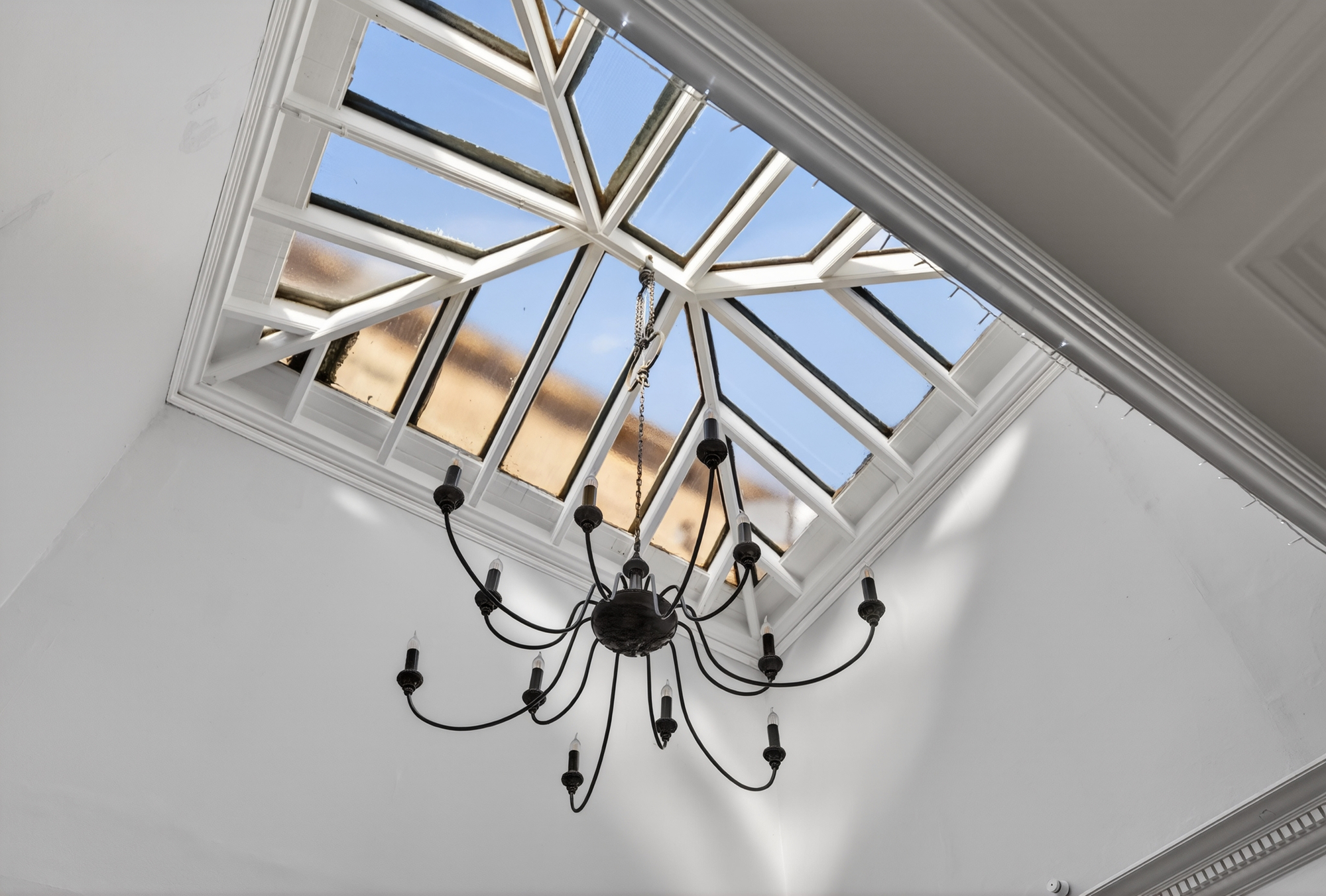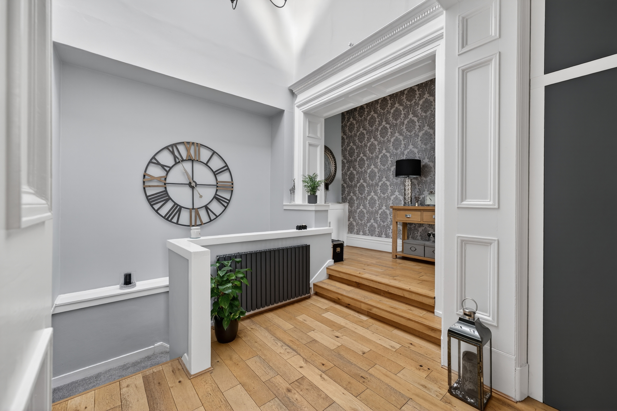 Accessed via its own private ground-floor entrance, the accommodation begins with an entrance hall and staircase leading to the main apartment. At the upper level, a bright and airy landing sits beneath an impressive glass skylight, creating a striking focal point while also providing fitted storage.