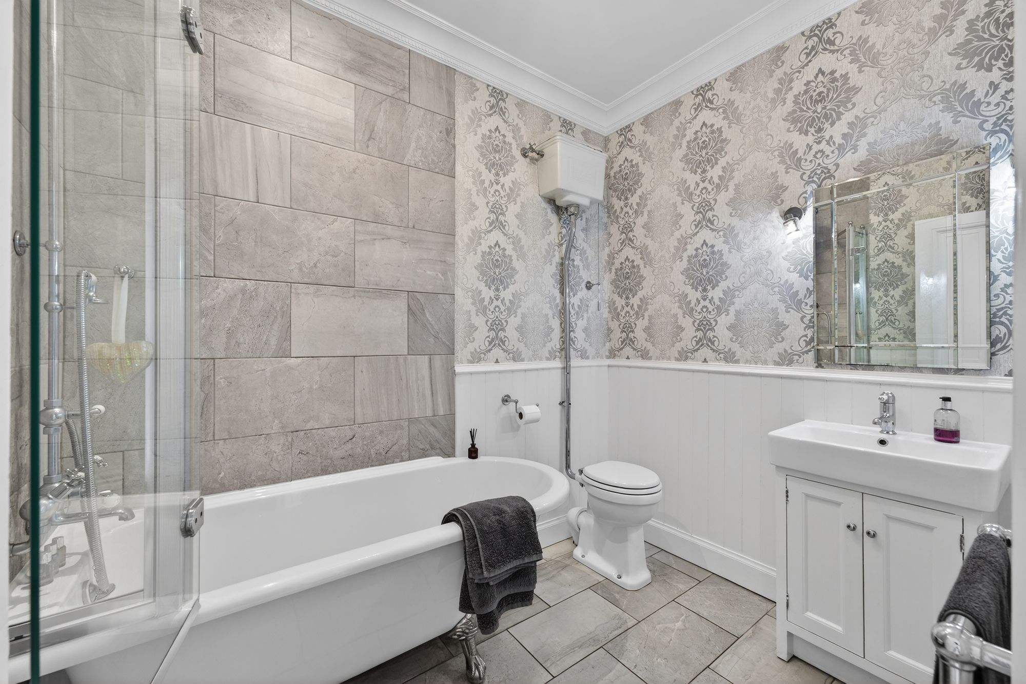 The master bedroom forms a particularly elegant retreat and benefits from a beautifully appointed en suite shower room featuring luxury Victorian-style fittings. There is a further bedroom and a stunning family bathroom suite, also finished to a high standard and in keeping with the home’s traditional character.