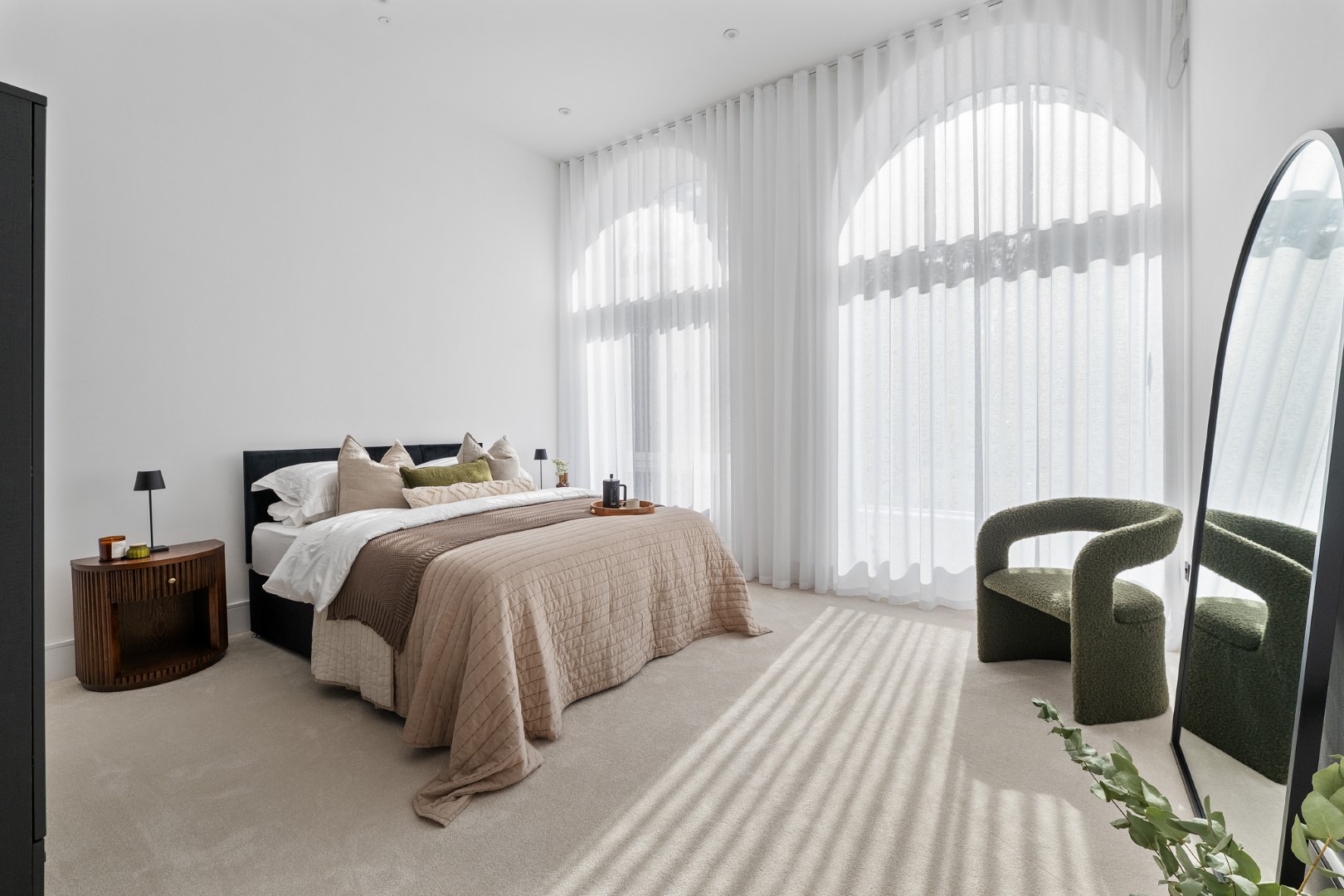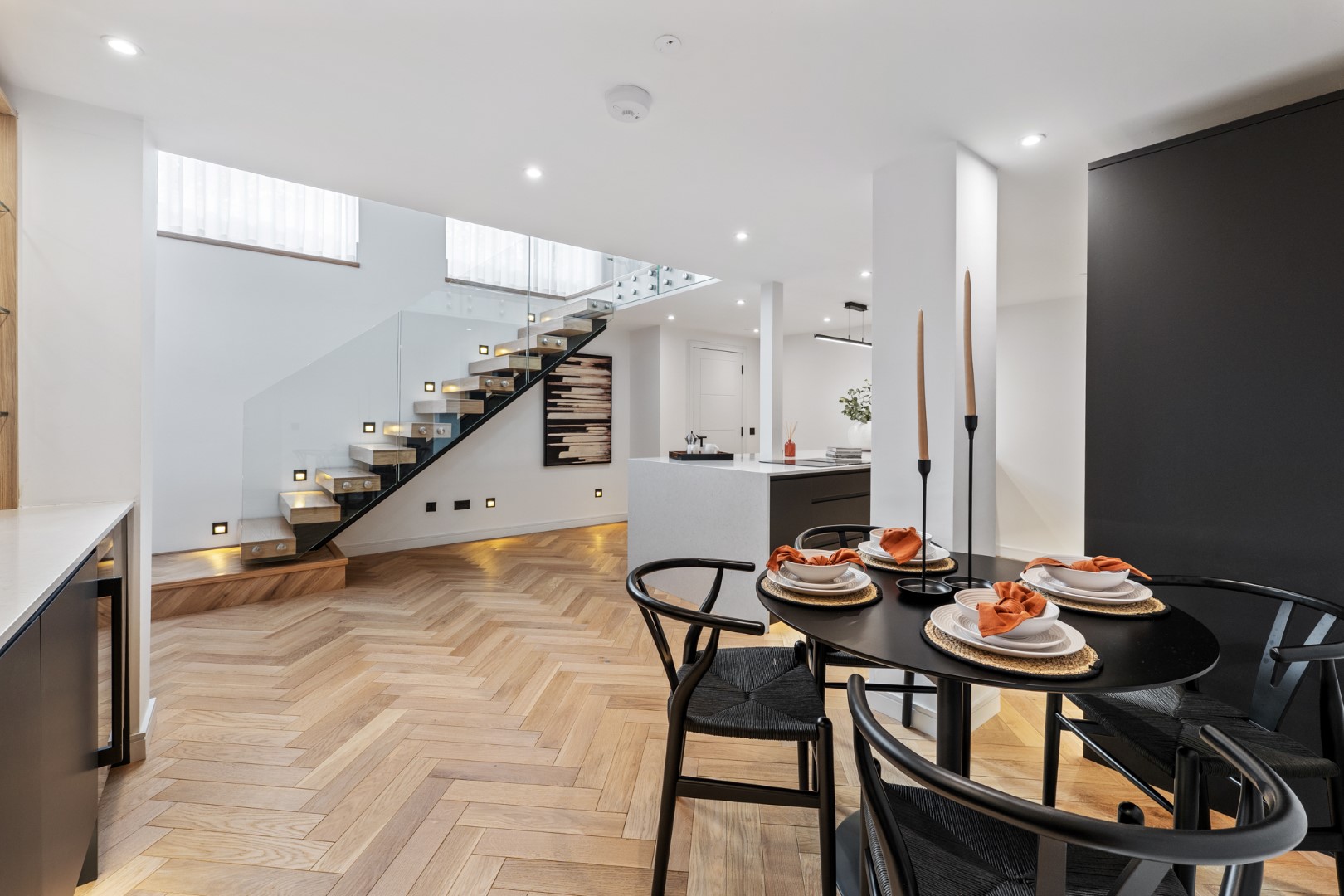 Descending via a floating staircase with glass balustrade, integrated lighting, the lower level opens into a stunning open-plan kitchen, dining, and living area — the true heart of the home. Bathed in natural light and thoughtfully designed for modern living, this expansive space is perfect for both entertaining and relaxing. The sleek, contemporary kitchen boasts a generous breakfast bar, integrated appliances, ample storage, and further bespoke cabinetry, while the adjoining lounge and dining areas offer flexible and inviting spaces for everyday life.
