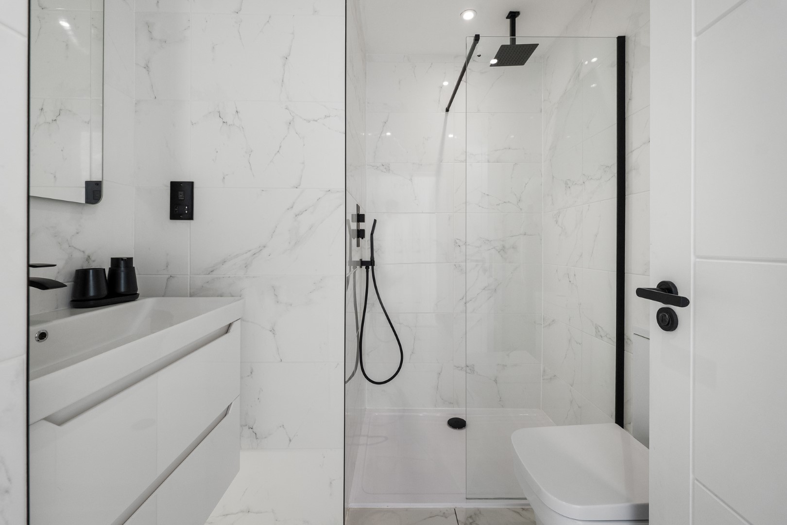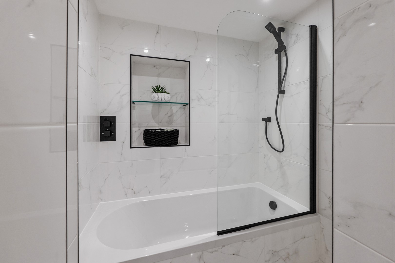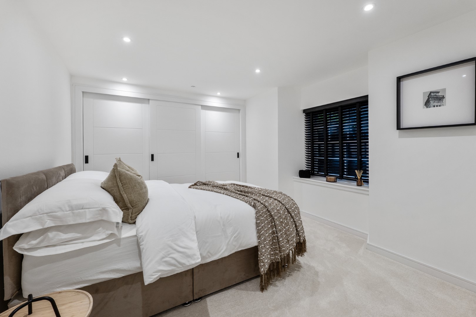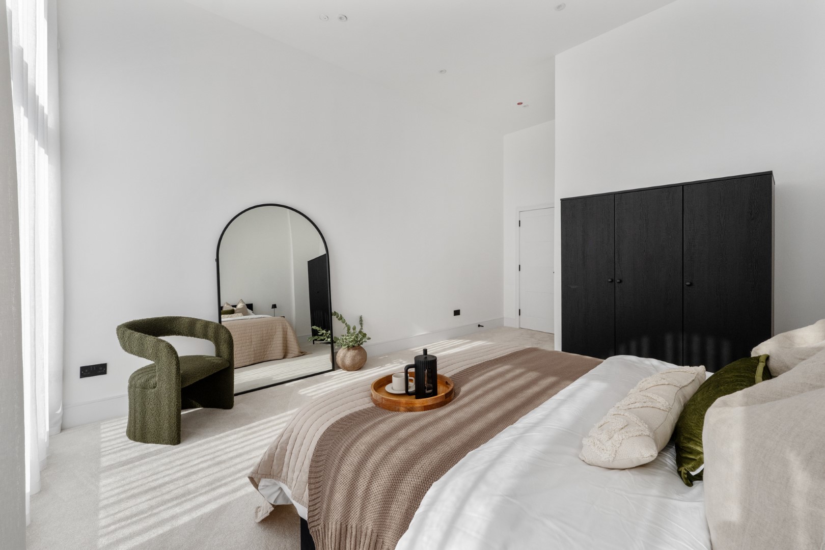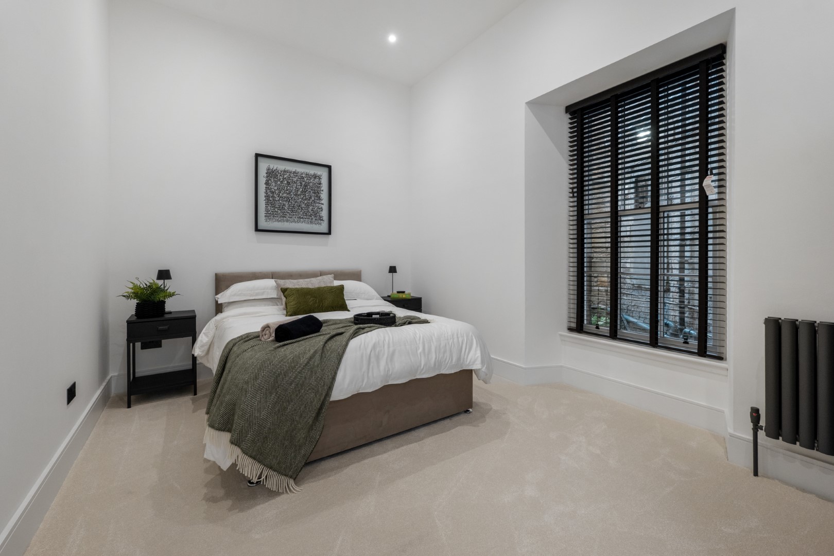 Accessed via its own private main door, the property opens into a dramatic reception hall — a beautifully versatile space currently used as an additional lounge and entertaining area. This level immediately impresses with its sense of style, light and sophistication, featuring a wood-burning stove, exposed original stone wall, arched sash windows, bespoke cabinetry, and a striking black Crittall-style door. Every detail has been carefully considered, with original features sitting effortlessly alongside bold, modern finishes. This level also hosts two generous double bedrooms, including the principal suite which benefits from dual windows, a luxurious en-suite shower room, and excellent storage. A stylish WC completes the accommodation on this floor.