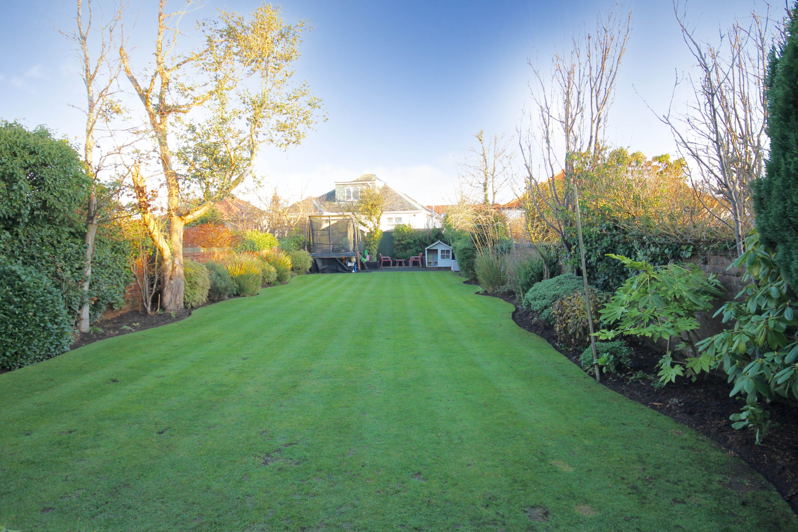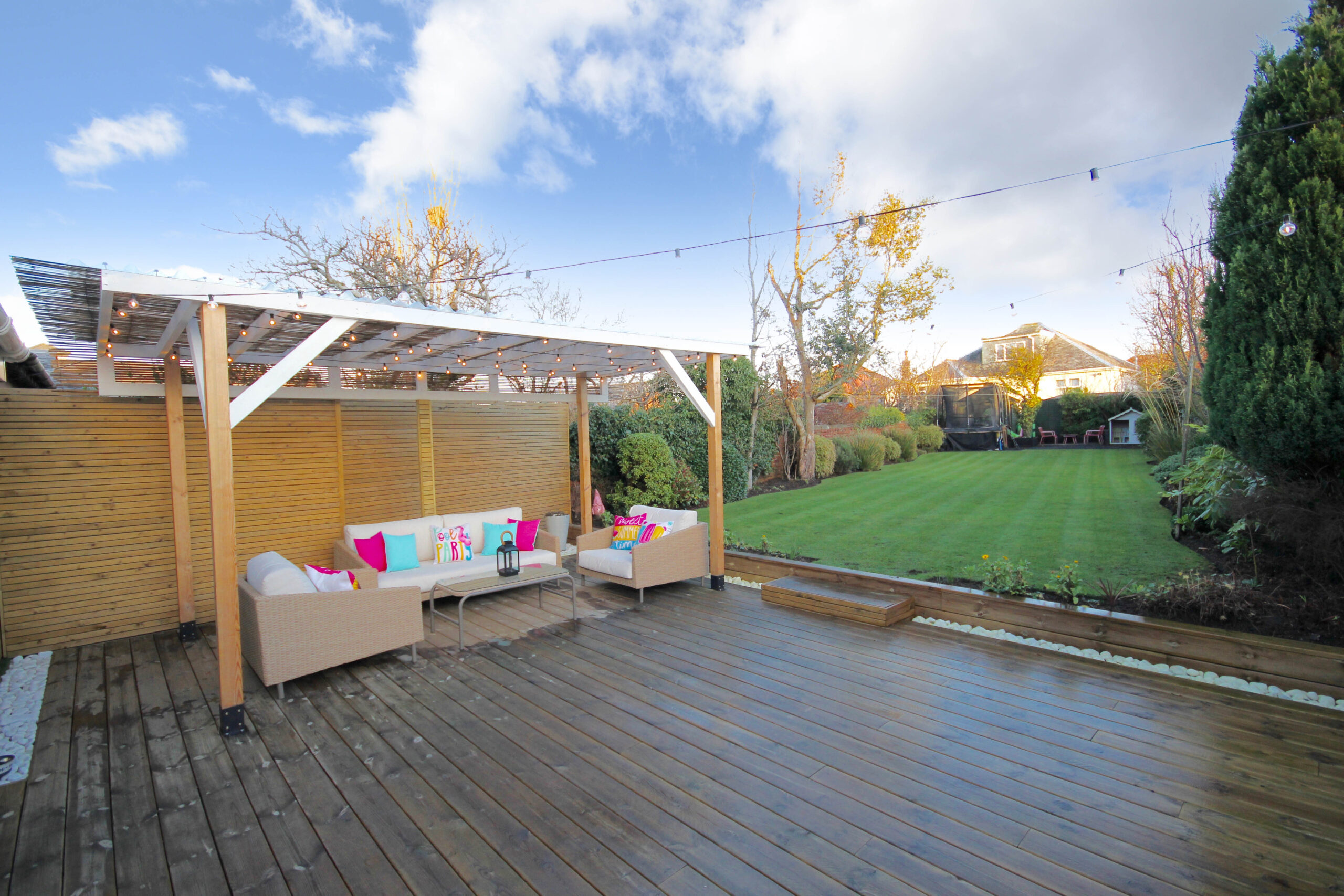 Externally the front garden is laid to lawn with shrubbery borders. To the side there is chipped driveway parking with space for several vehicles. The fully enclosed rear garden is predominantly laid to lawn with well stocked borders featuring mature plants and trees. From the double doors off the dining/family room there is a large deck which is partially covered and perfect for entertaining. To the side there an enclosed storage area with doors to the front and rear.
