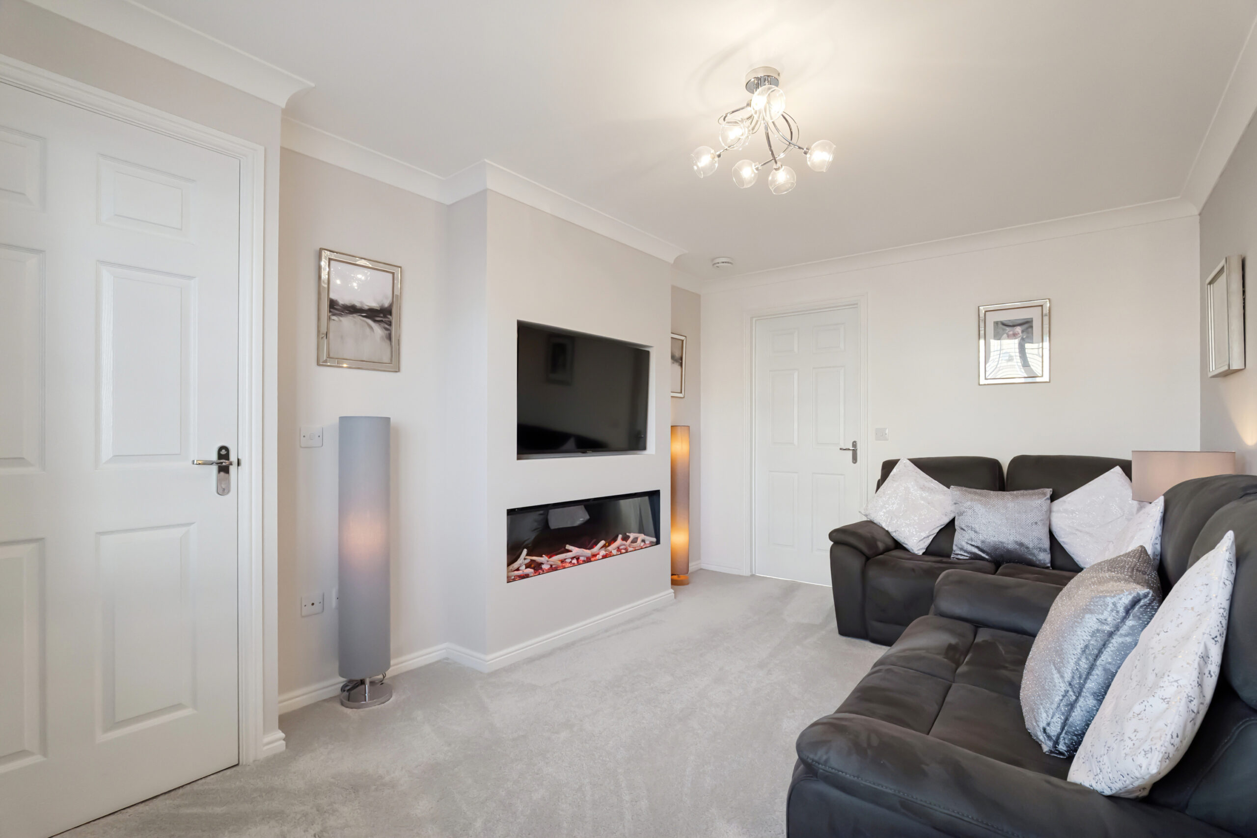 Approached via a generous front driveway providing ample off-street parking, entry into a welcoming front reception hall that leads to the front-facing lounge, enhanced by a beautiful media wall complete with an electric fireplace as the focal point. To the rear, the open-plan kitchen/diner is a bright and airy highlight, flooded with natural light and boasting ample room for both dining and lounge furniture. The modern kitchen is fitted with an excellent range of base and wall-mounted units, complemented by integrated appliances throughout. French doors open directly onto the landscaped rear gardens. A convenient guest W.C. is discreetly positioned just off the dining area.