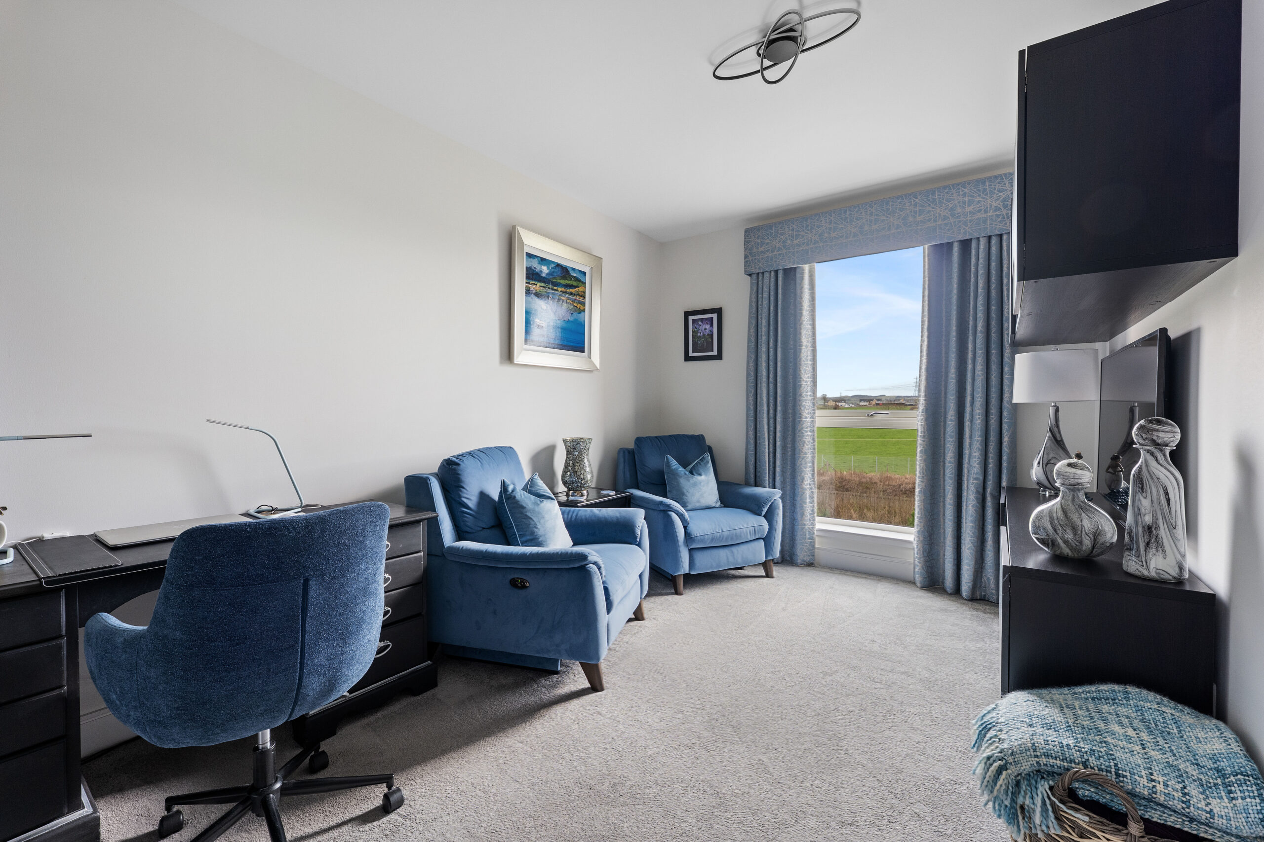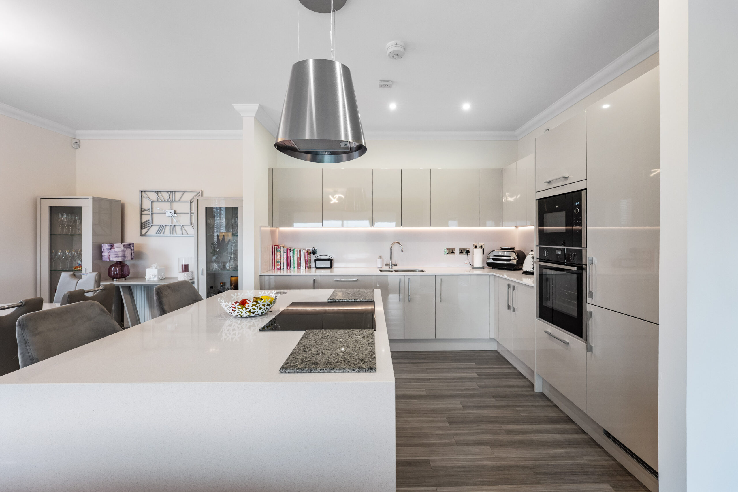 Lovely residents’ entrance with elevator access and private stairwell to the second floor. Larger style, private reception hallway providing excellent storage via three well appointed storage cupboards, built in utility room/laundry room with pulley and storage, outstanding lounge with large double glazed picture patio doors giving lovely aspects over surrounding countryside, the lounge is open to a dining area and modern integrated kitchen with a full range of Neff appliances, corian worktops, and extensive storage. The apartment has three bedrooms, principal bedroom with recently built in bespoke bedroom furniture and a magnificently styled en-suite bathroom with large walk in shower enclosure, two further double bedrooms, both with built in storage and the flat is completed by a stunning bathroom with full tiling and walk in shower.