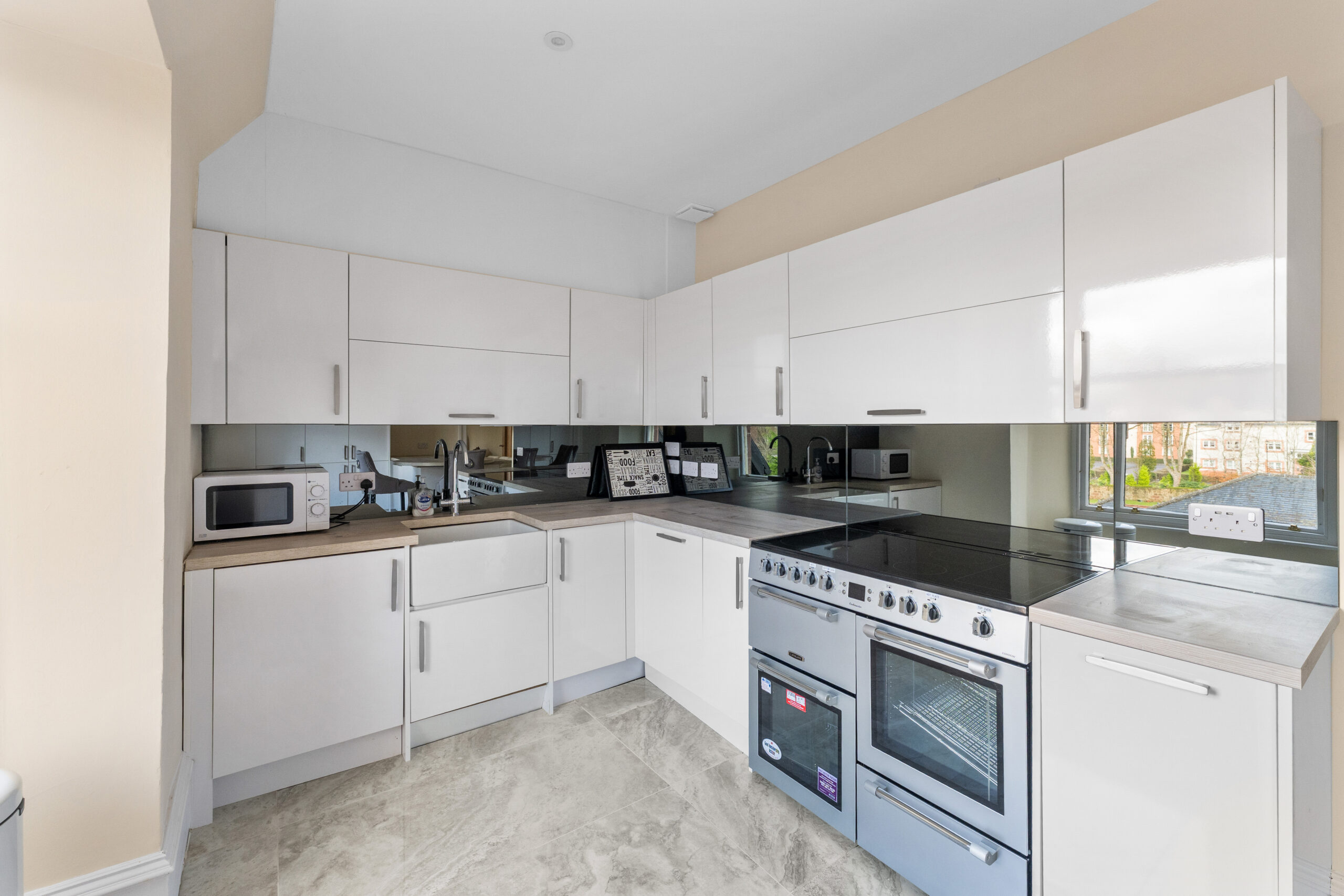 Upon arrival, residents are welcomed by extensive private grounds and a grand driveway leading to the front of the building. The communal hallway reflects the traditional character of the property, with access to just four apartments from this entrance. Internally, the accommodation comprises an entrance vestibule with a magnificent vaulted ceiling and ample storage. The formal lounge features a striking fireplace and two large picture windows overlooking the beautifully maintained gardens. The modern luxury kitchen is fitted with a full range of contemporary units and integrated appliances, leading through to a spacious family/dining room. Completing the first-floor accommodation is a well-proportioned bedroom with storage and a cloakroom/WC.