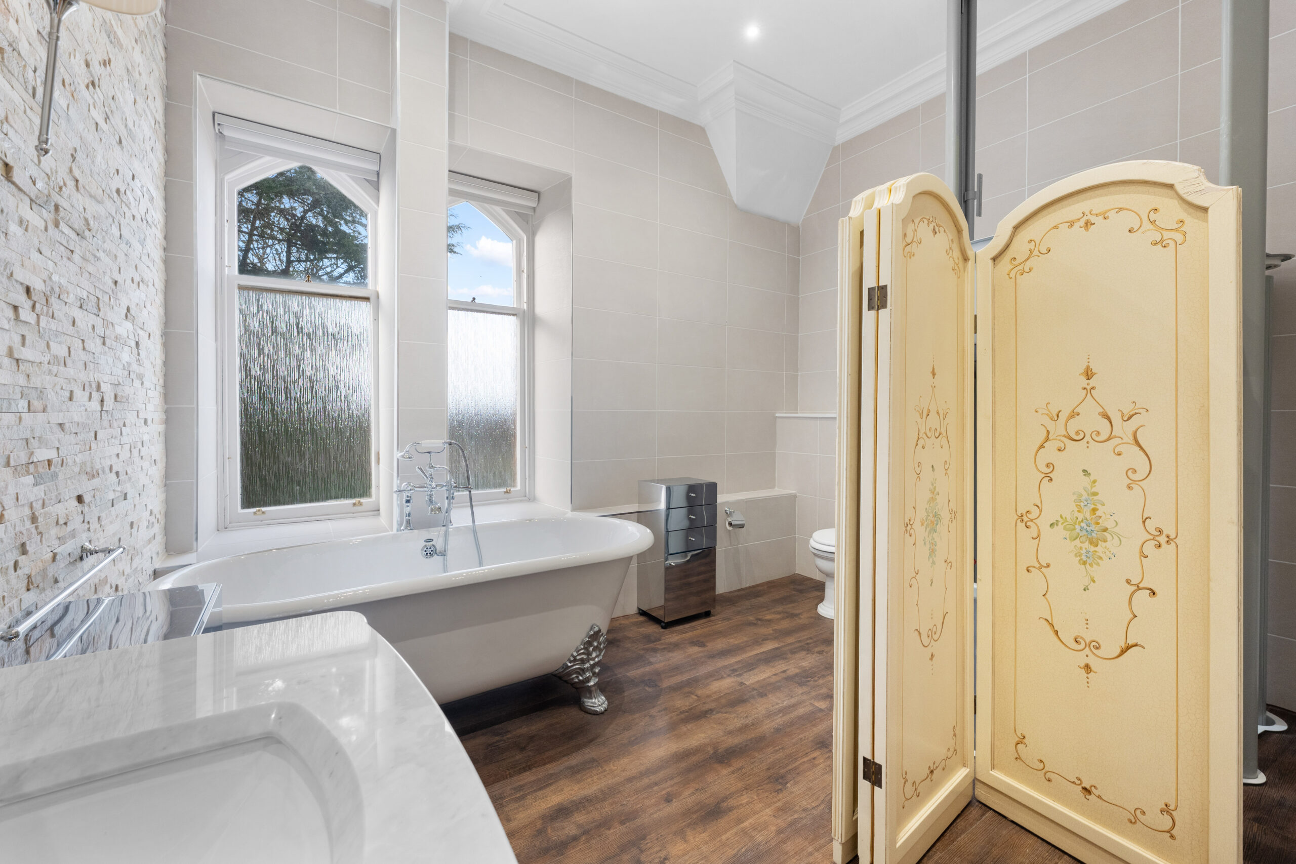 Access to the upper level is provided via a staircase from the hallway, as well as a vertical platform lift for accessibility. The stunning principal suite occupies the entire upper floor, offering a private and indulgent retreat. The generously proportioned bedroom spans over 20 feet and is bathed in natural light and features an impressive floor-to-ceiling bay window with beautiful views over the surrounding grounds. The luxury en-suite bathroom is a standout feature, elegantly appointed with high-quality fittings and finishes, and designed for comfort and relaxation. with statement bathtub, and refined detailing combine to create a spa-like atmosphere, perfect for unwinding in complete privacy.