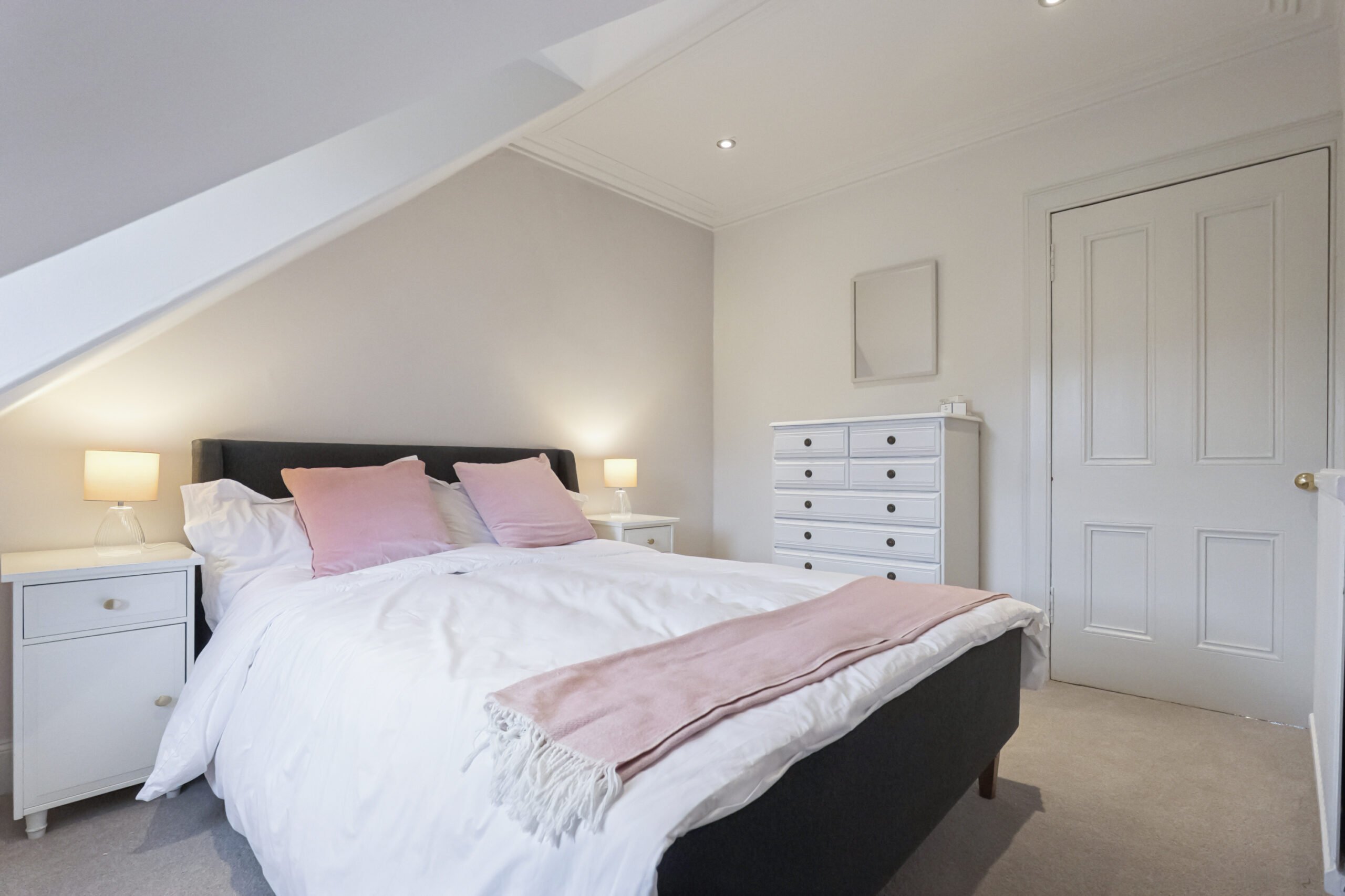 The upper level continues the theme of space and quality, hosting three generous bedrooms and a modern family shower room featuring a large walk-in shower and floating vanity unit. Bedrooms one and two are both well-proportioned rooms that enjoy the pleasant, open outlook over the front garden and field beyond. Bedroom three is overlooking the extensive rear garden, ensuring plenty of natural light and privacy.