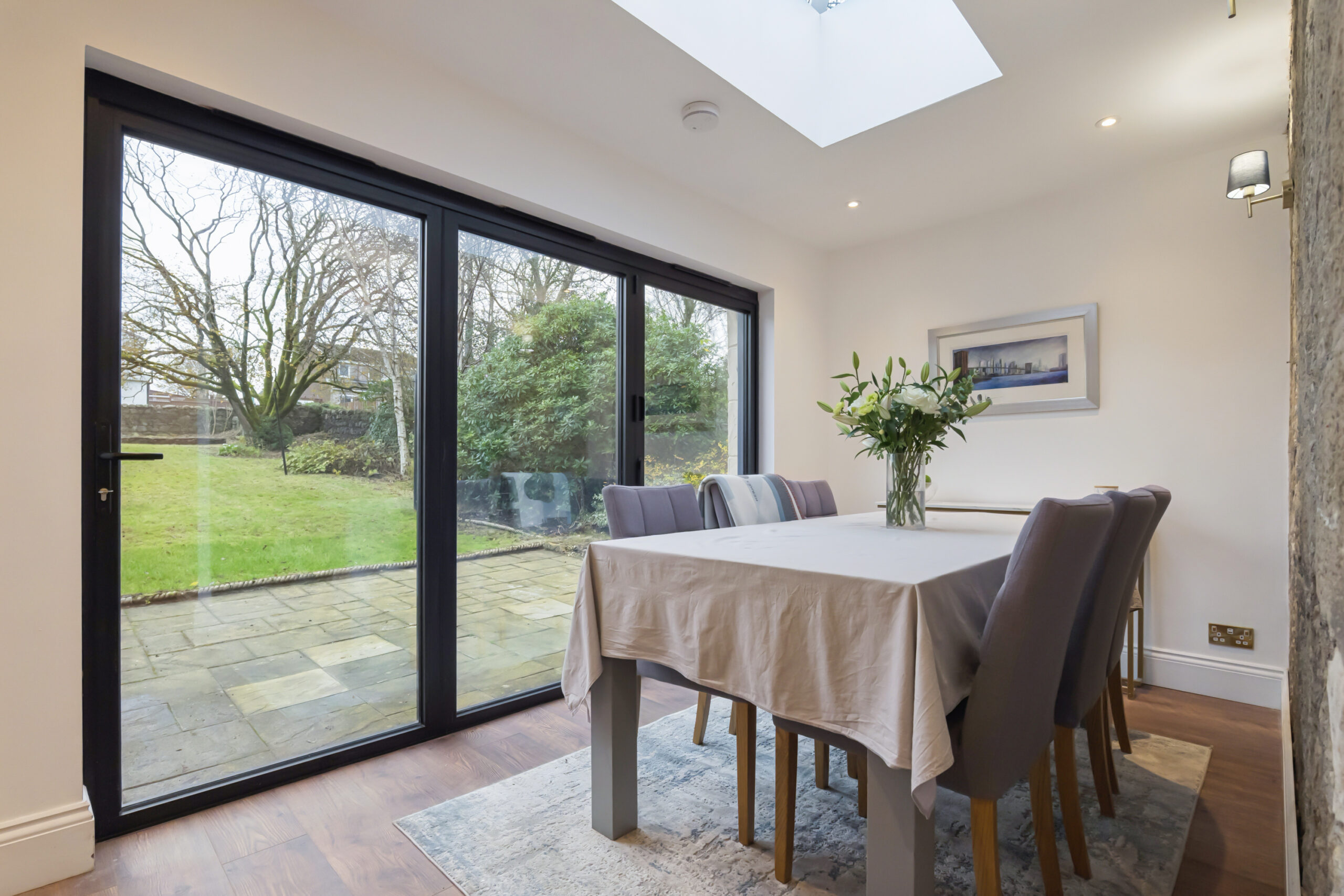 Entry is through stylish storm doors into a charming entrance vestibule, featuring a classic mosaic floor. The main reception hall, with its elegant staircase, provides access to all ground floor rooms. To the front, the bay-windowed lounge is a bright and inviting space, overlooking the field to the front. It retains a wealth of character with a feature fireplace, traditional wood flooring, and ornate cornice detailing. The magnificent open-plan kitchen and dining area is the heart of the home, brilliantly extended to the rear to create a lovely, social space. Fitted with a sleek, contrasting kitchen featuring a large central island, integrated appliances, and gold accents, the room is flooded with light from bifolding doors that open seamlessly to the garden. A handy boot room provides practical access, while a versatile fourth bedroom, located at the front, features a charming fireplace and press cabinet. Completing this level is a beautiful three-piece bathroom, finished with lovely wall panelling and a classic roll-top bathtub.
