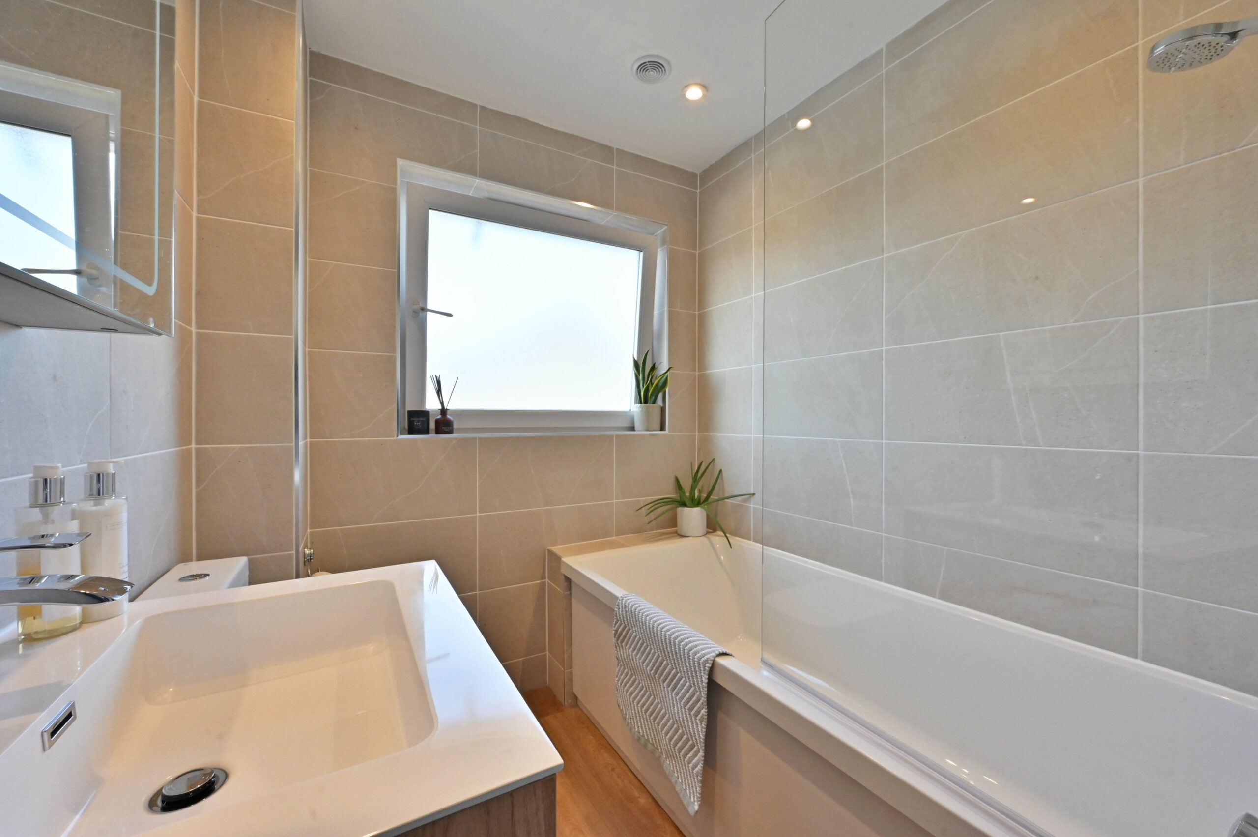 Upstairs, the landing gives access to two excellent double bedrooms. The principal bedroom benefits from a large store cupboard and fitted wardrobes, while a useful linen cupboard is conveniently located on the landing. The family bathroom is modern and well-appointed, featuring a three-piece suite with an over-bath shower.