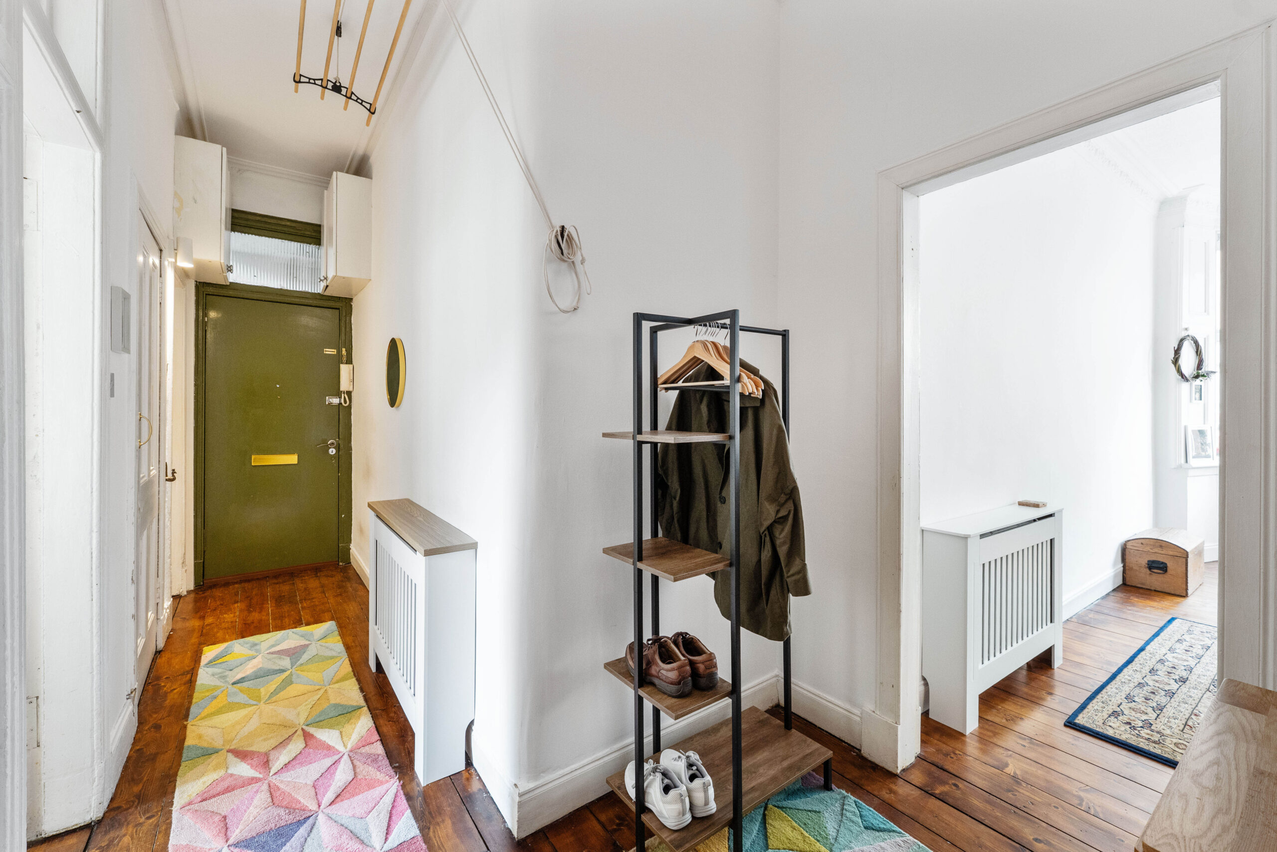 The specification includes stripped original floorboards and cornicework, gas central heating, audio door entry system and UPVC double glazing to front and rear. From the entrance close, a rear door provides access to a communal garden area with bin storage facilities.
