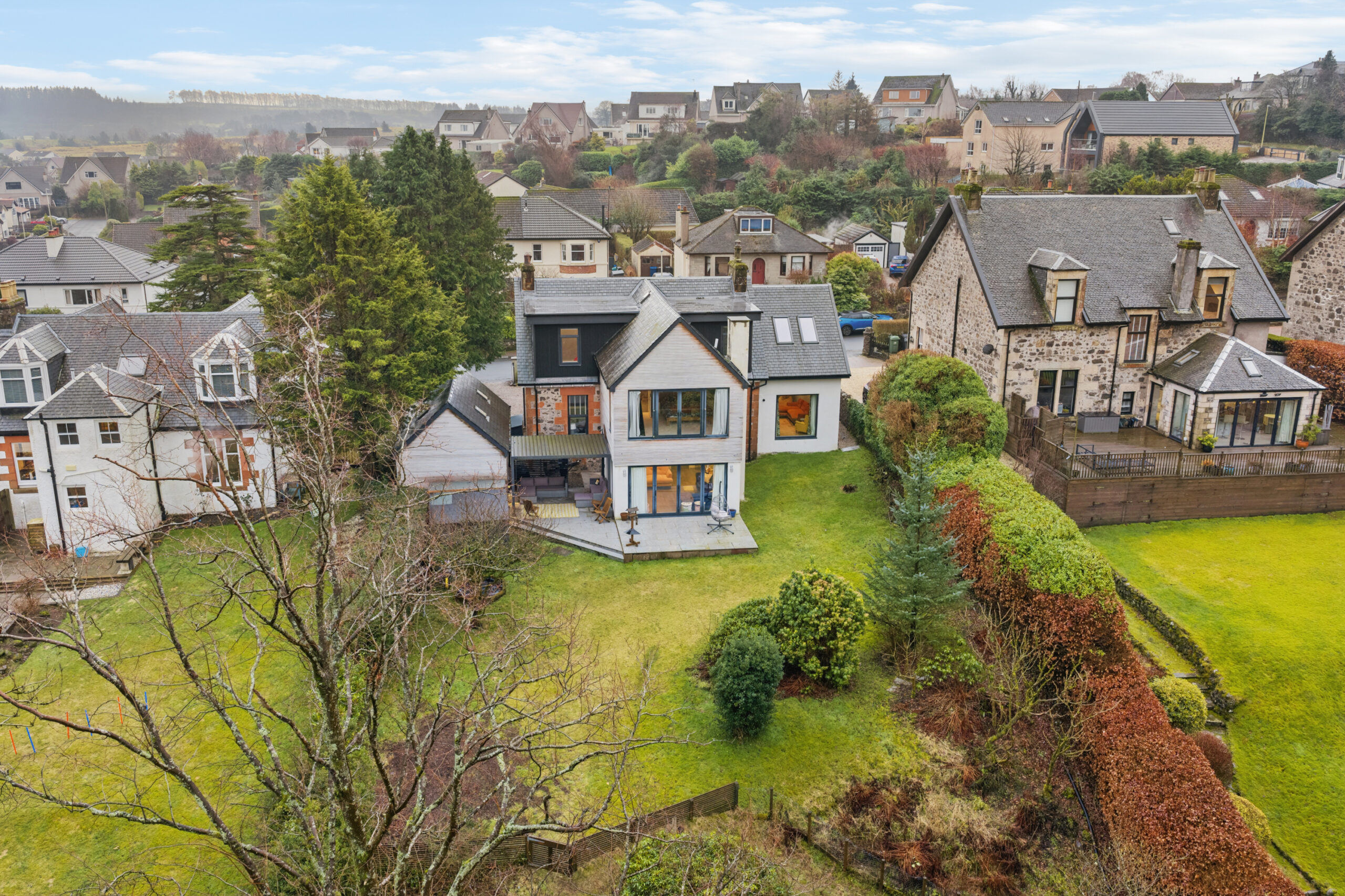 A beautiful home positioned in extensive gardens on Donaldfield Road in the upper village of Bridge of Weir. The mature gardens provide an amazing space to entertain and for children to explore with views to the surrounding countryside. A large, refurbished garage provides an additional activity space linked to the main house by a Pergola with a terrace for outdoor dining. The rear garden is screened by mature hedgerow and trees with a lawn that extends over the Pow Burn to a wild garden area.