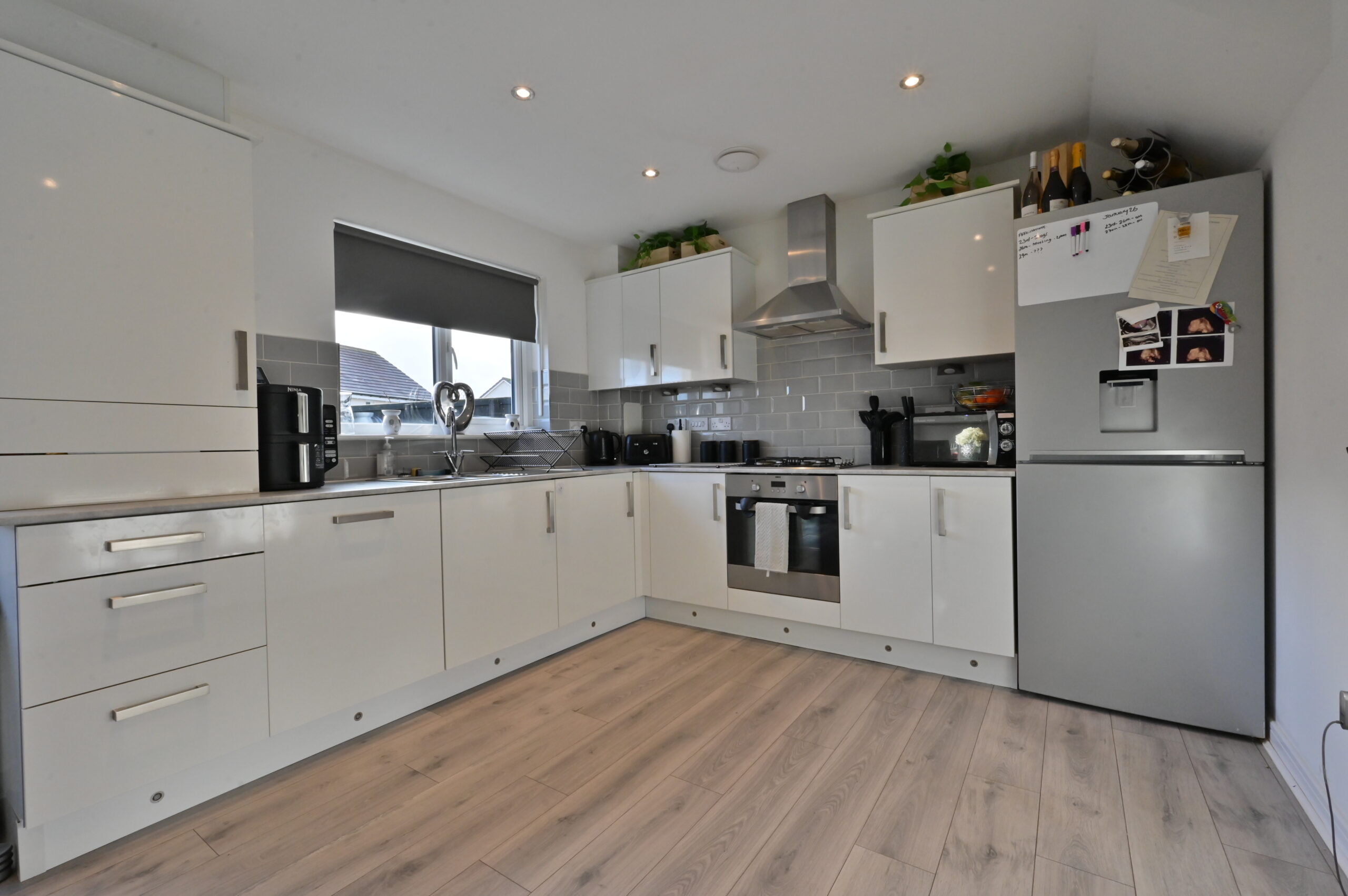 This beautifully presented home is enhanced by contemporary dark wall panelling with mood lighting to both the lounge and landing, creating a stylish and cohesive feel throughout. The lounge benefits from a striking focal media wall featuring an electric fireplace, while the fully integrated modern kitchen offers quality appliances for effortless everyday living. French doors from the dining area lead directly to the garden, and the generous bedroom proportions are complemented by fitted mirrored wardrobes to two of the bedrooms. Additional conveniences include a ground-floor w.c. and a family bathroom with an over-bath shower.
