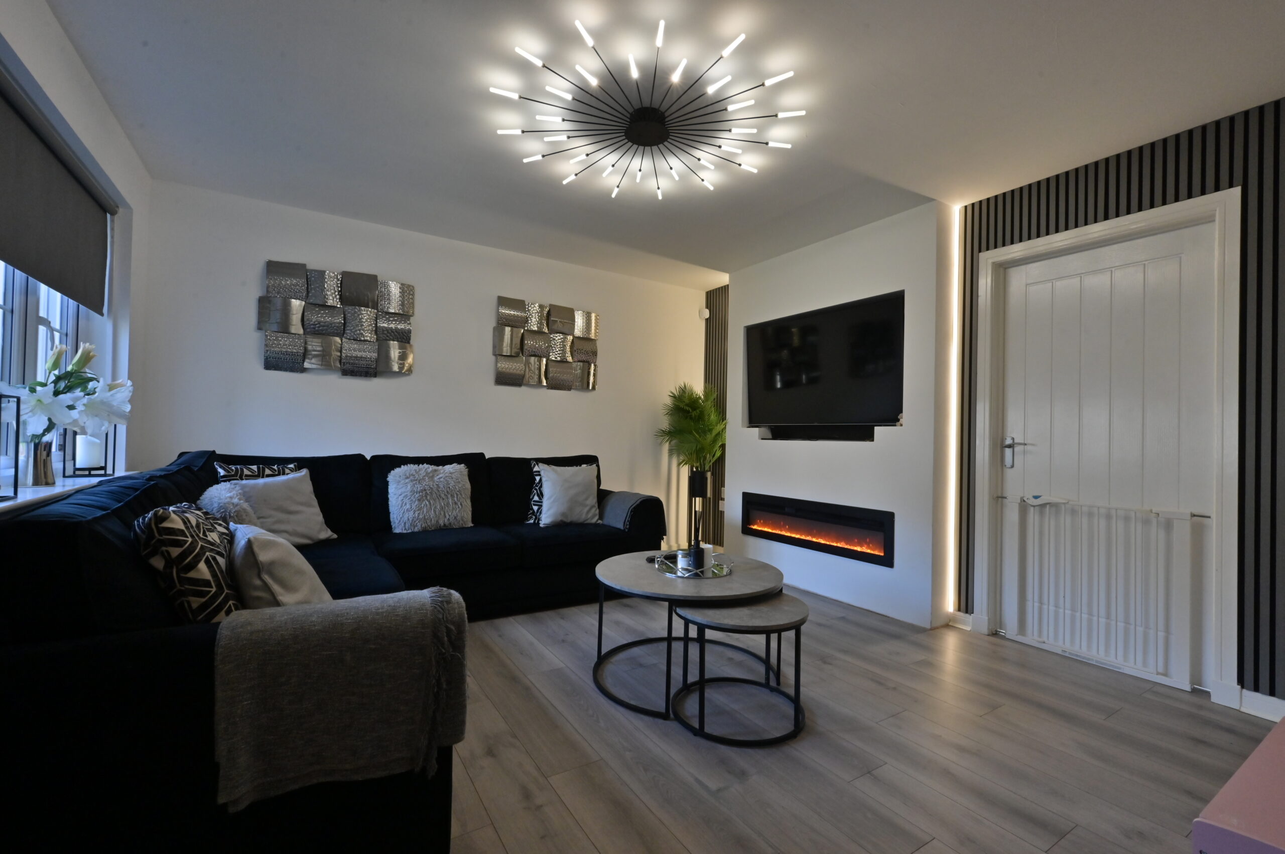 Entry is via a welcoming reception hall with a convenient ground floor w.c. just off. The spacious lounge to the front features a striking focal point media wall complete with an electric fireplace and elegant contemporary wall panelling. To the rear, the bright kitchen-diner is fitted with a range of sleek modern base and wall mounted units, complemented by stylish worktops and integrated appliances throughout. The dining area benefits from French doors that open directly onto the rear garden.