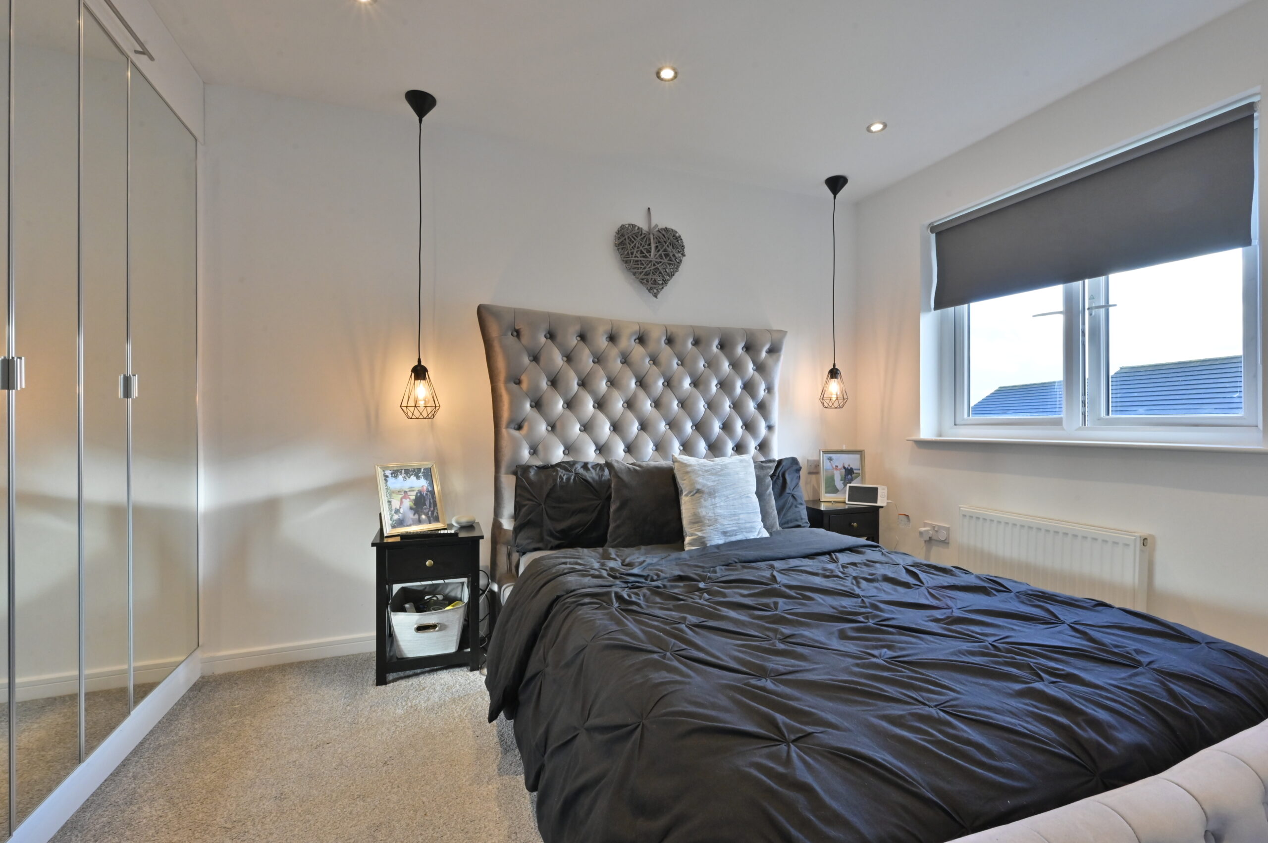 Ascending to the upper level, the landing continues the contemporary theme with matching dark panelling and subtle lighting. The home boasts three generous bedrooms. Bedrooms one and two both benefit from fully fitted mirrored wardrobes, providing ample, stylish storage, while bedroom three includes a useful storage closet. The family bathroom serves the floor with a modern three-piece suite, including an over bath shower.