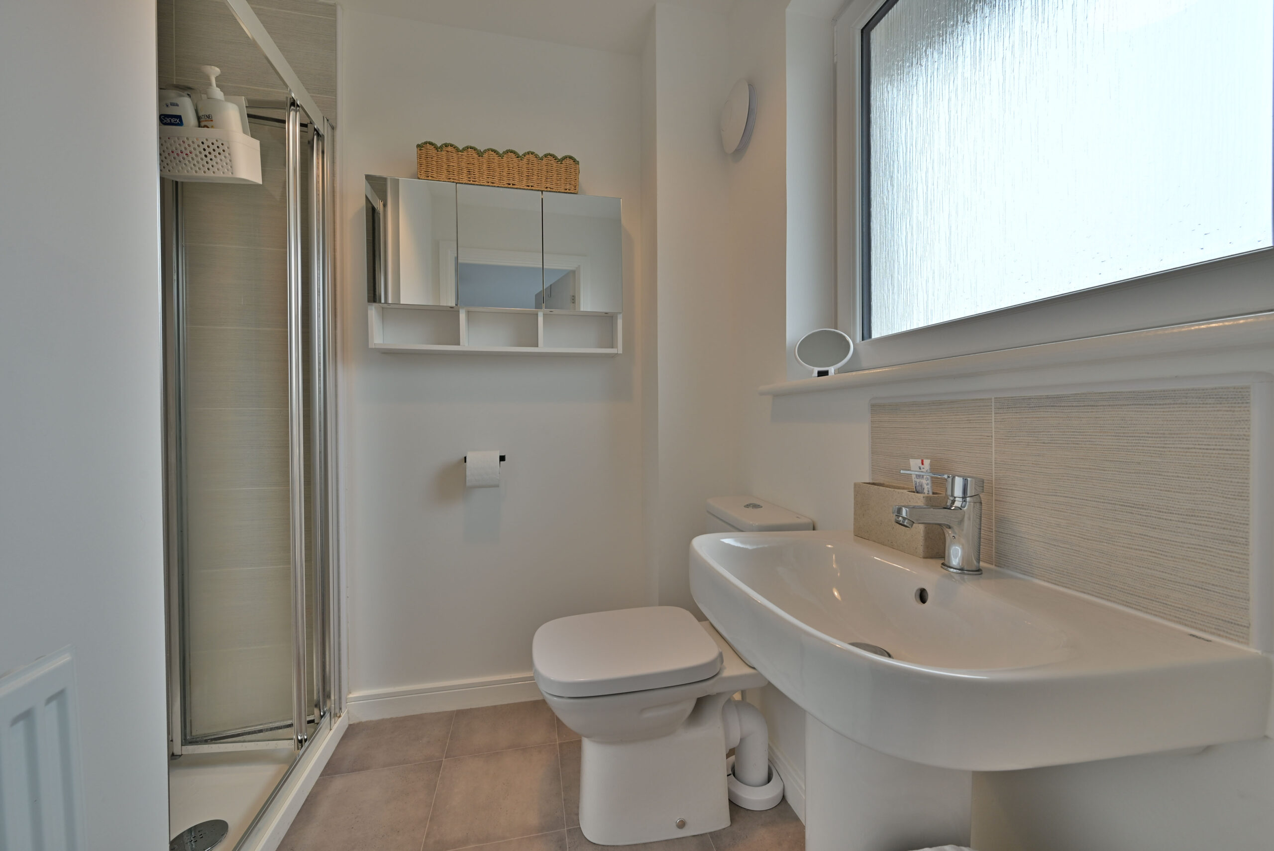 On the upper floor of the property there is a central hallway with entry to all three bedrooms. The principal bedroom features fitted wardrobes and a lovely en-suite shower room. The second double bedroom has fitted wardrobes and the third bedroom views over the rear garden. The Bathroom is partially tiled and has a modern three piece suite in white. The specification of this home includes a gas fired central heating system and double glazing to external windows.