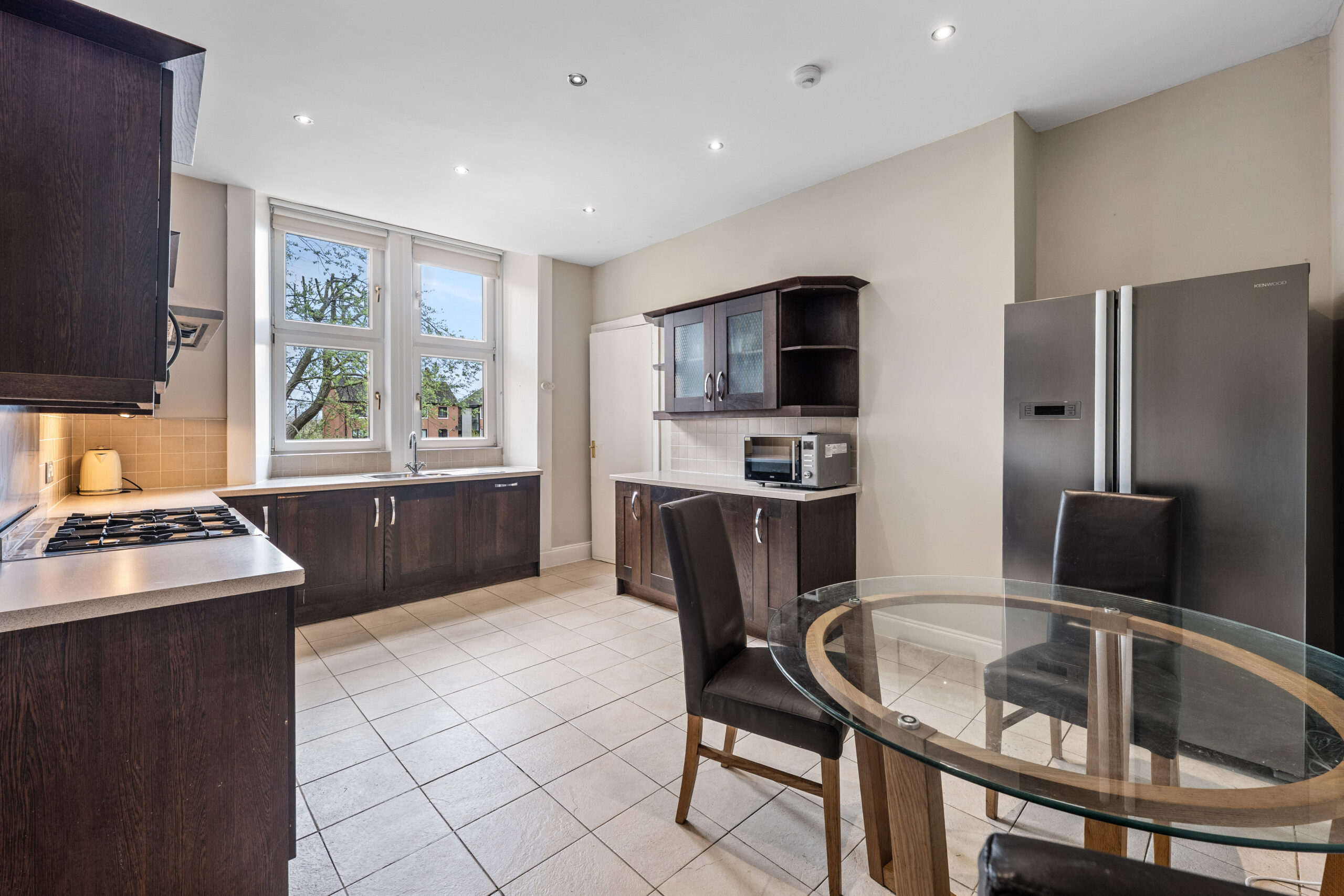 The accommodation in brief; resident’s stairwell to first floor level, private vestibule through storm doors, broad reception hallway with two storage cupboards and a bay windowed lounge with a focal point fireplace. There are then four flexible double bedrooms, one of which is currently used as a formal dining room and a fresh three piece bathroom suite with a mains powered shower above the bathtub. A fitted dining kitchen provides floor and wall mounted cabinetry, ample space for table and chairs and integrated appliances.