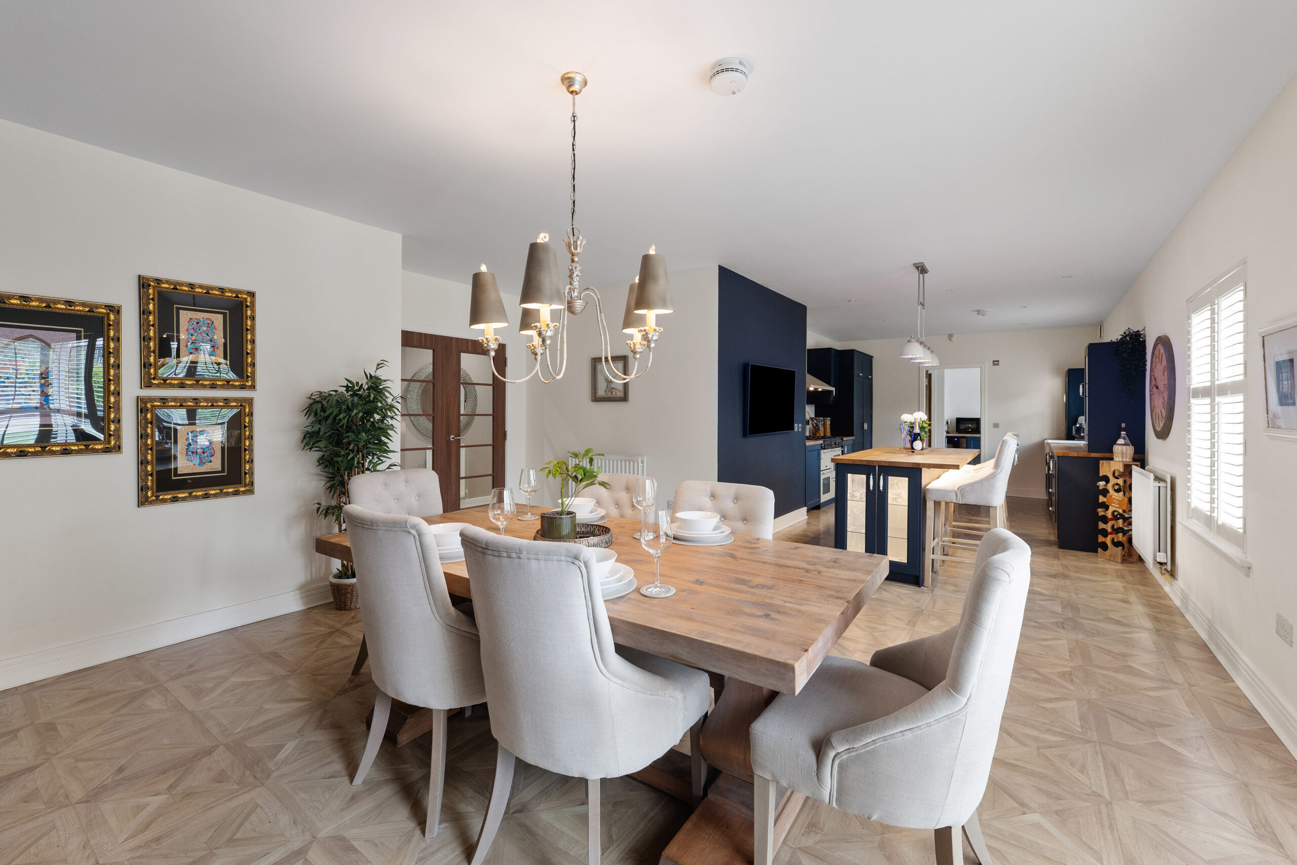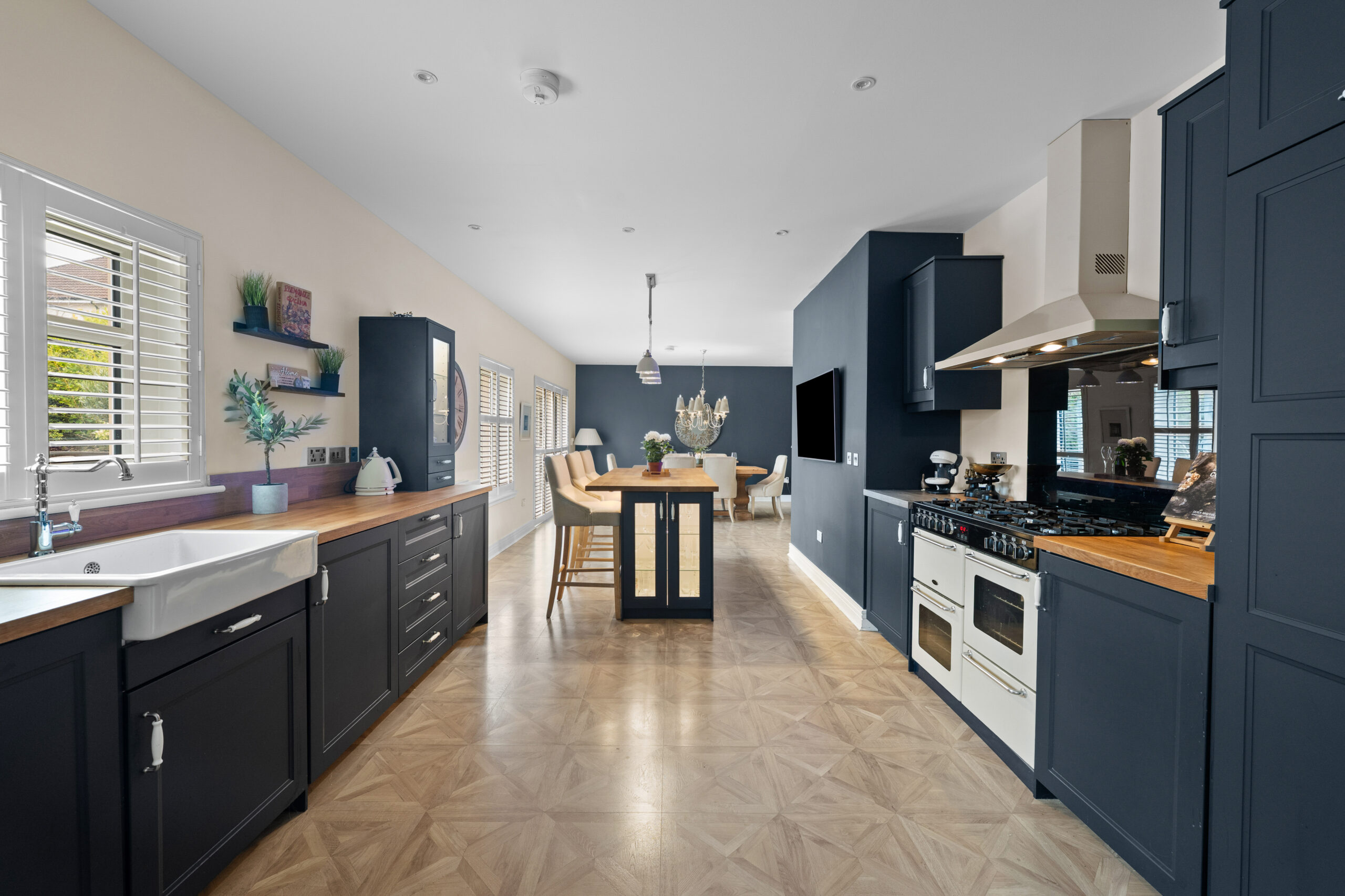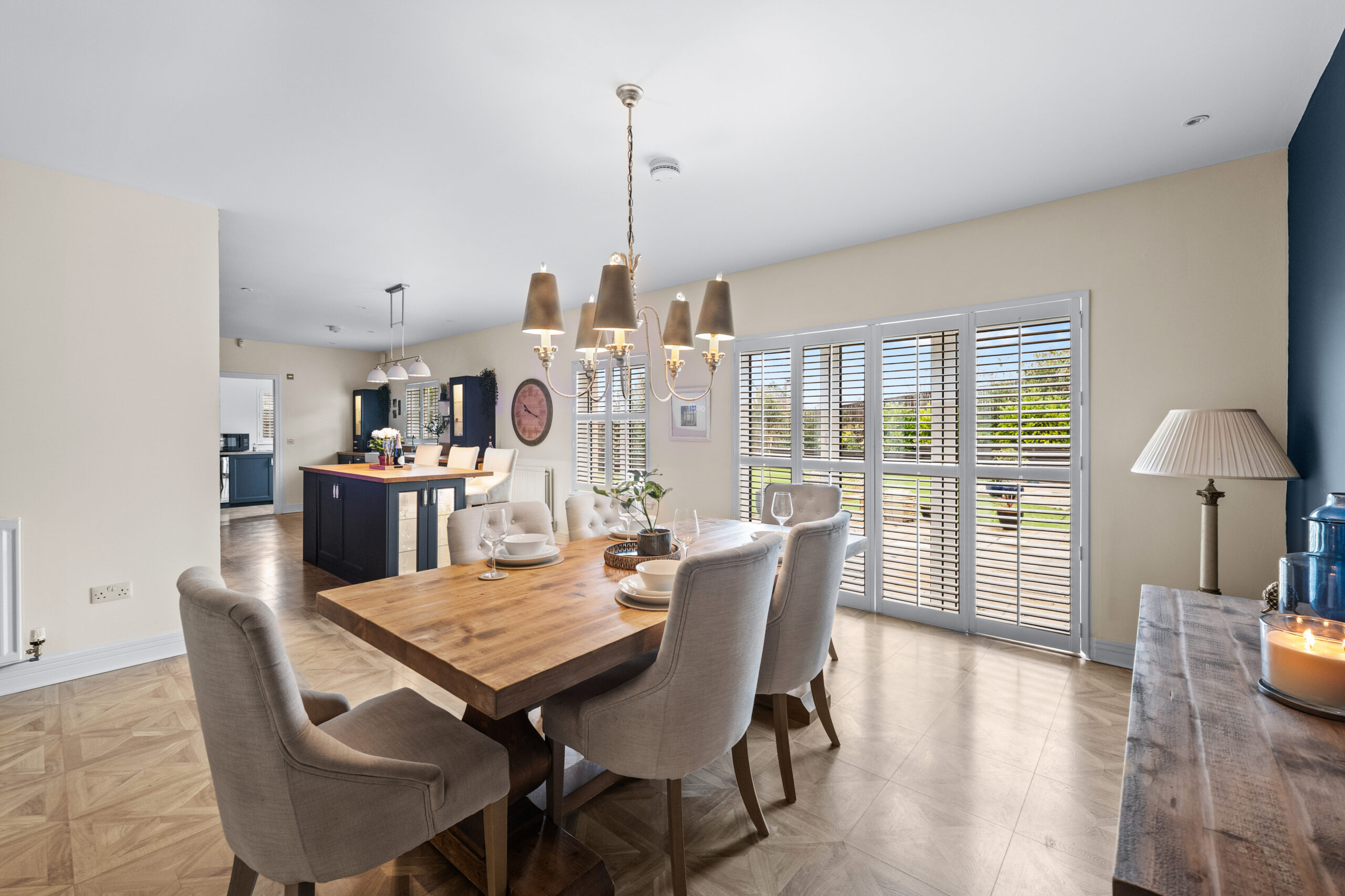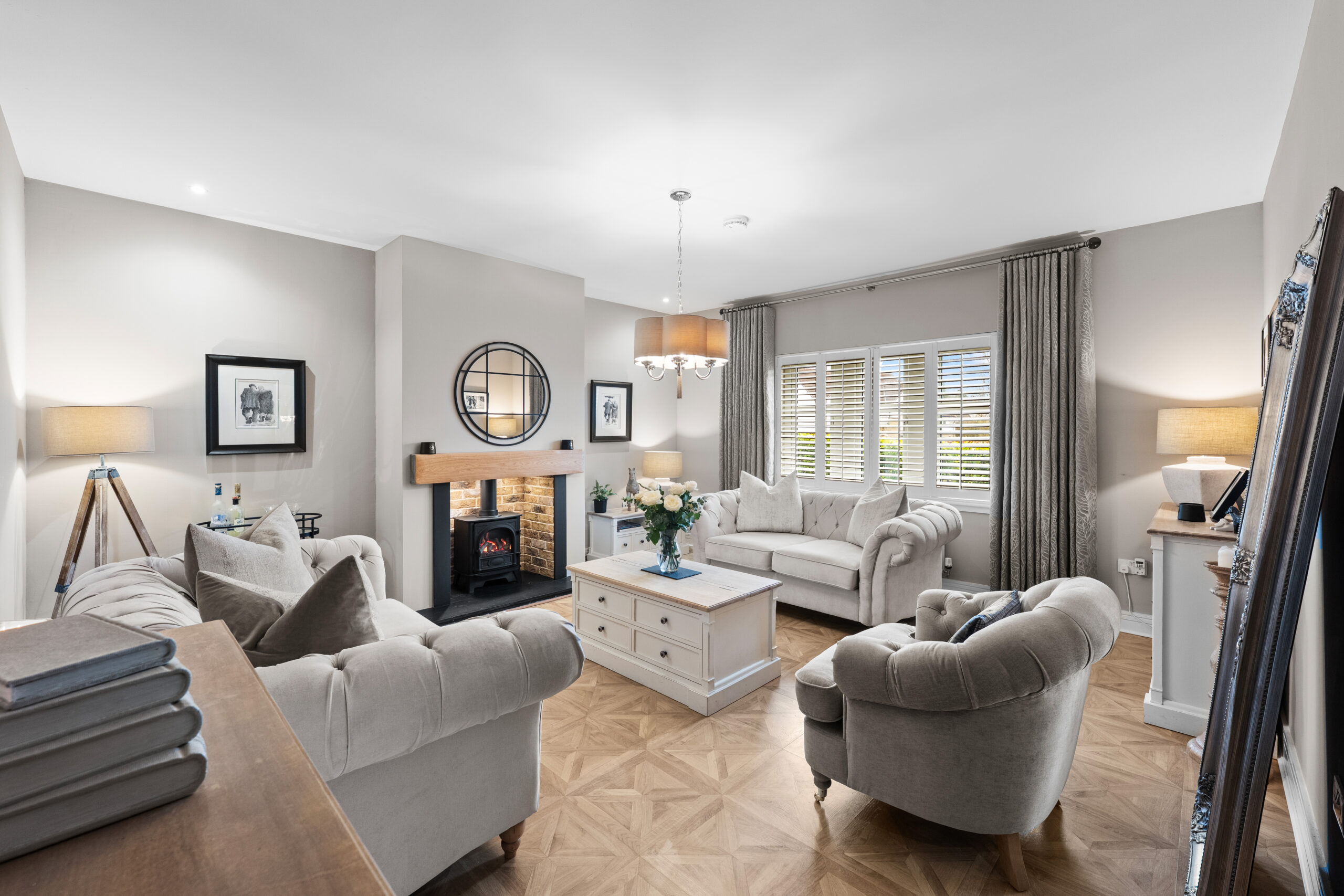 A bright and welcoming reception hallway sets the tone on arrival, leading to an impressive front-facing lounge complete with feature gas stove. The heart of the home is the reimagined open plan kitchen and dining space - an exceptional setting for both everyday living and entertaining. The contemporary kitchen connects seamlessly to a practical utility room, while the dining area enjoys a generous footprint and opens via bi fold doors onto the rear garden. A ground floor WC and integral access to the large double garage further enhance day to day convenience.
