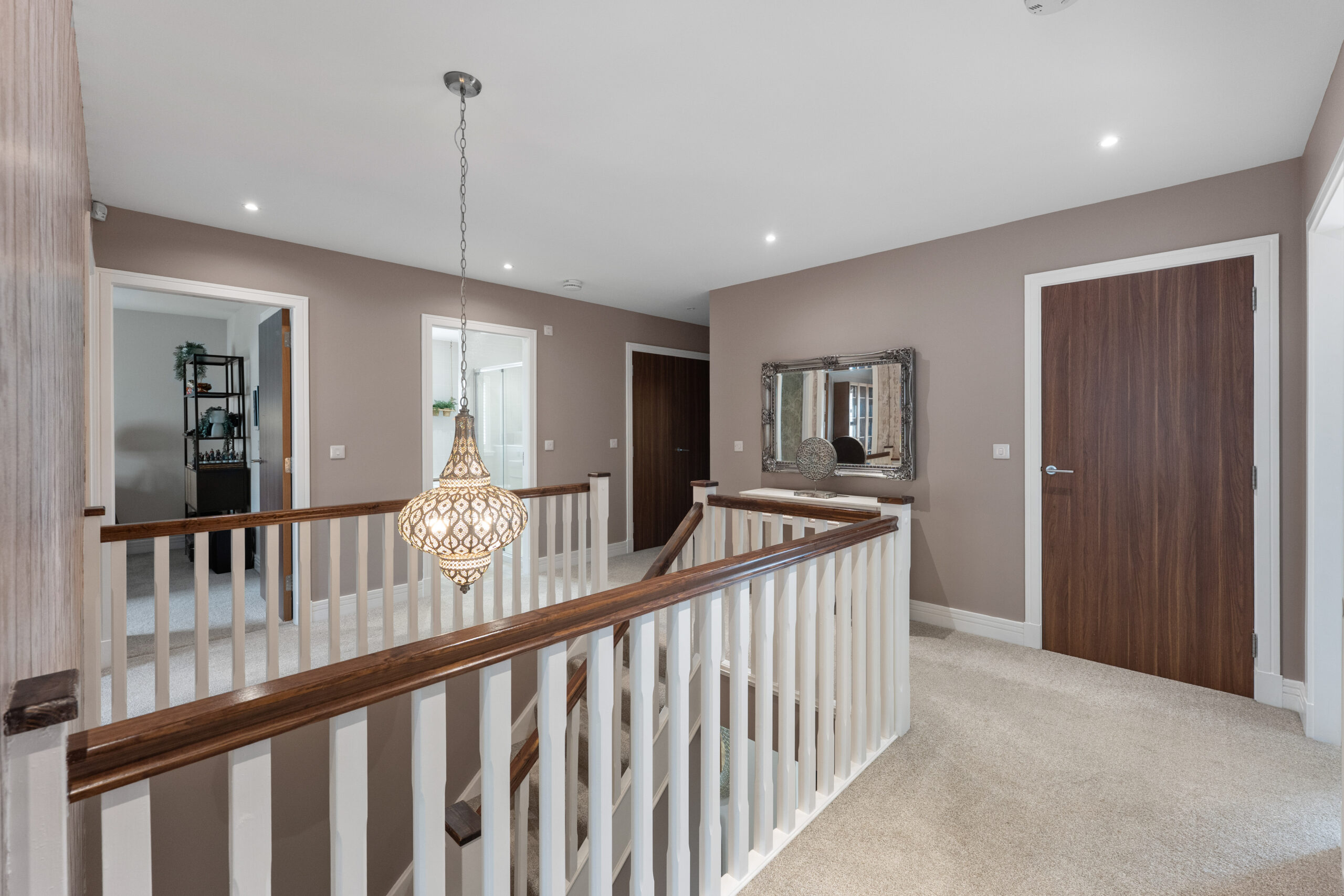The upper level offers a spacious and light-filled landing leading to a luxurious principal suite with fitted wardrobes, a Juliet balcony, and a large en suite featuring double vanity and walk in shower. Two additional bedrooms also benefit from fitted wardrobes and private en suite shower rooms. The remaining bedrooms offer excellent flexibility for a home office, nursery, or guest accommodation. A well appointed family bathroom completes this level. The home is finished to a high standard throughout and benefits from gas central heating, double glazing, and thoughtfully designed outdoor space.