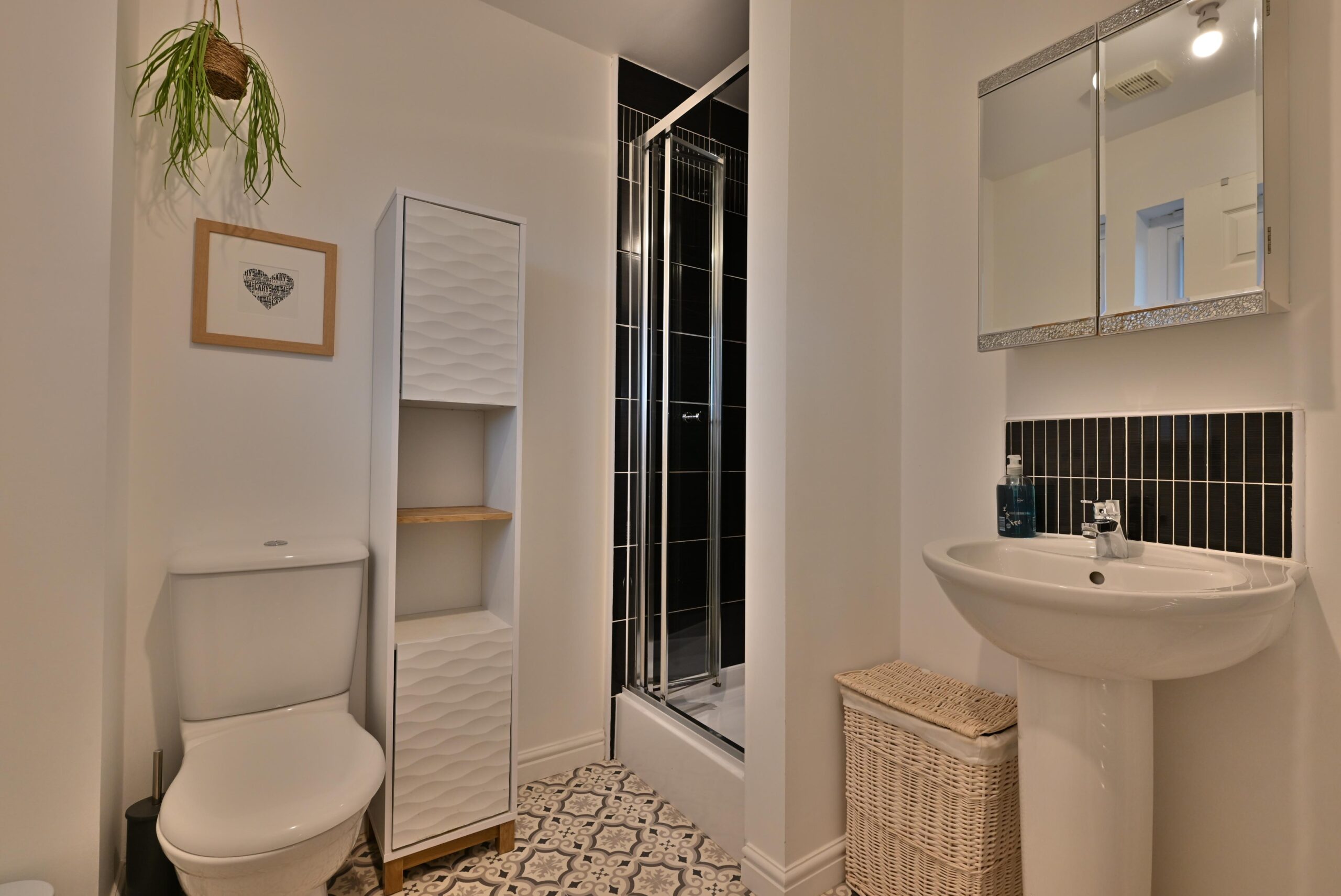 On the upper floor of the property there is a central hallway with a storage cupboard and a hatch giving access to the attic. The principal bedroom suite has fitted wardrobes providing storage and a modern ensuite shower room. The second and third double sized bedrooms both share access to a Jack and Jill style modern ensuite shower room and bedroom three also has fitted wardrobes. There is a fourth bedroom with window formation to the rear. The family bathroom has a three piece suite including a WC, wash basin and bath. The specification of this modern home includes a gas fired central heating system, double glazing to external windows, an integral single garage and an electric car charger.
