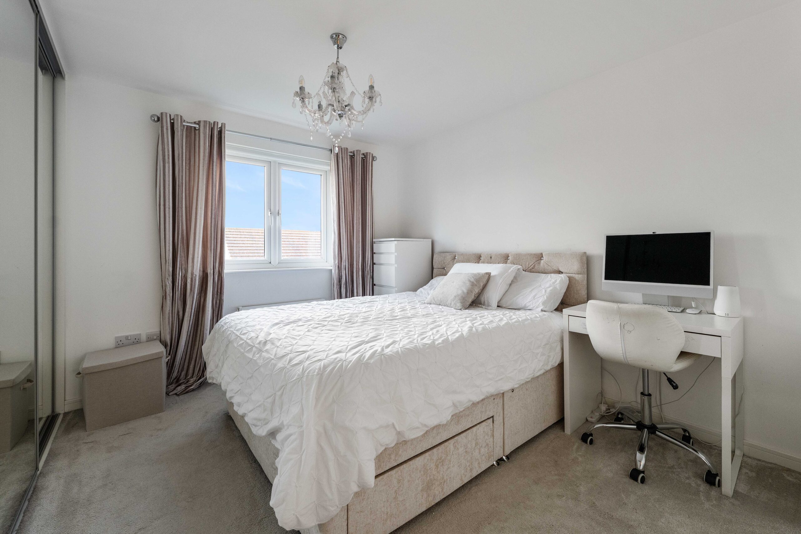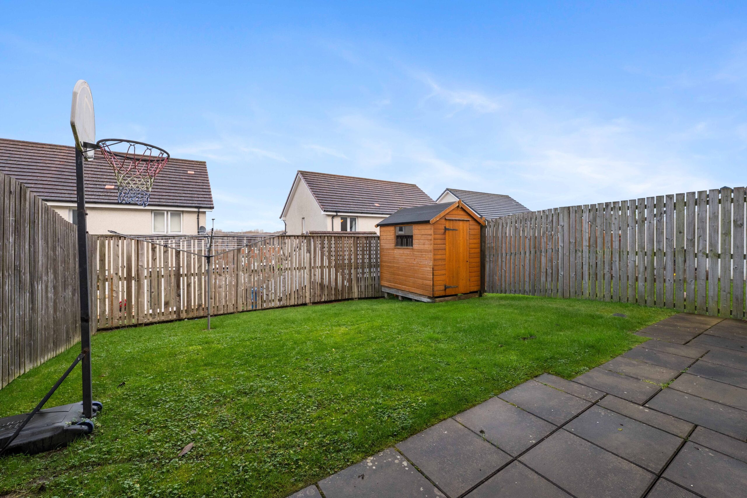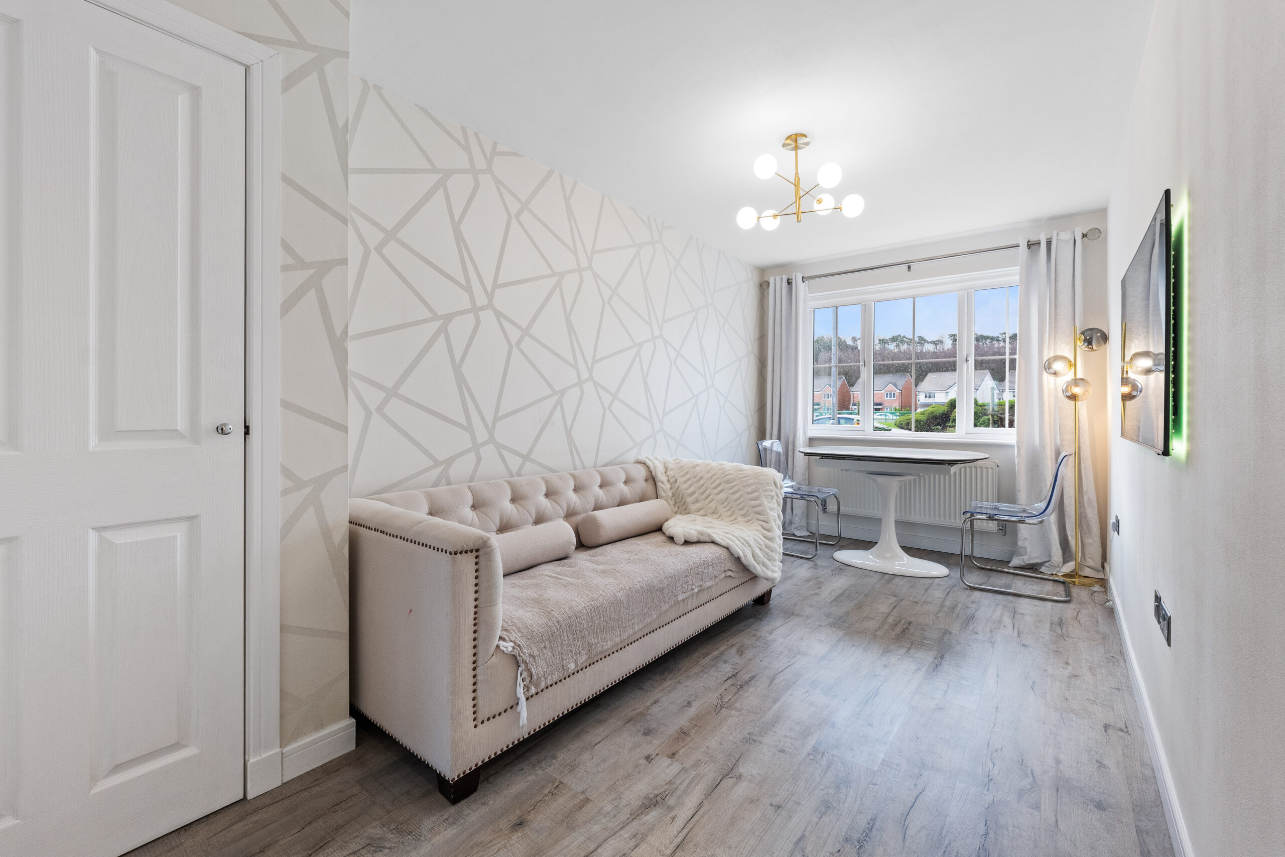 Further specification includes glazed internal doors, chrome internal door handles, chrome sockets, integrated fridge/freezer. All three bathrooms/WCs have full wall mirrored, chrome towel rail, tiled with chrome trim, full wall height tiled in bathroom and en-suite, electric shower in main bathroom, porcelain tiles. Chrome finished down lights in the kitchen and all three bathrooms. New kitchen units and flooring (2024). Garage from conversion with all Bellway materials and finishing (skirting, glazed door, facings, brickwork and mullions) and custom built archway. Extended slabbing beyond builders specification outdoors.