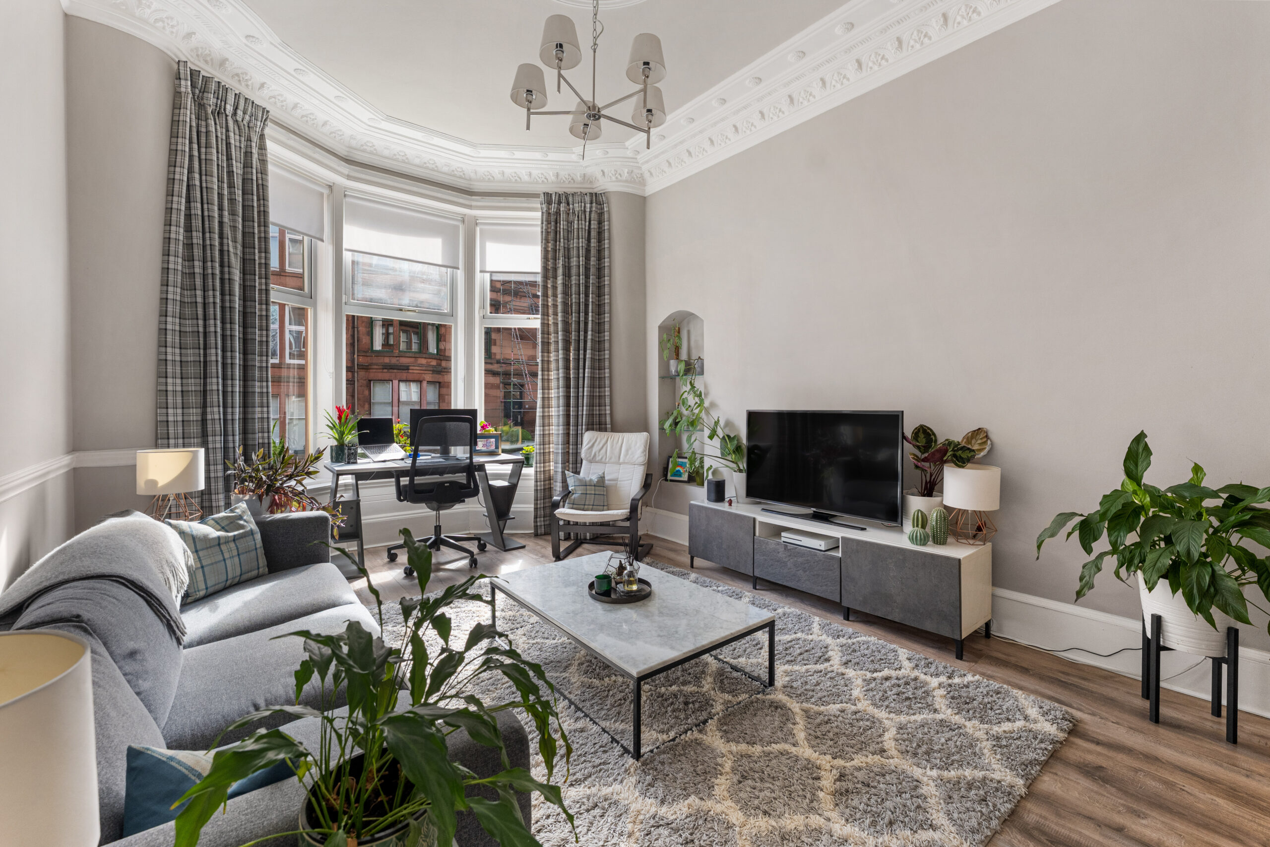 This terrific tenement flat has its own front garden in an evergreen pocket of the bustling Shawlands district.