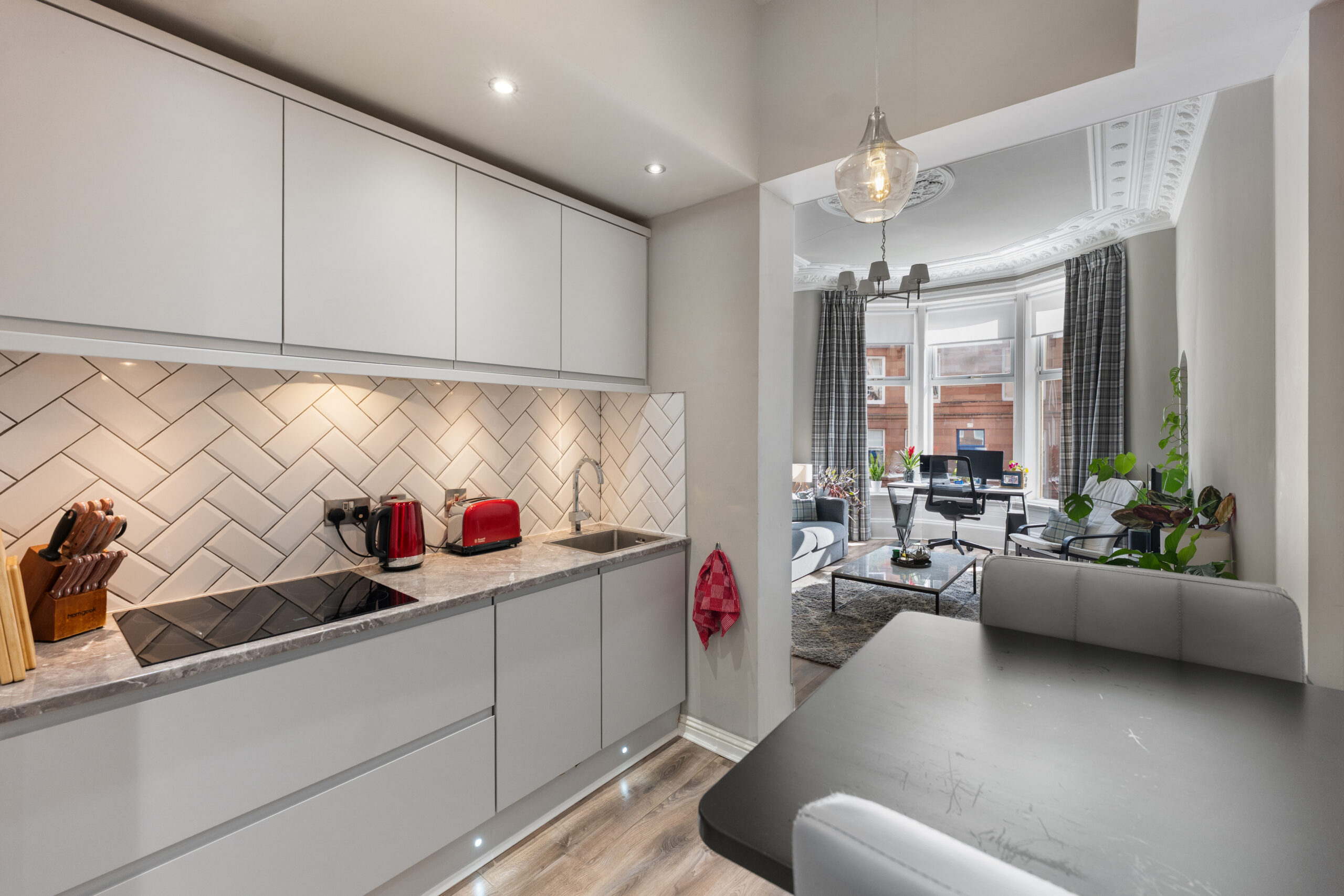 17 Grantley Gardens is in very close proximity to thriving shops, bars, coffee houses, bakeries and restaurants. Sainsburys, Tesco, Co-op and M&S stores are all within half a mile of the property. The fringe of Queens Park hosts a Farmers’ Market twice a month whilst recreational space, tennis courts and football pitches are readily available within the park. Shawlands Civic Square is also nearby, designed to offer a destination for markets, dance, craft events, speakers and debate.