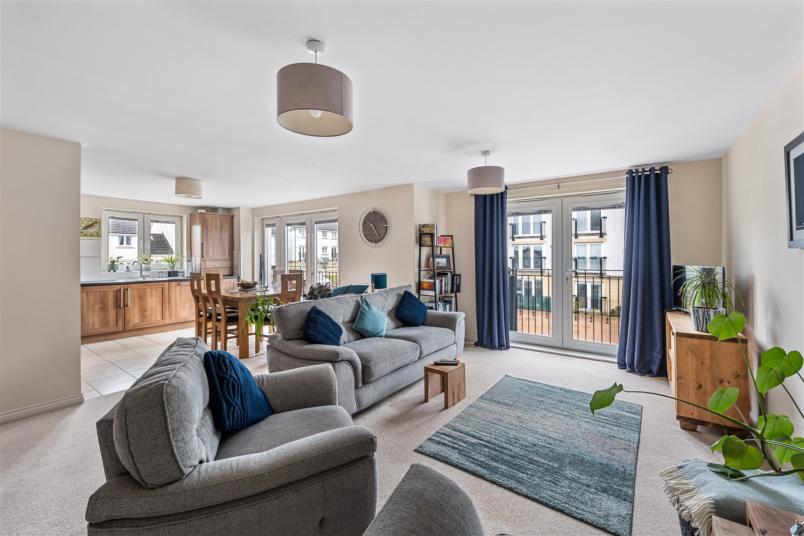 The building is accessed via a secure entry system, leading into an immaculately maintained communal hallway. Internally, the property opens into a welcoming reception hall with excellent storage. The impressive open-plan lounge enjoys triple aspects and features a Juliette balcony, with open aspects across the development, creating a bright and airy living space. The adjoining contemporary kitchen is thoughtfully designed, complete with integrated appliances, quality base and wall-mounted units, and ample space for dining—perfect for both everyday living and entertaining.