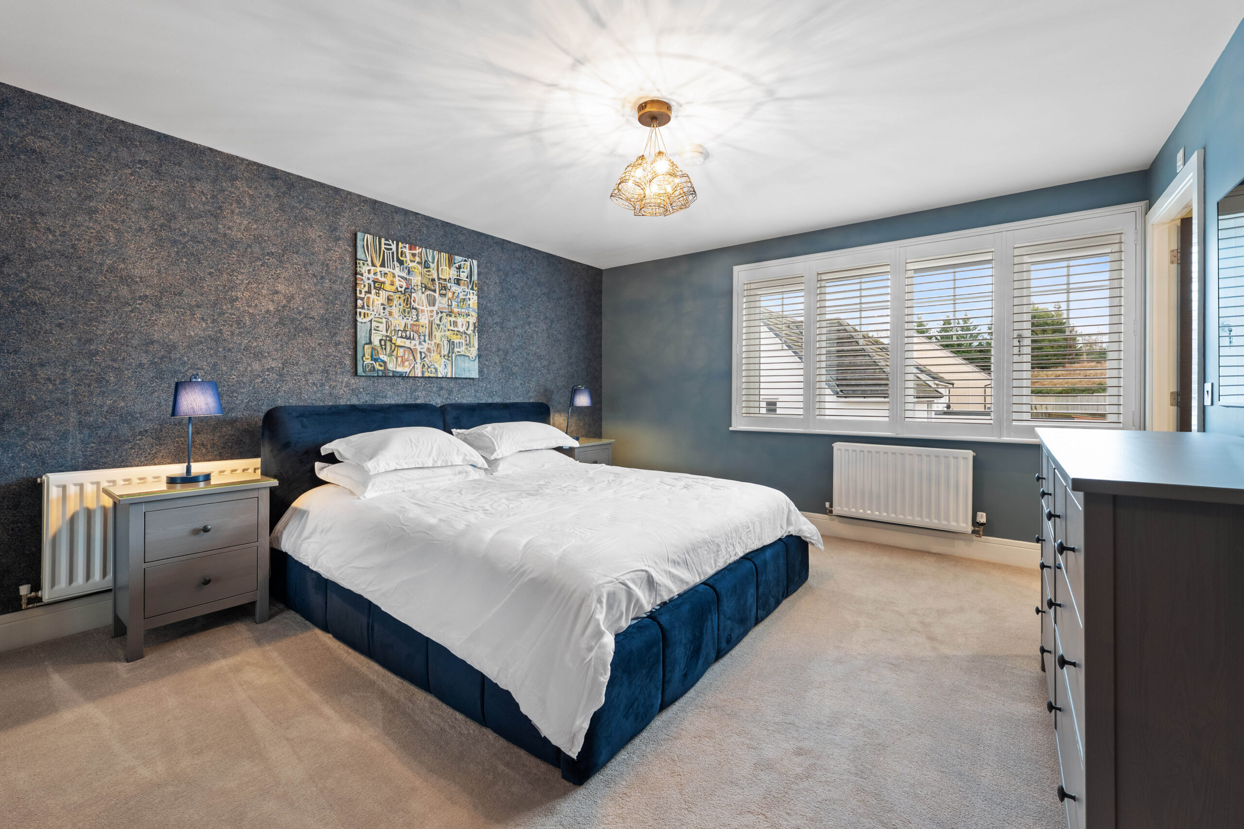 Internally, the downstairs consists of the warm and welcoming formal lounge with bay window. The high ceiling heights throughout add a sense of space and lightness. The kitchen, dining and family area is most impressive, enjoying sociable open plan living space and almost constant sunlight from the garden and views through the full height bi-fold doors. Designer kitchen with top of the range integrated appliances and ample room for a sizeable open plan dining space, large family area with media wall and focal inset wood burning fire. It is perfect for larger families looking for a true flowing open dining and socialising experience. Completing this level is a cloakroom/W.C utility room and access to the integral double garage.